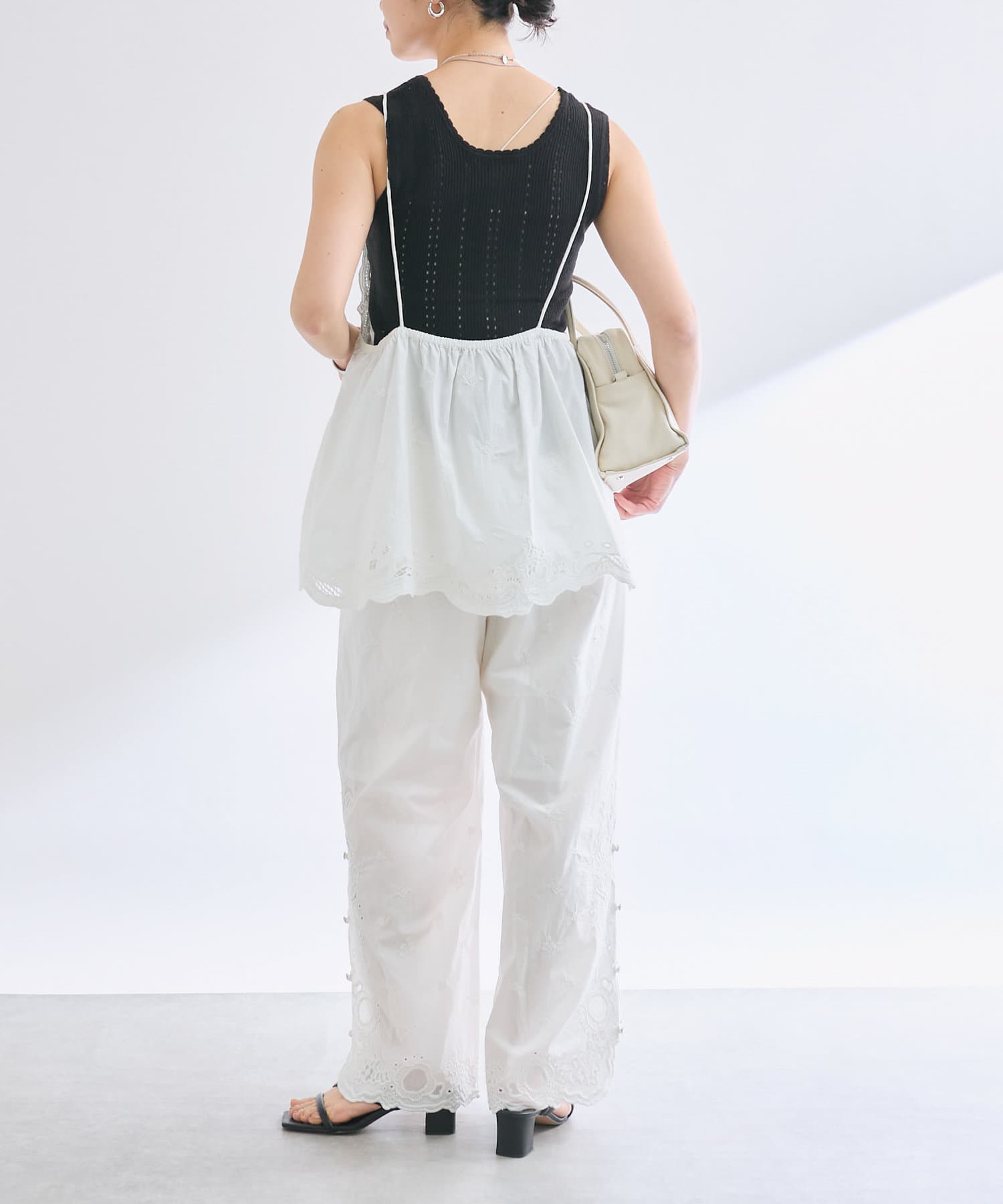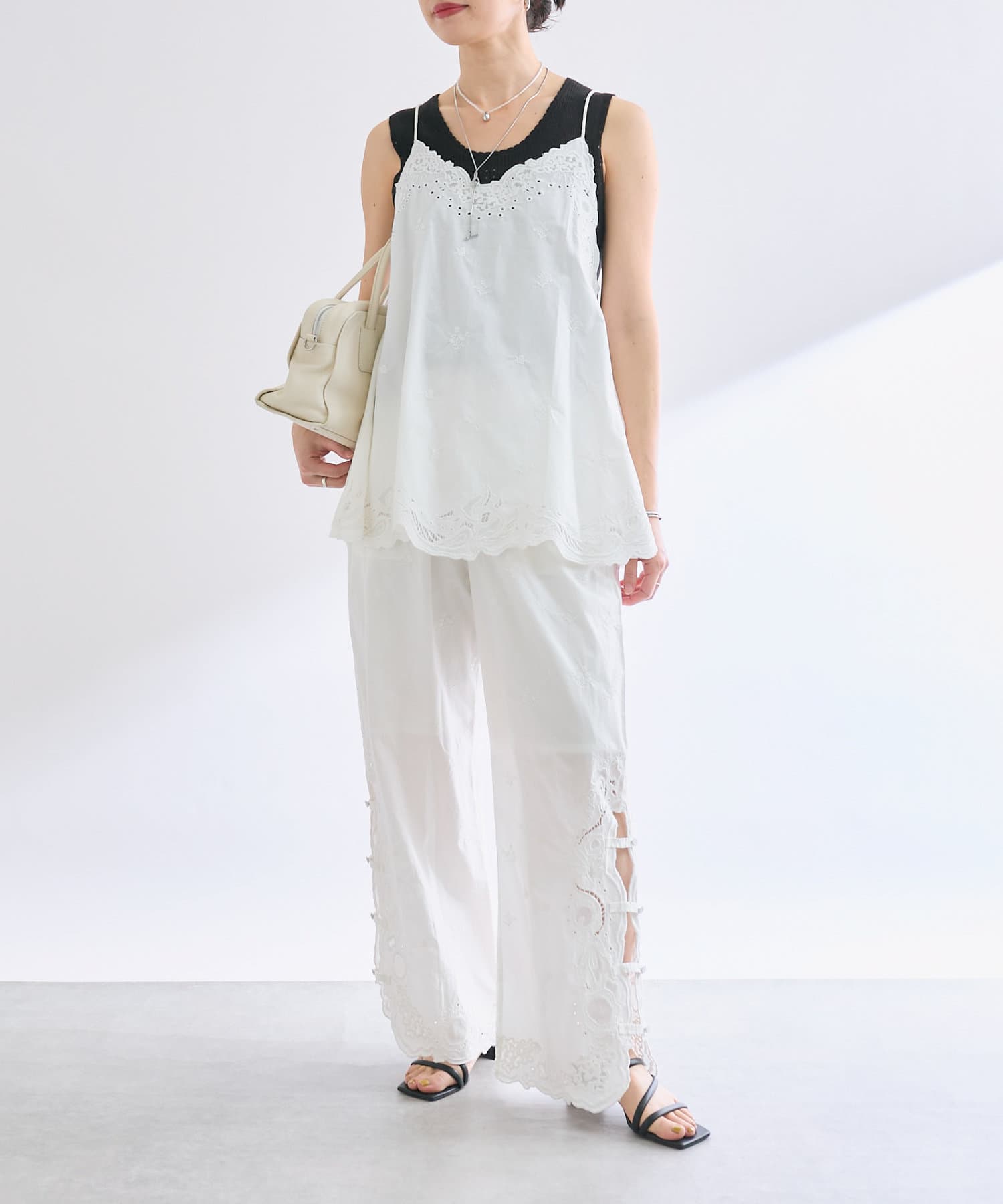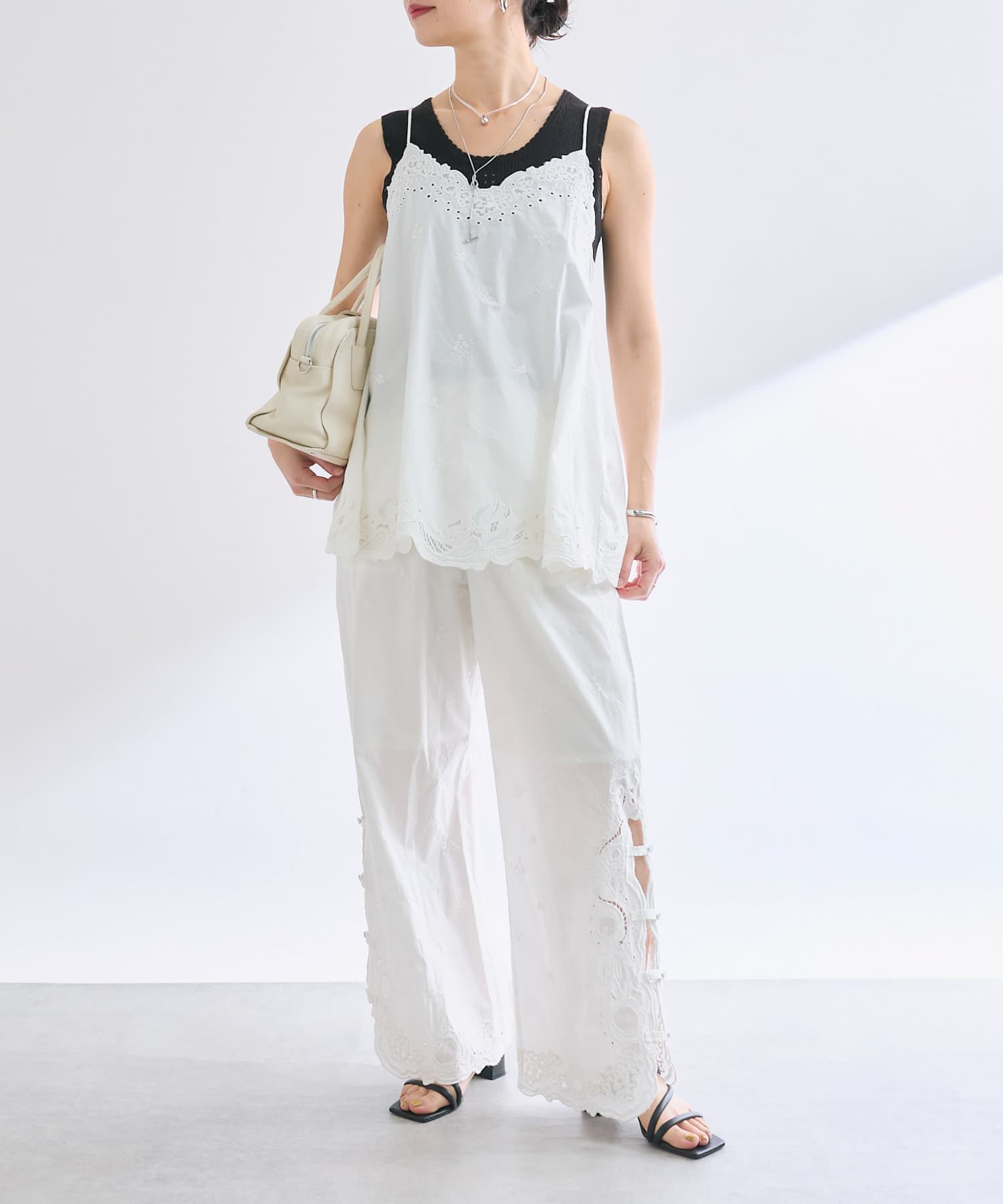 繊細なカットワーク刺繍を施したイージーパンツ。