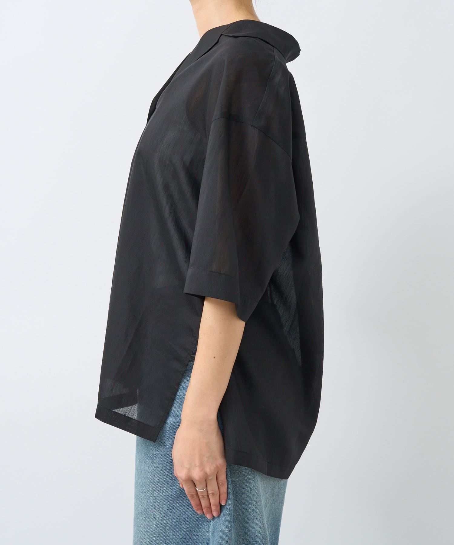 オーバーサイズのシンプルな開襟デザインのシャツ。