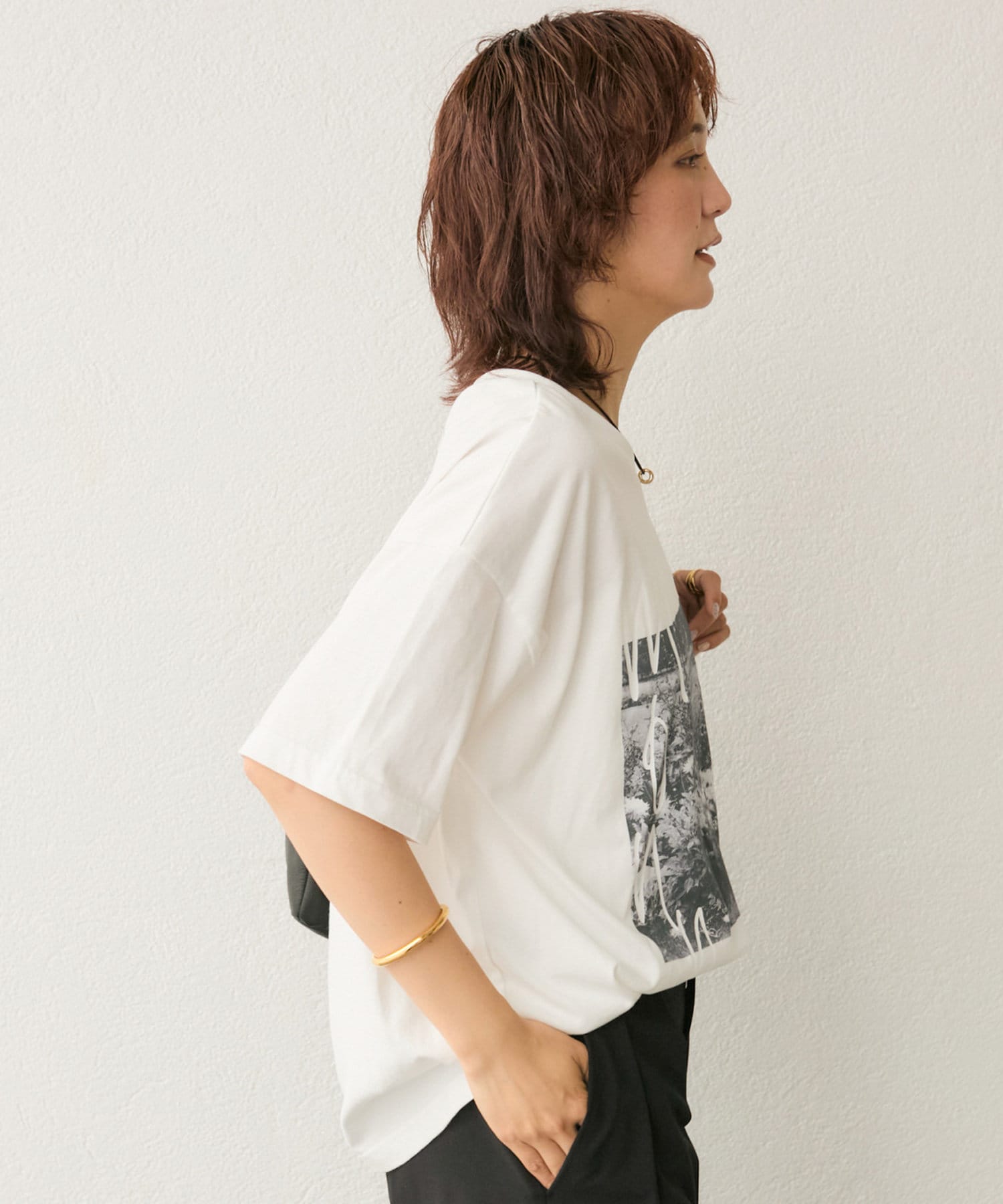 ブラックコーデがかっこよかったので、一目惚れで購入しました。ダボっと大きかったら嫌だなと思いつつ、着てみたら、程よいサイズ感でとても良かったです。身幅はゆったりしていますが、ダボっとはしていなくて、ネックも開きすぎず着やすい。袖は長めで、程よいゆとりがあり、ほっそり見えます。絶ミョー。生地も厚過ぎず、薄過ぎずで、すべてが、程よくて、さいこーのTシャツです。プリントのモノクロの感じがめちゃカッコいい。カジュアルだけど、綺麗めにも着れそう。さすがモン!さすがさなべさん!私史上一番のTシャツになりました。