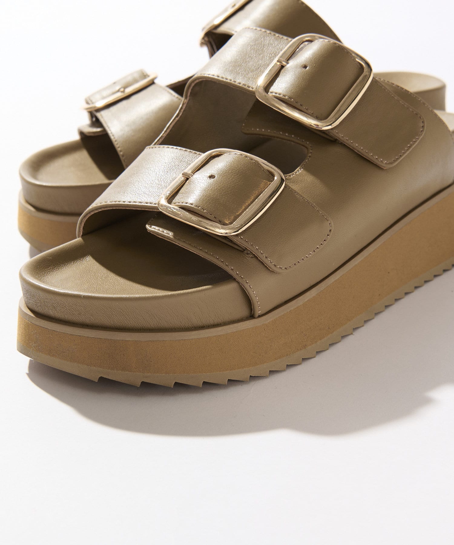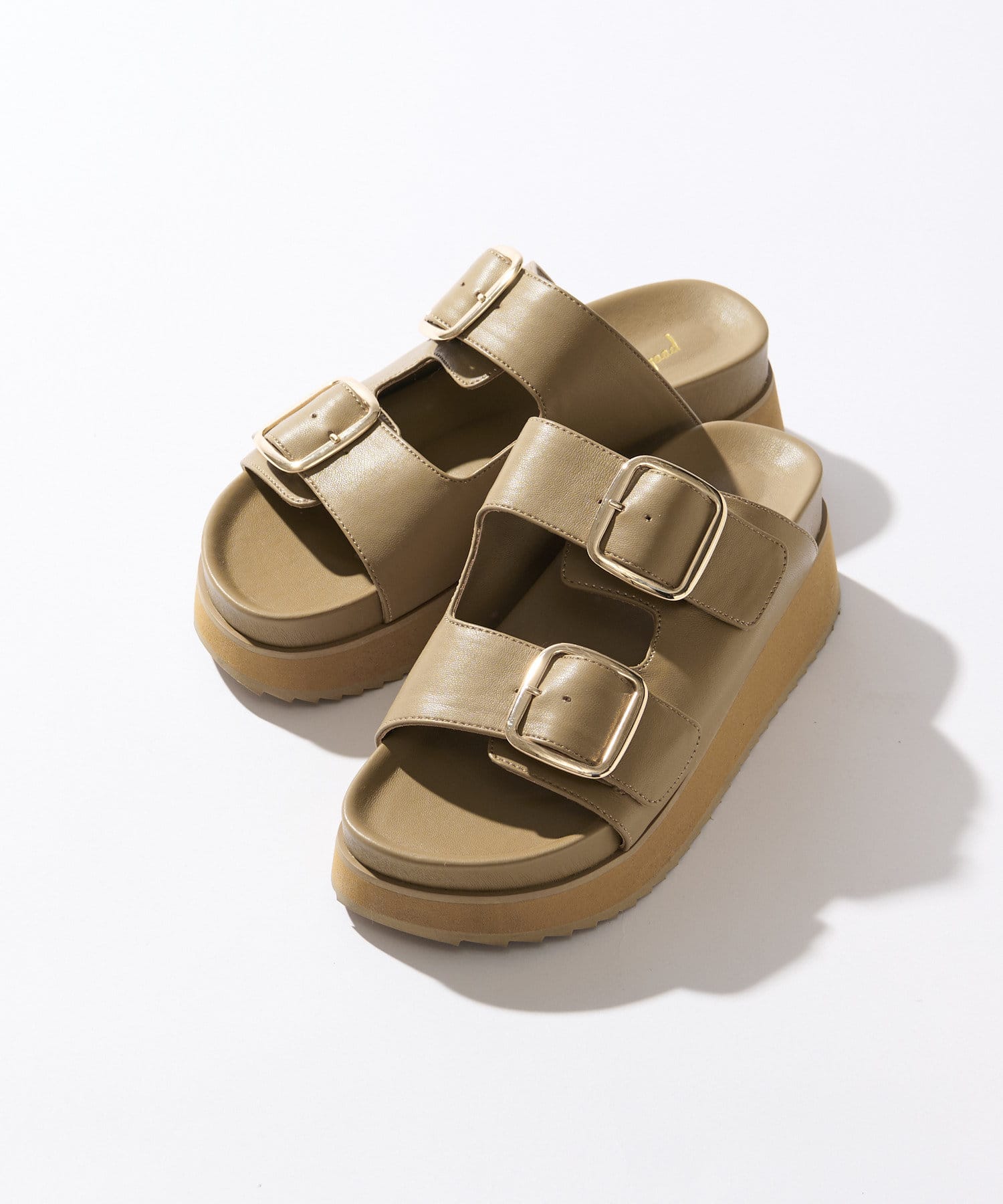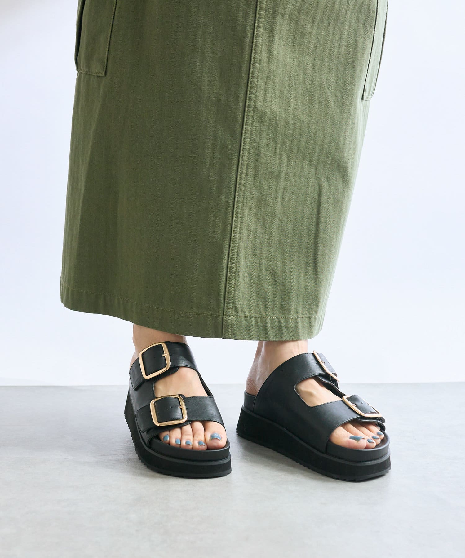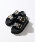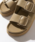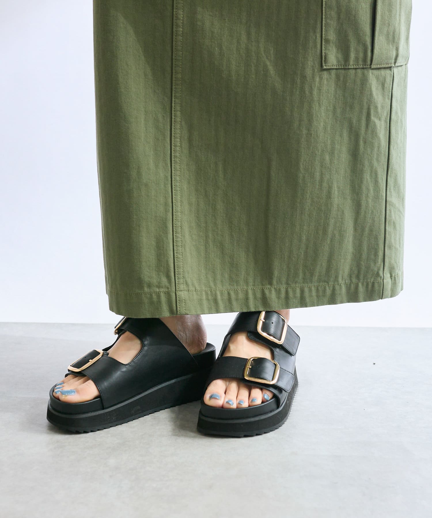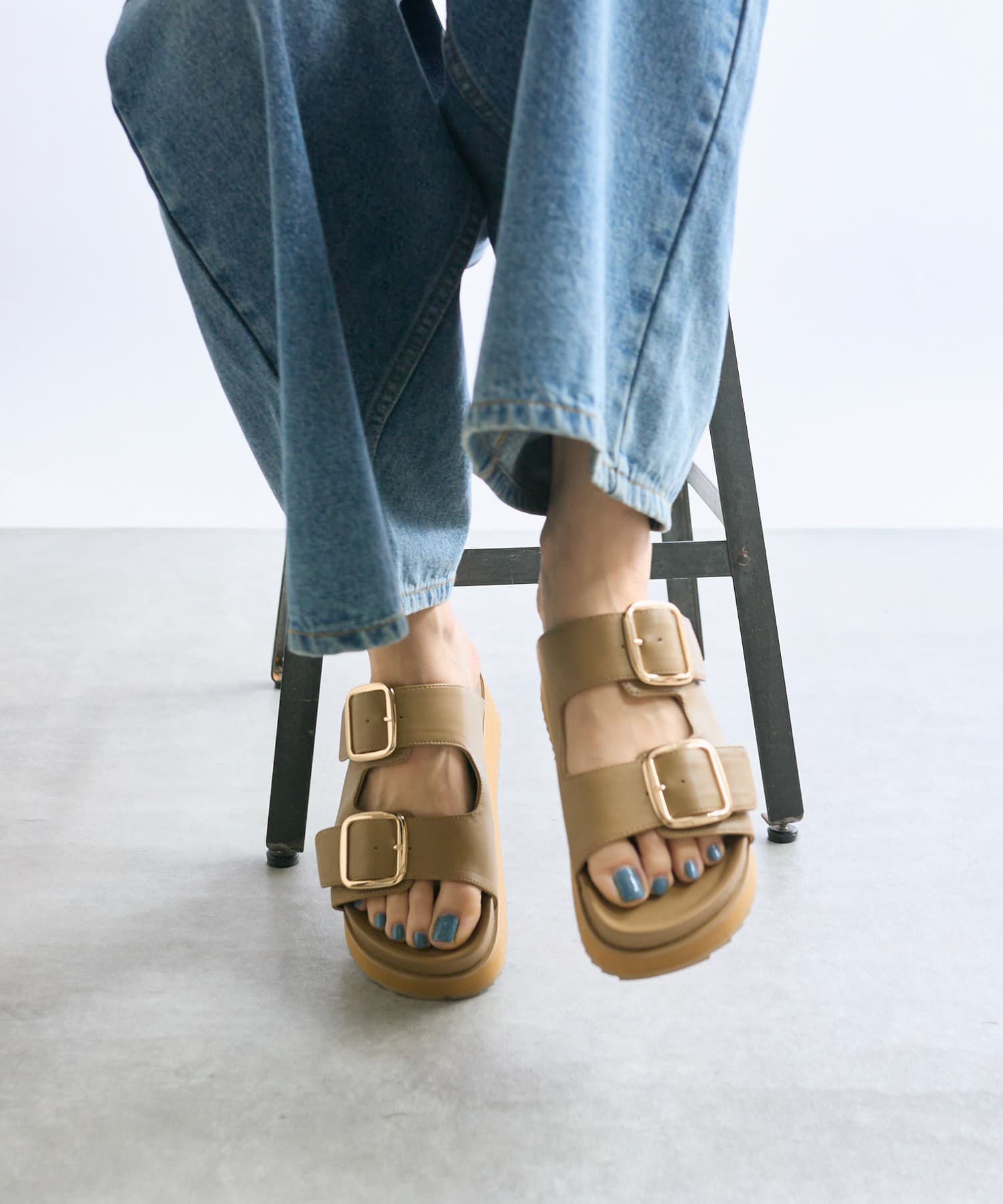 程良いボリュームの厚底ソールと、Wバックルが印象的なサンダル。