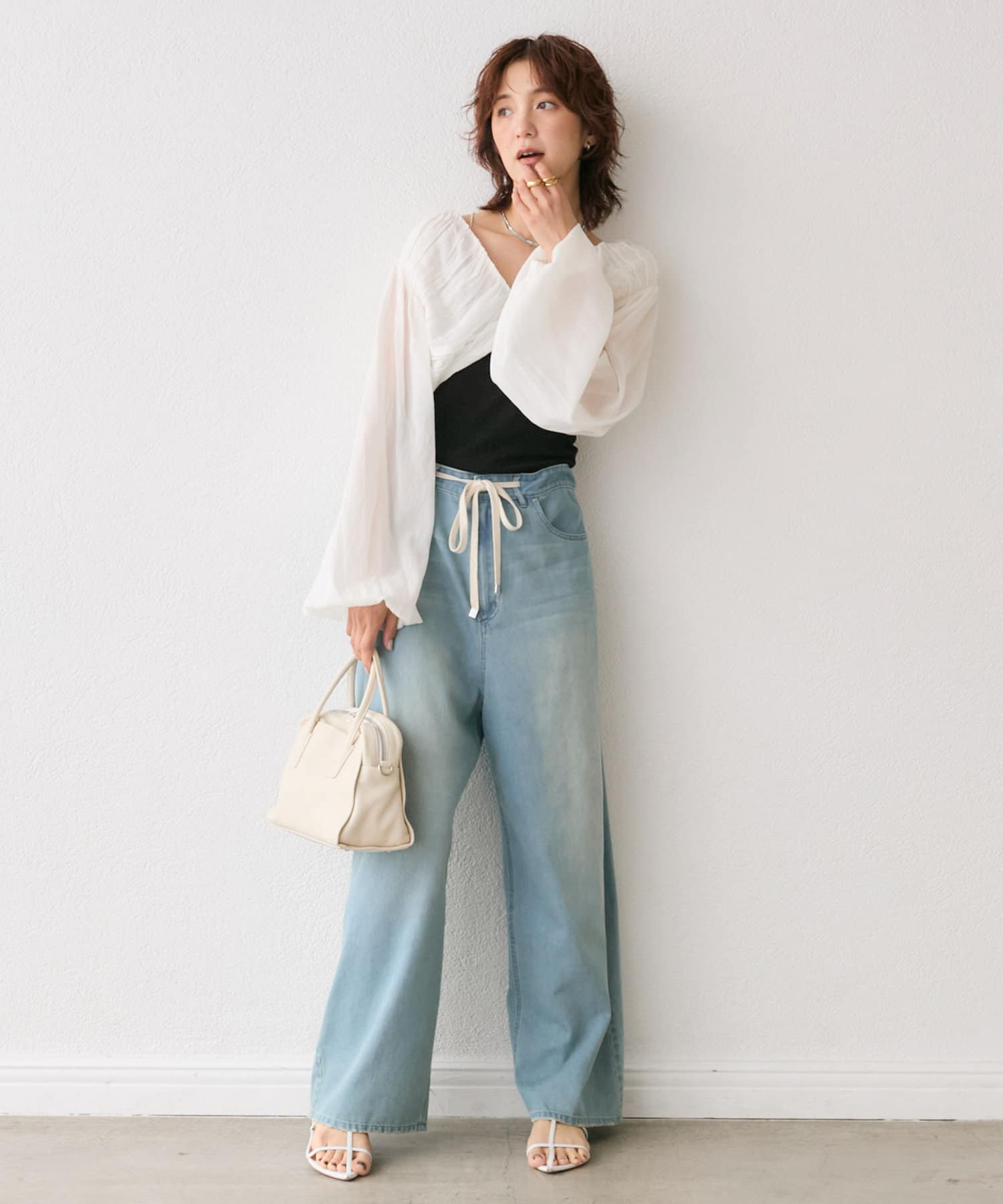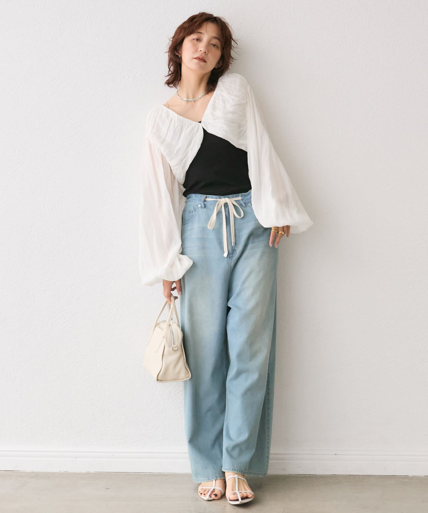 ショート丈でゆるく羽織っていただくだけで、トレンド感のあるバランスになります。