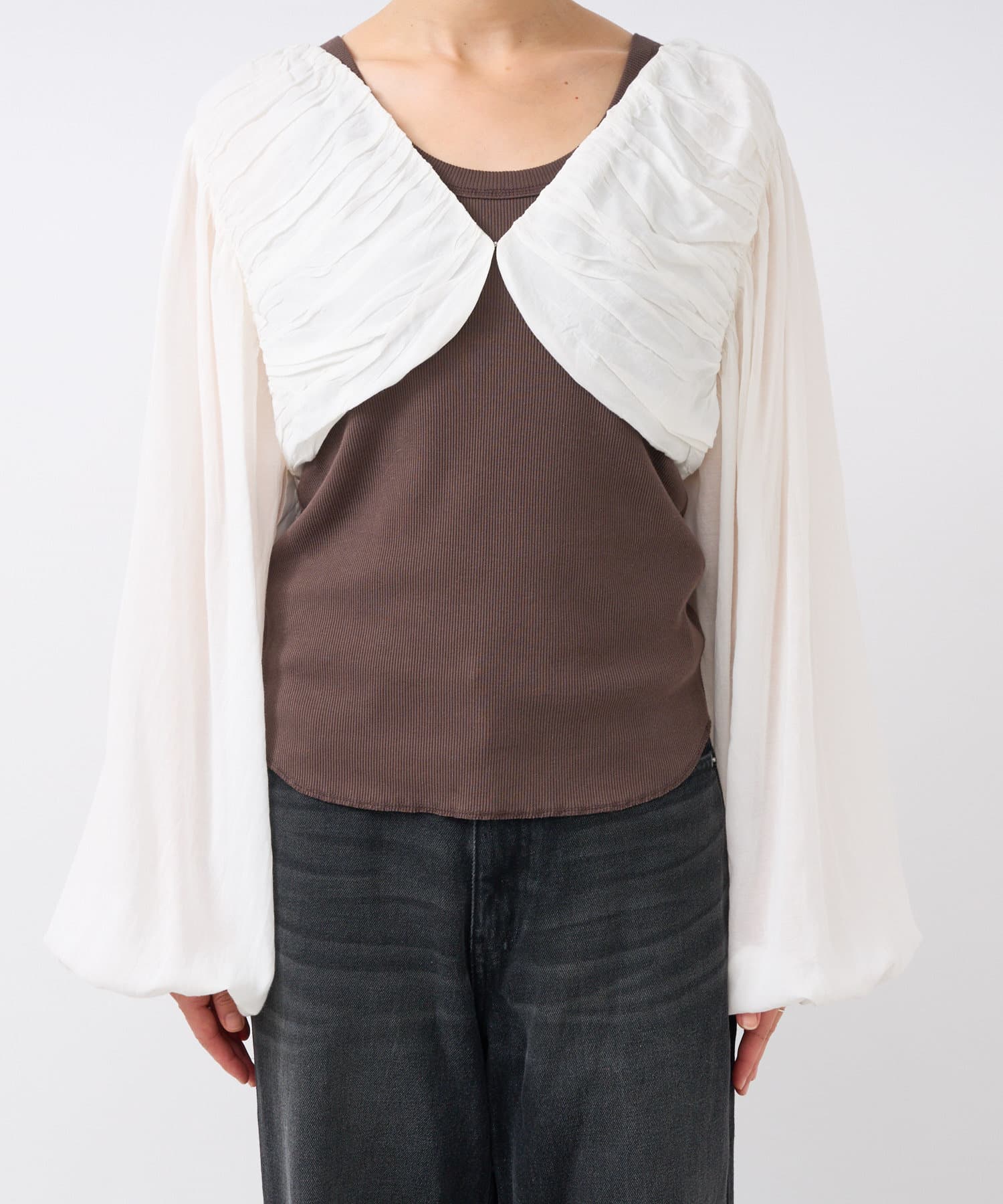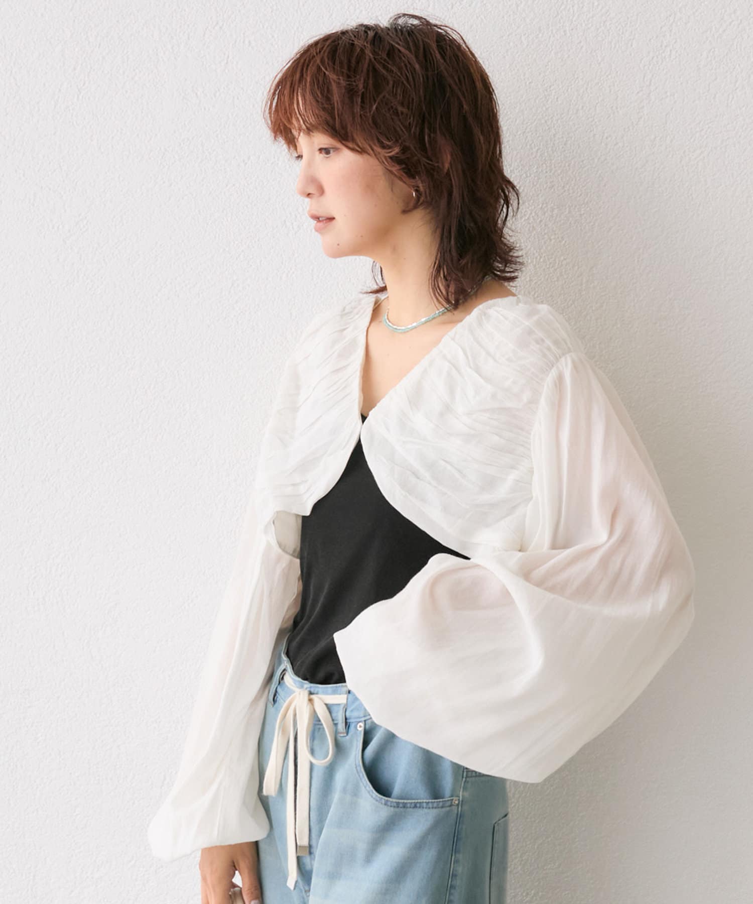 トレンド感ある着こなしが叶うギャザーボレロ