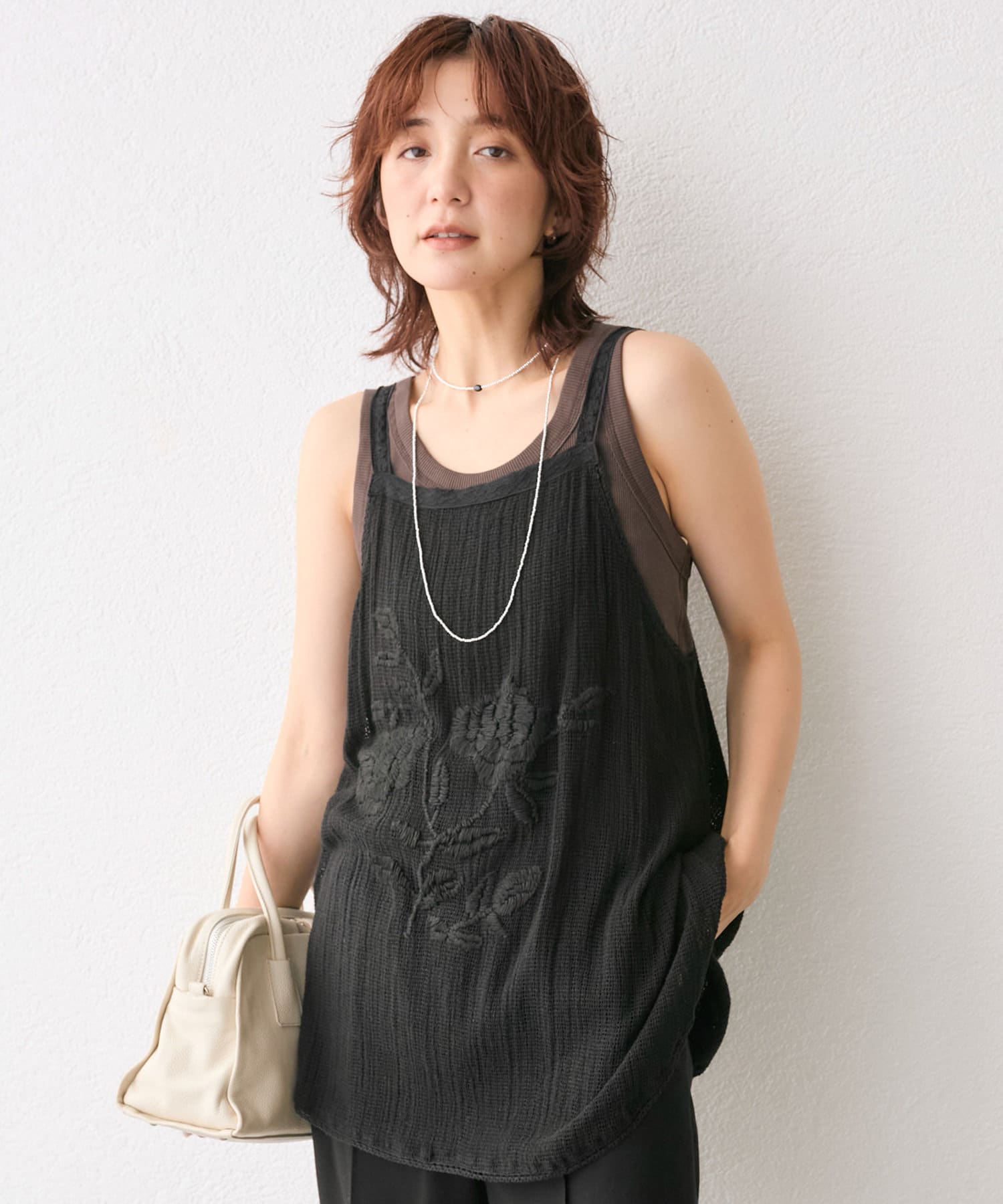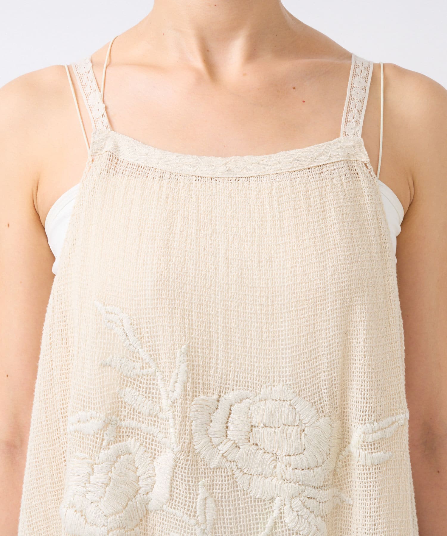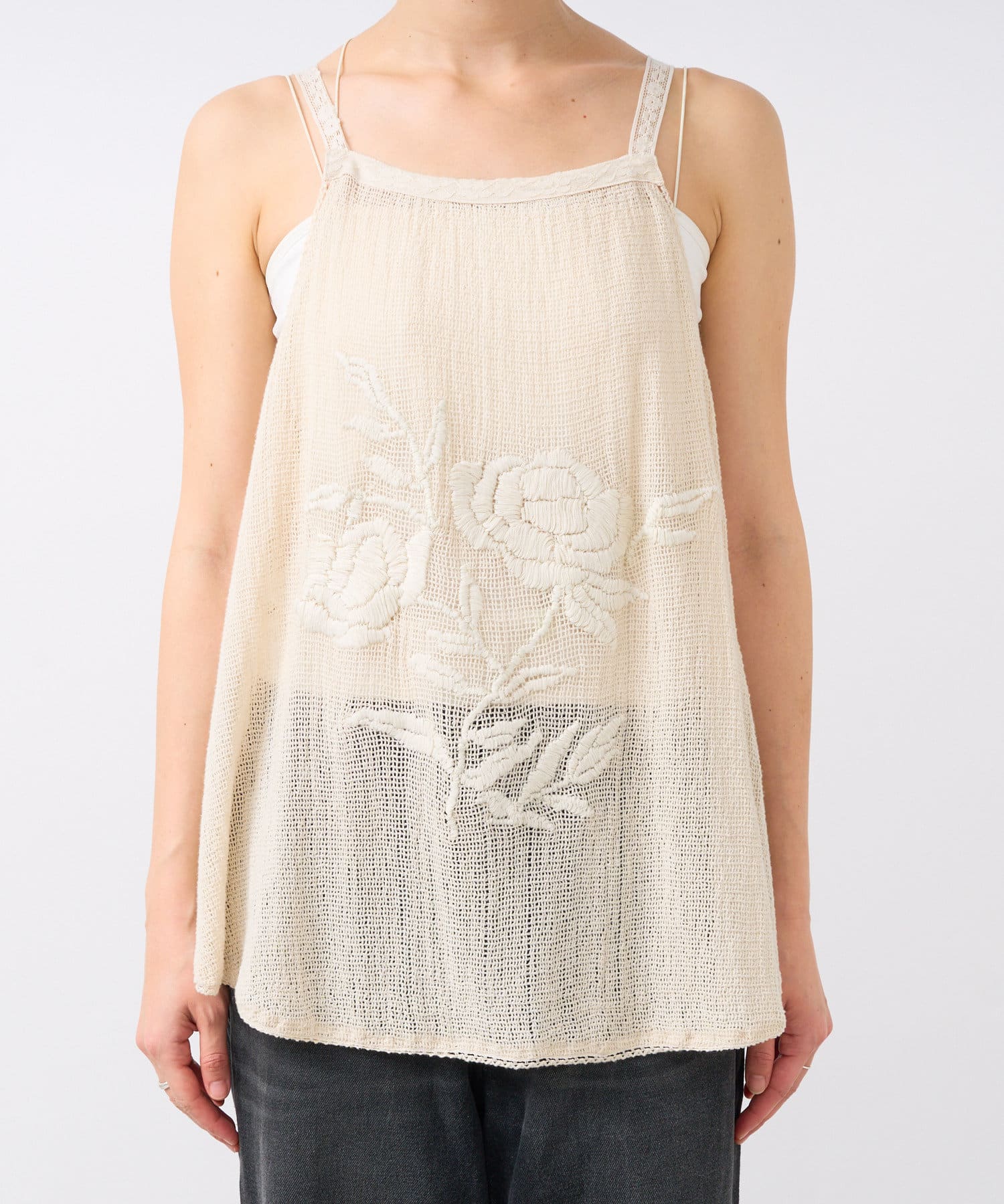 • 大きなフラワーモチーフの刺繍が目を惹くキャミソール