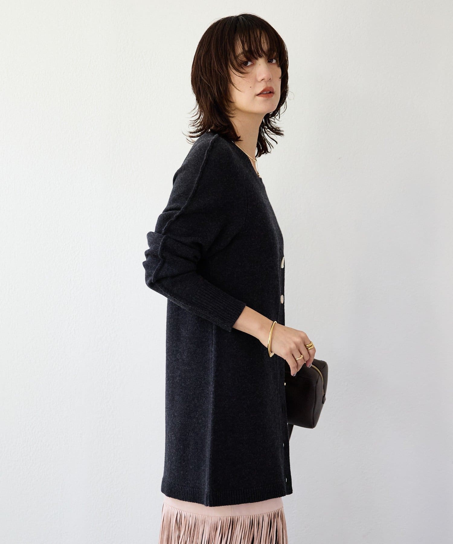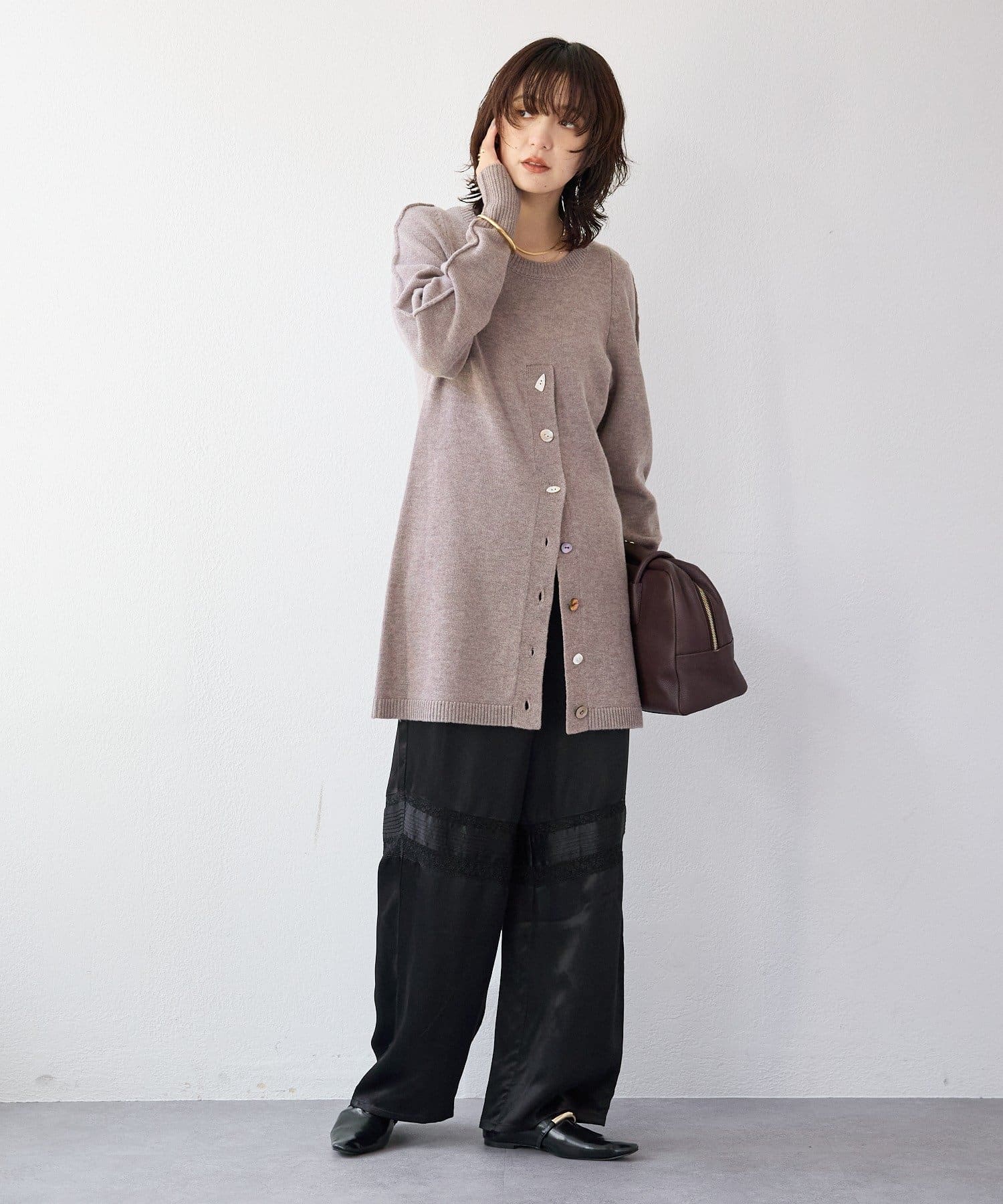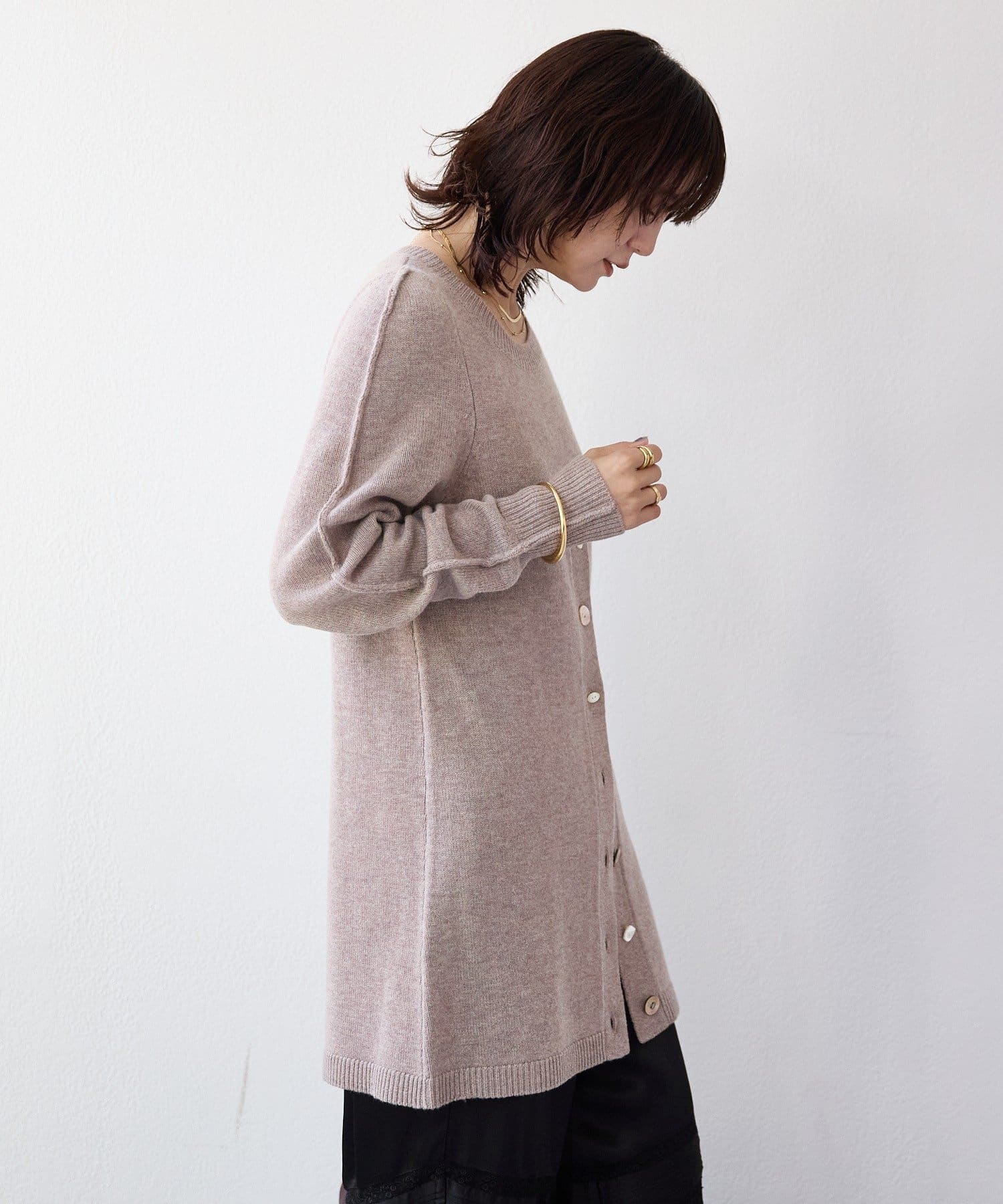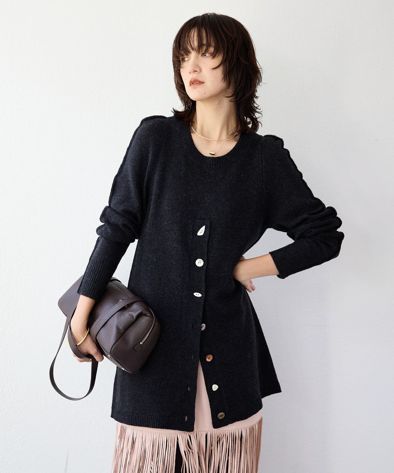 ・前スリットに、種類の違う貝ボタンをつけたディテールがクラフトムード漂うニット