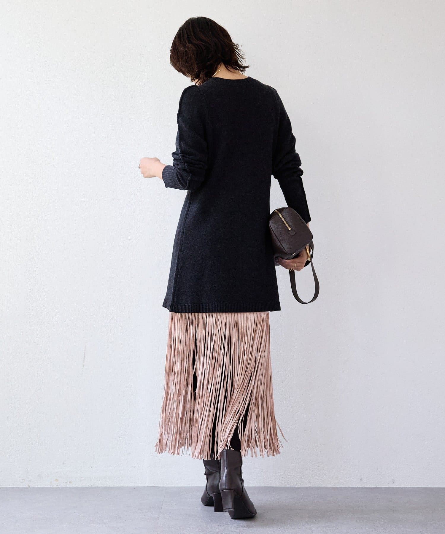 ・長めのチュニック丈ですが、前を開けていただくことで抜け感のある着こなしに