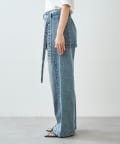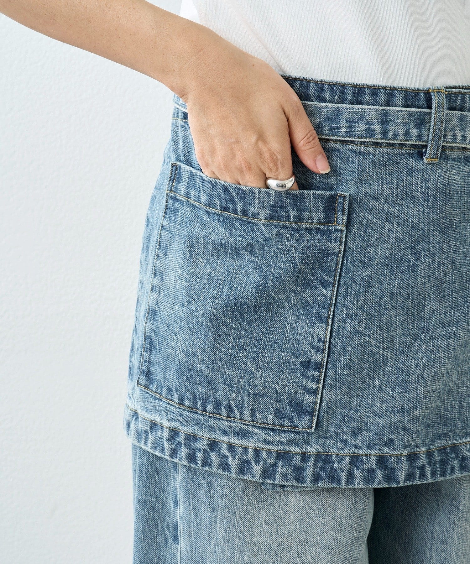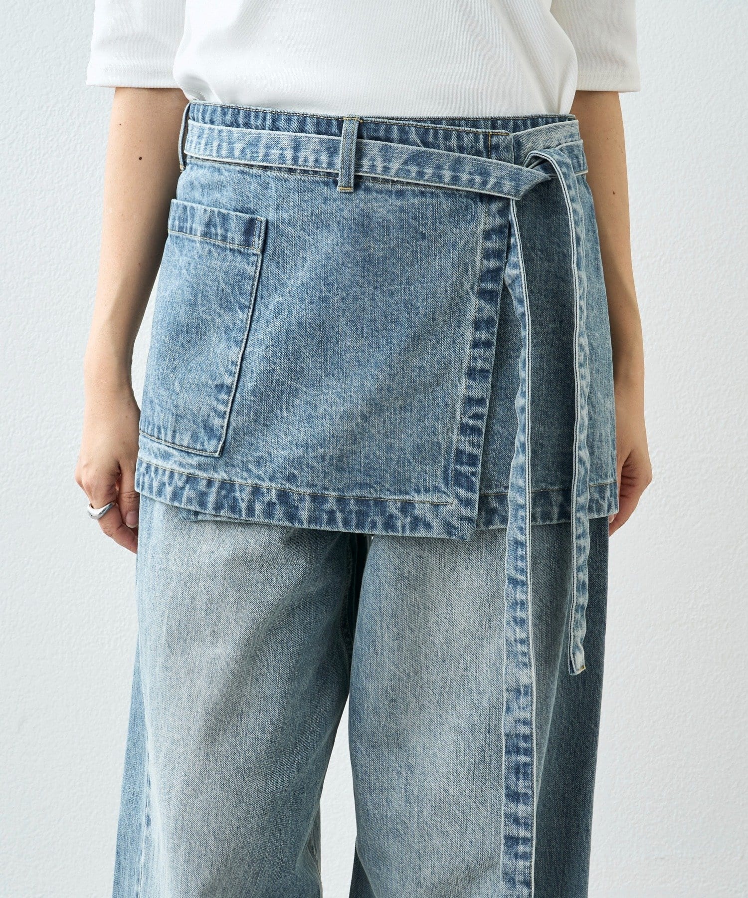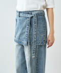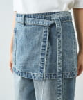 • レイヤードスタイリングが楽しめるデニム生地の腰エプロン型スカート