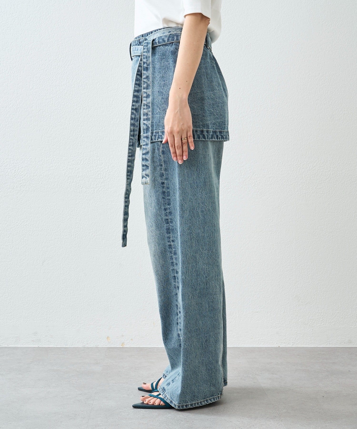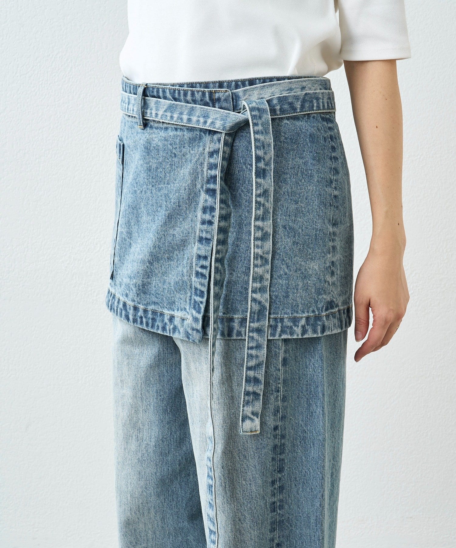・レイヤードスタイリングが楽しめるデニム生地の腰エプロン型スカート