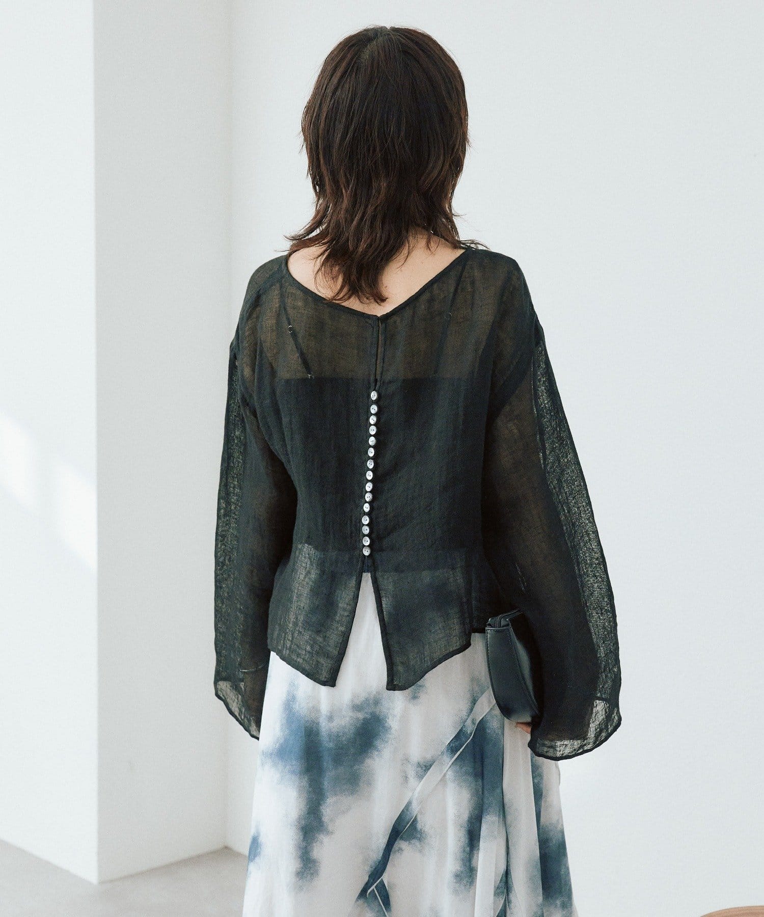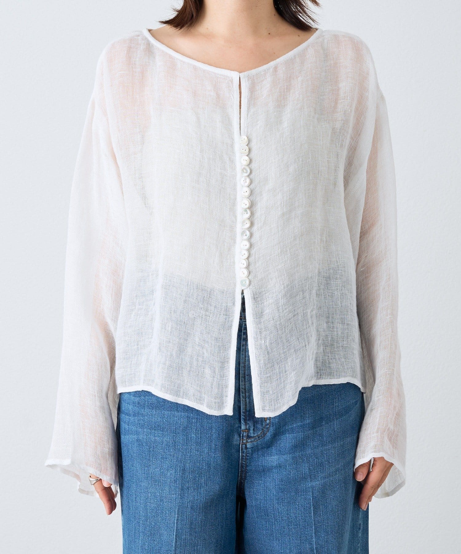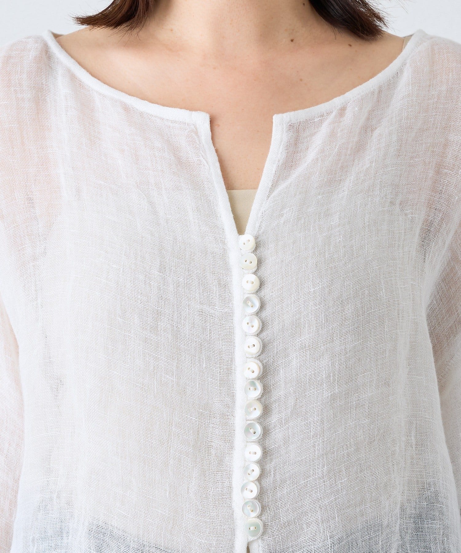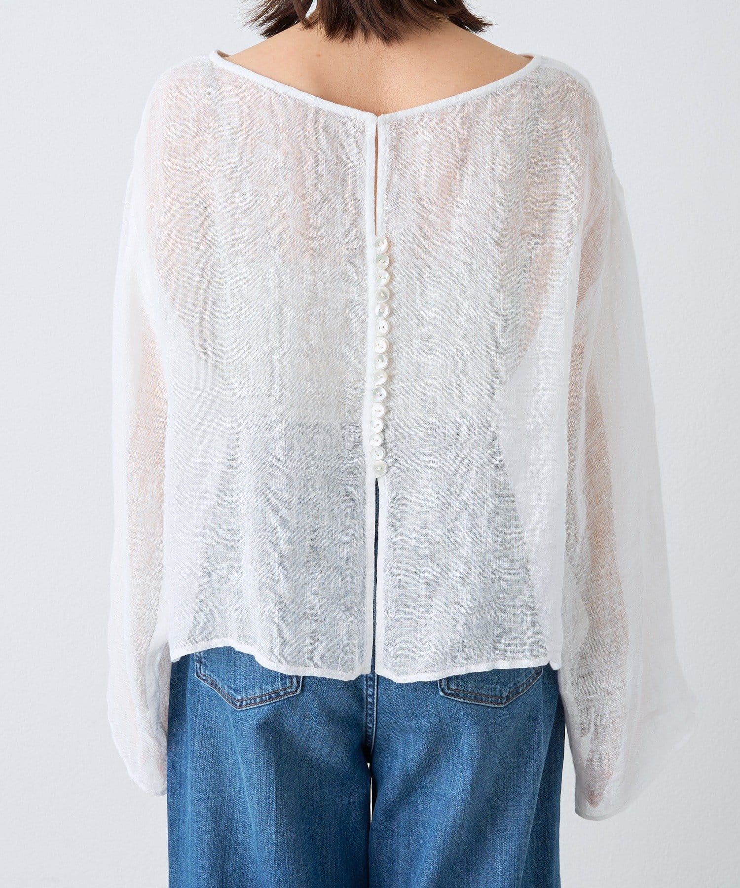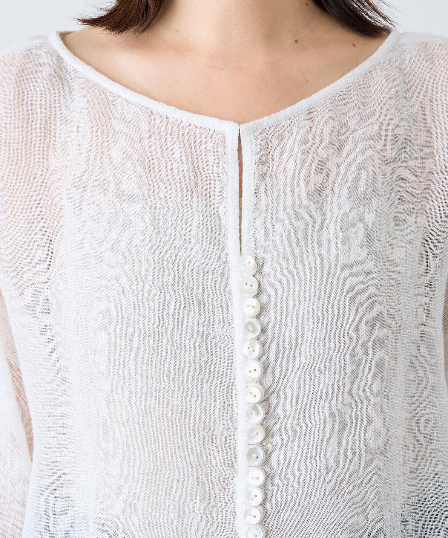 ・リネンの素材感と後ろにつけた貝ボタンのディテールがポイントのシンプルなブラウス