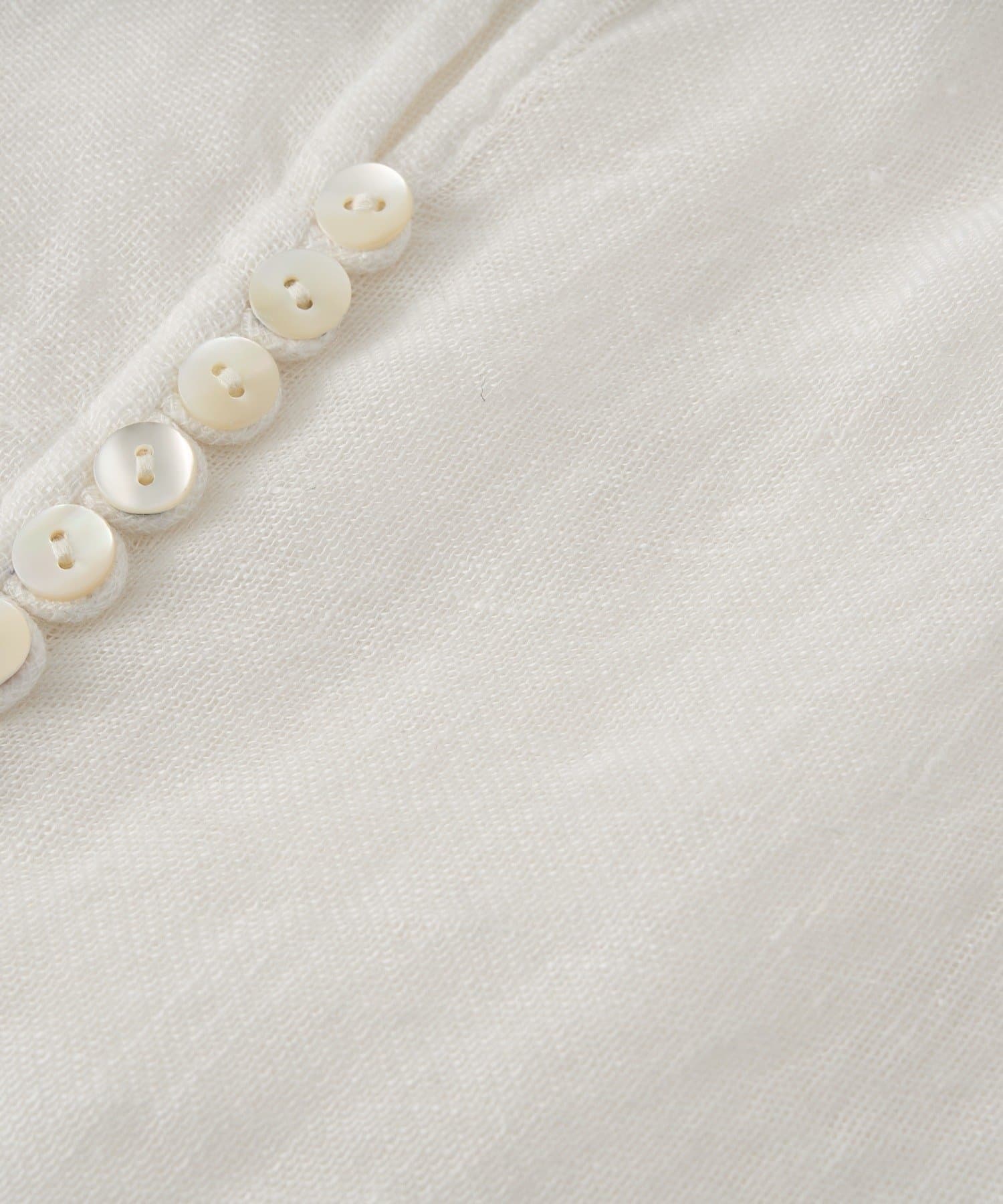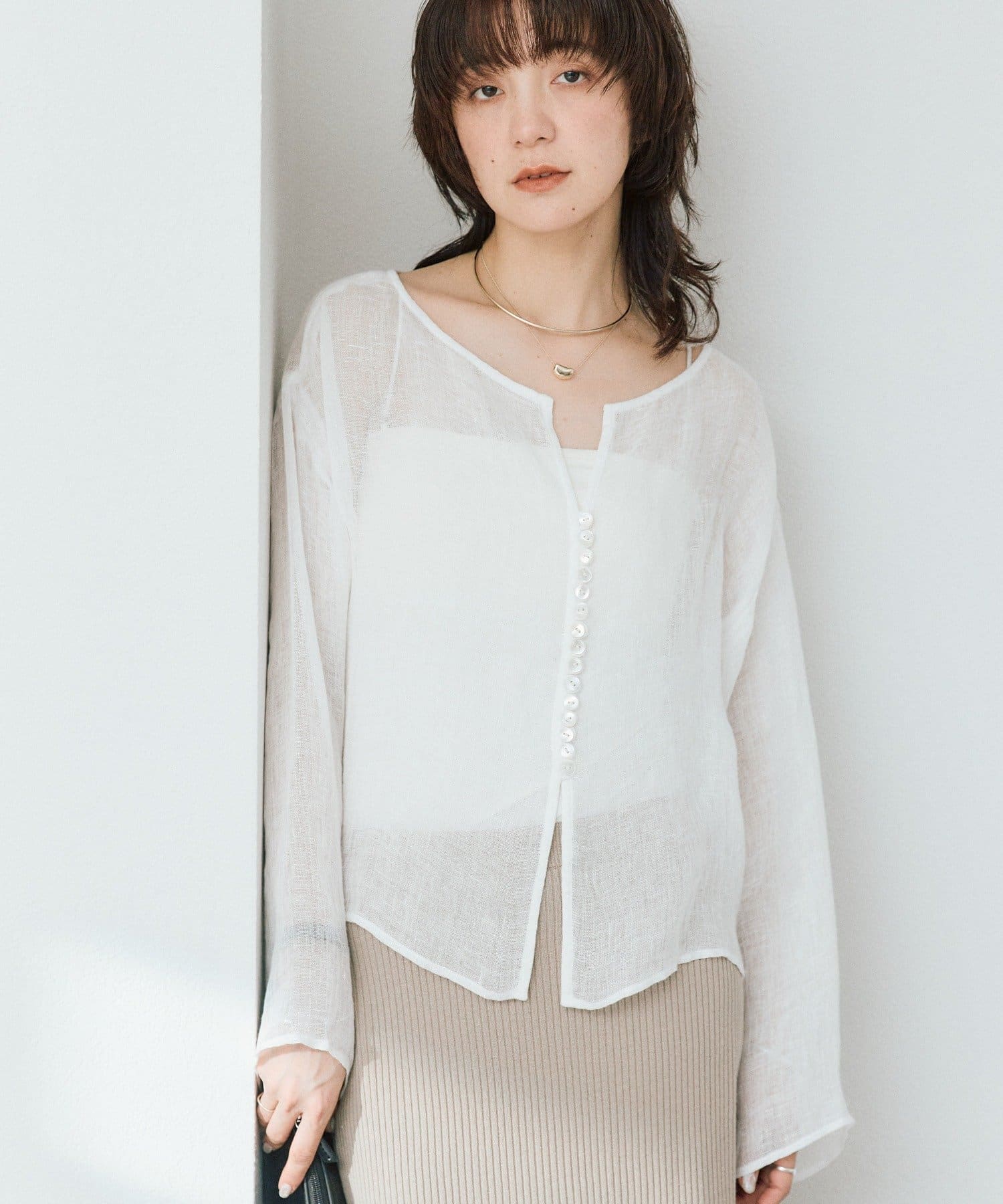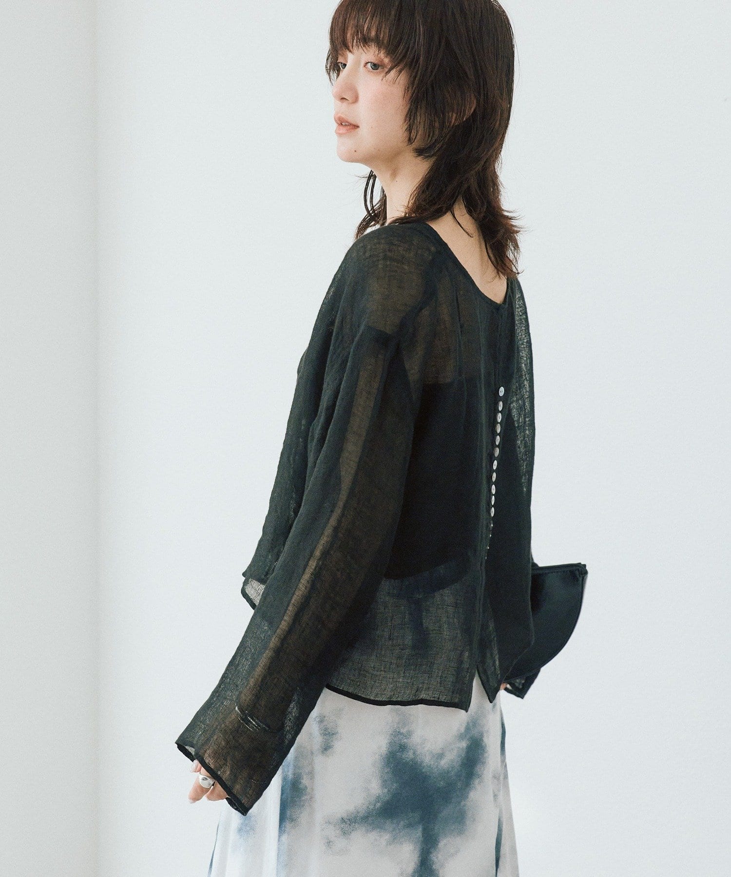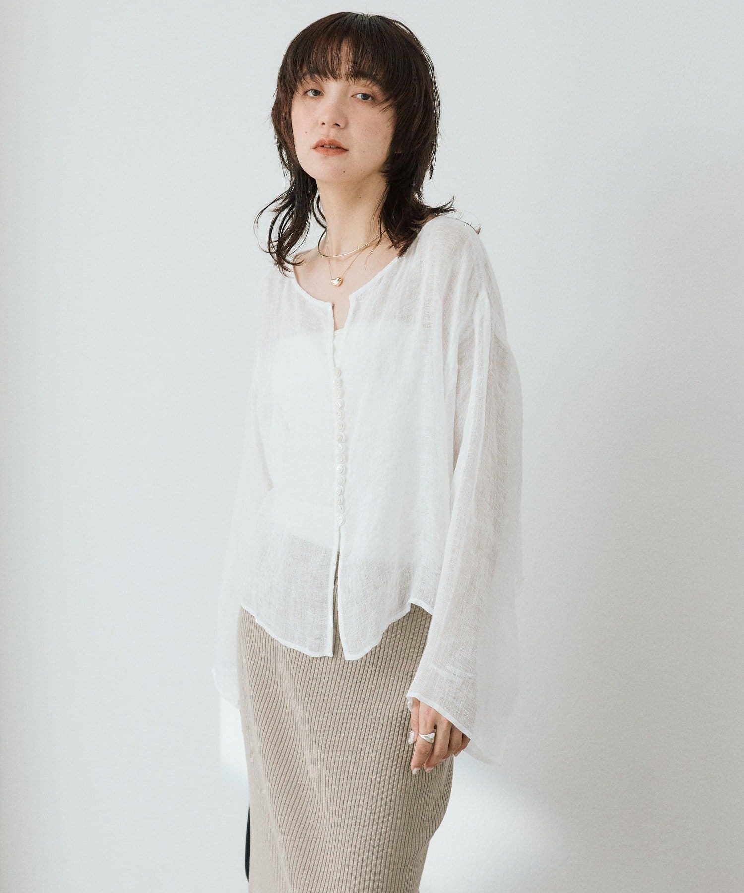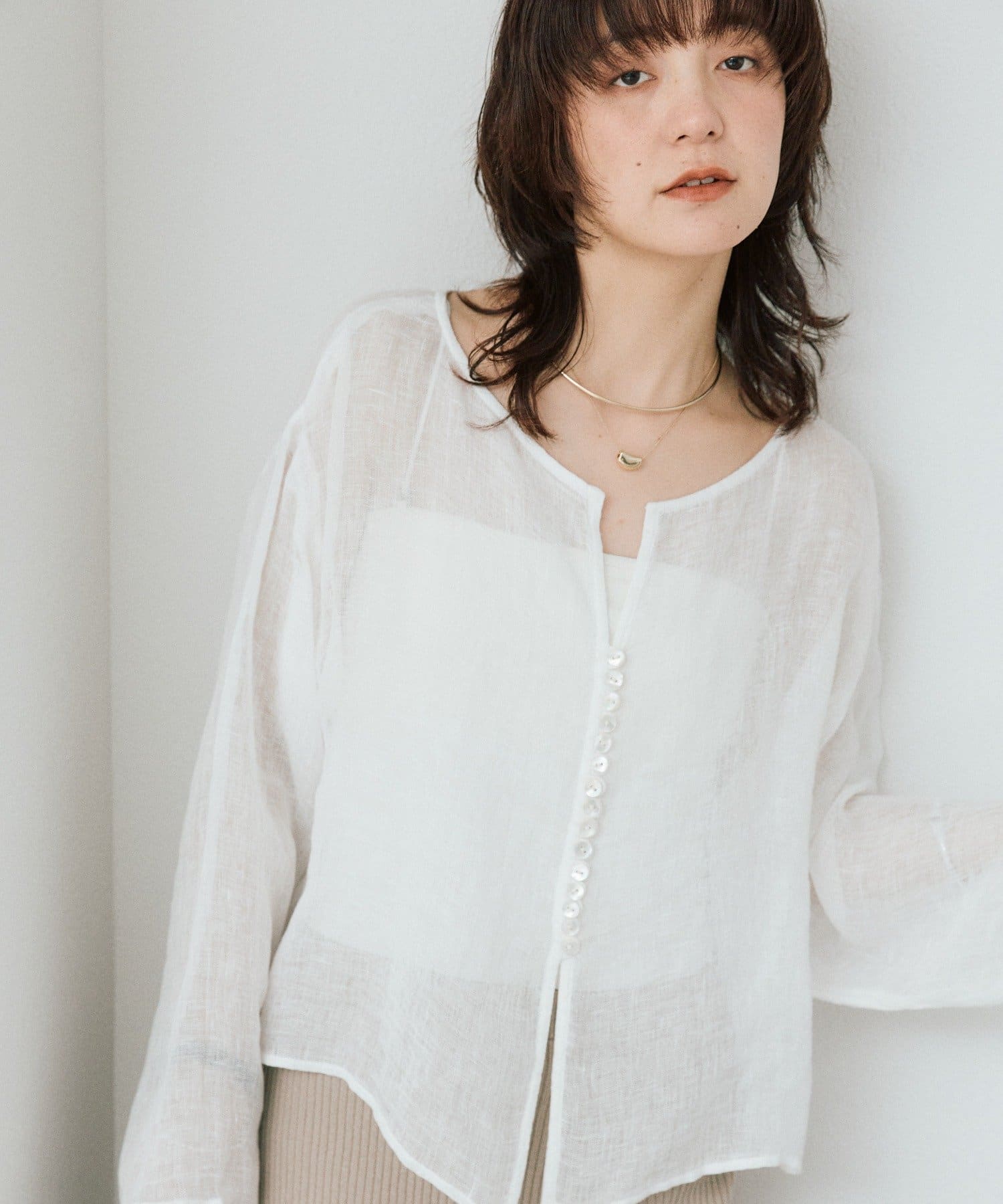 ・リネンの素材感と後ろにつけた貝ボタンのディテールがポイントのシンプルなブラウス