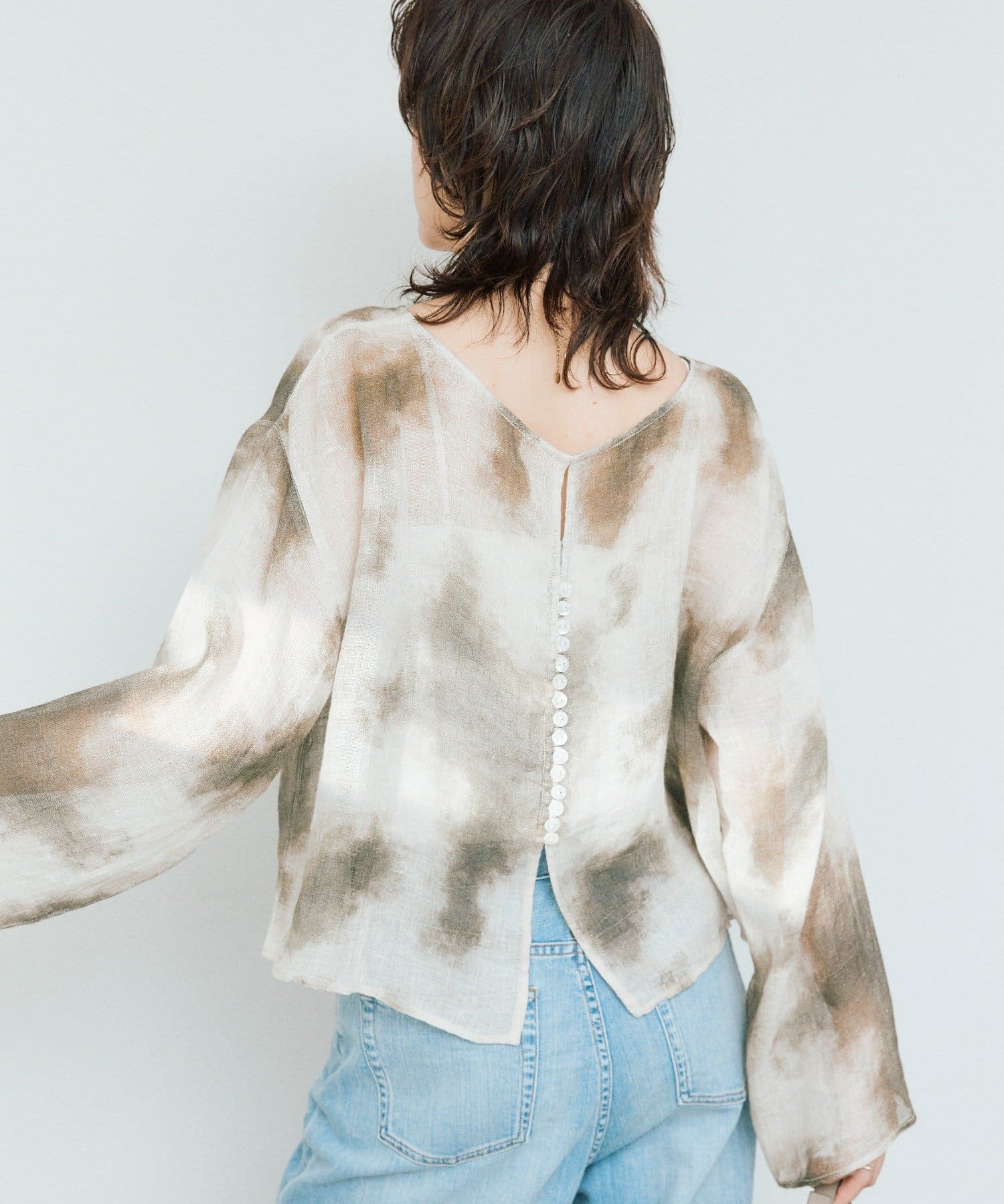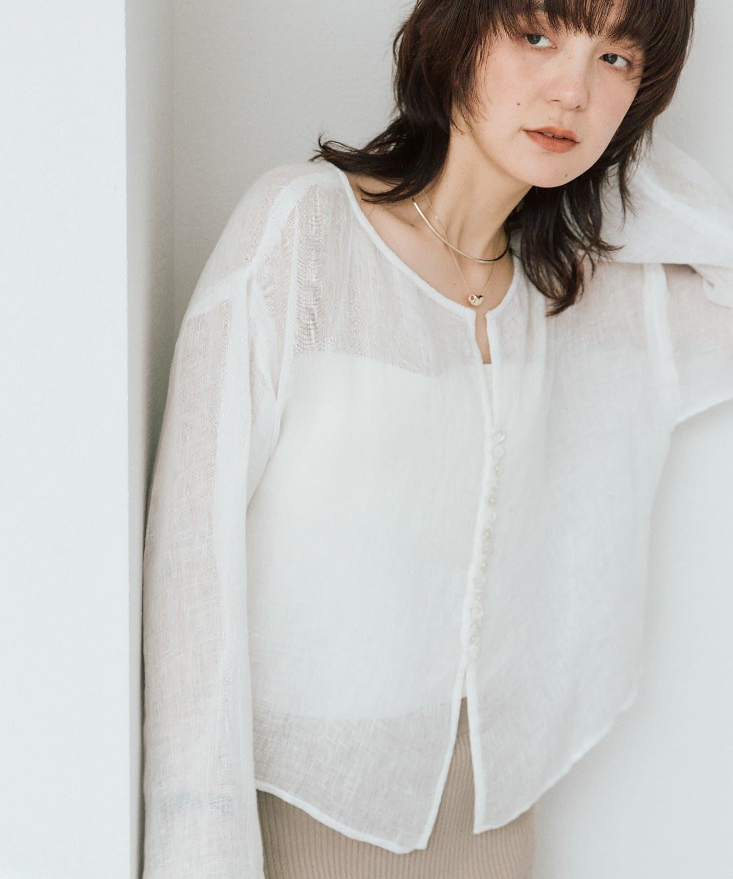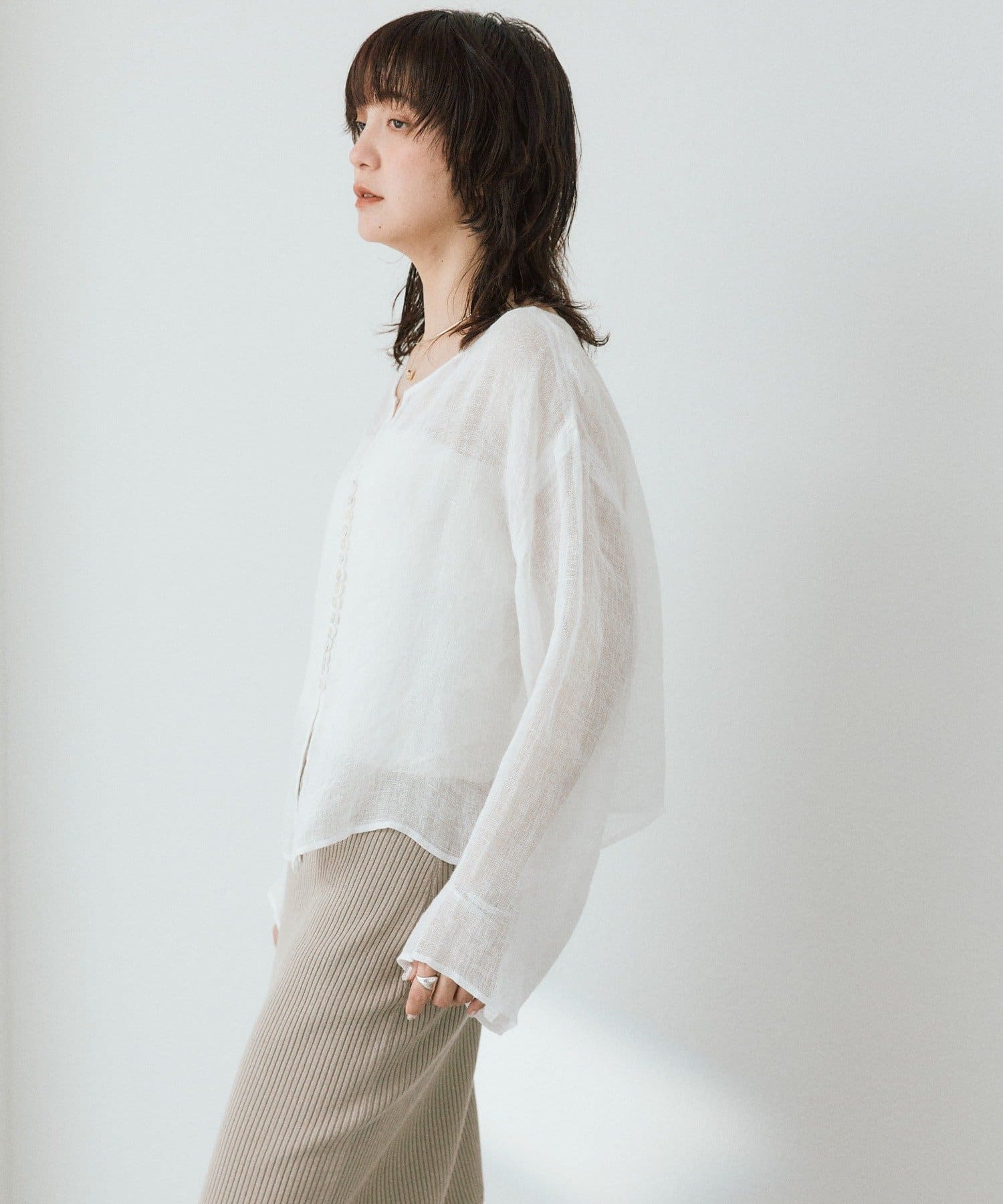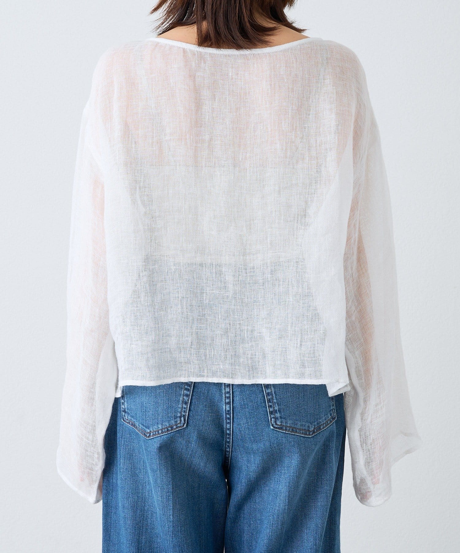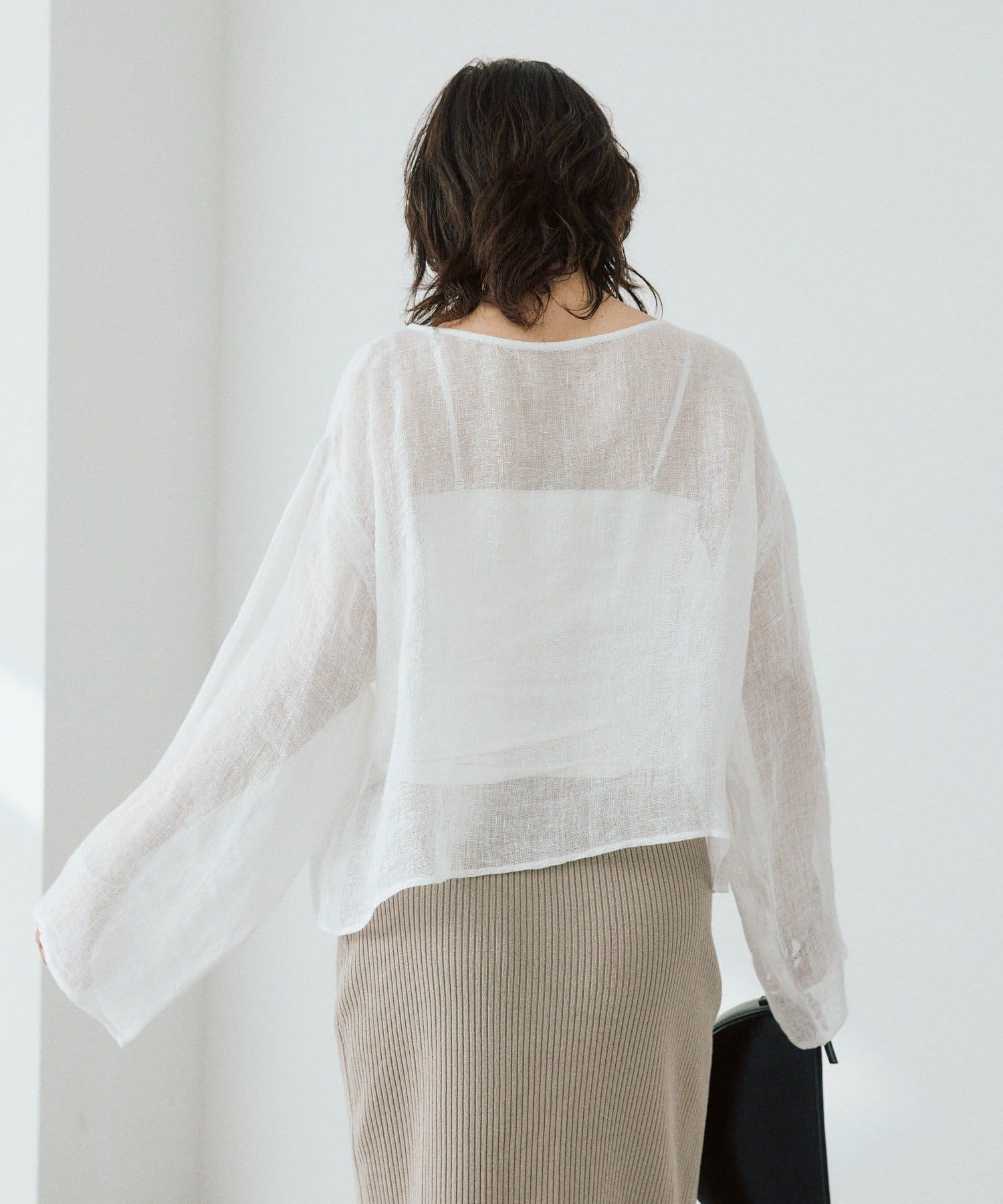 ・リネンの素材感と後ろにつけた貝ボタンのディテールがポイントのシンプルなブラウス