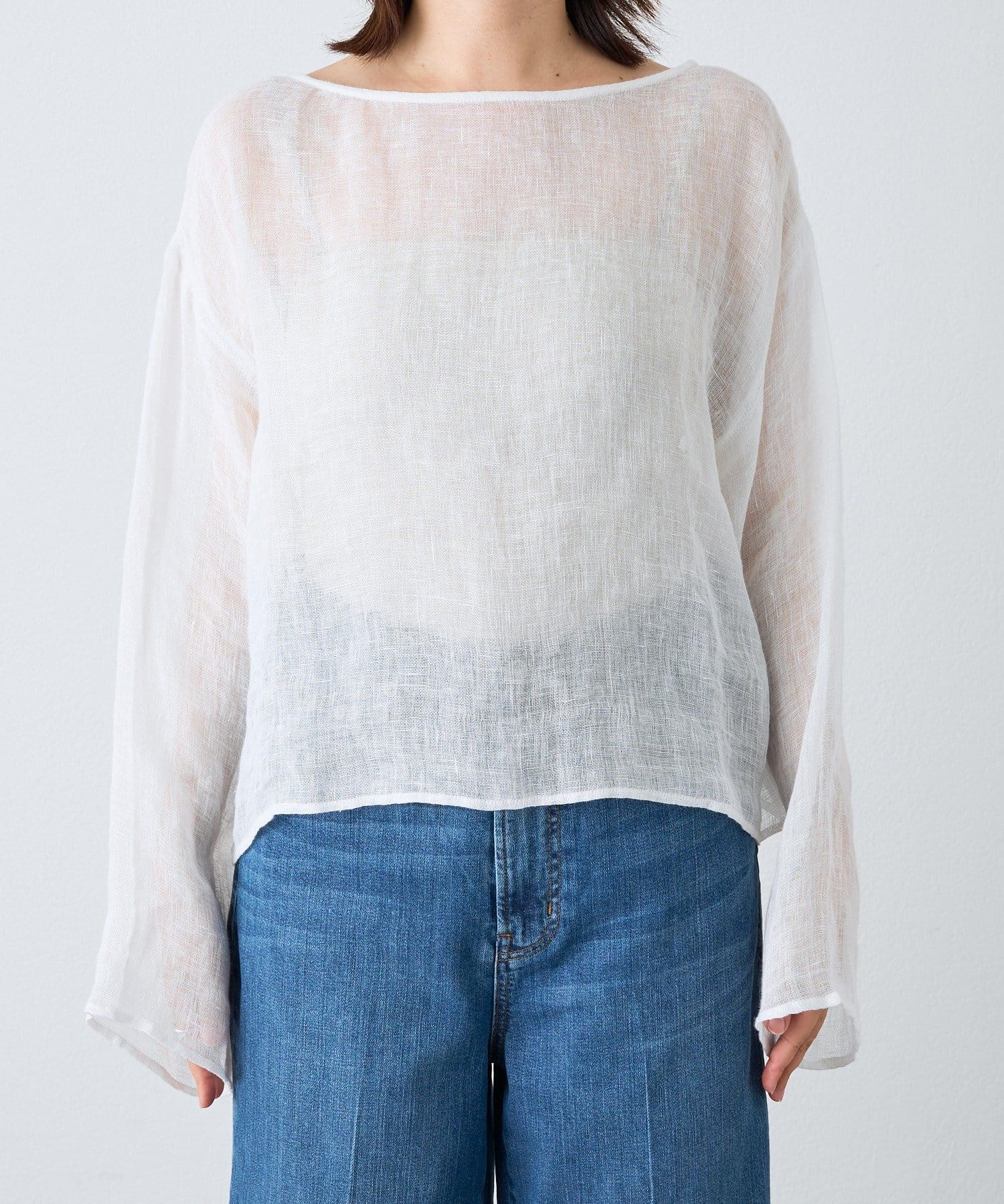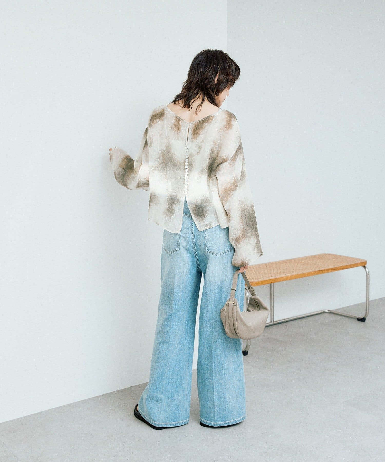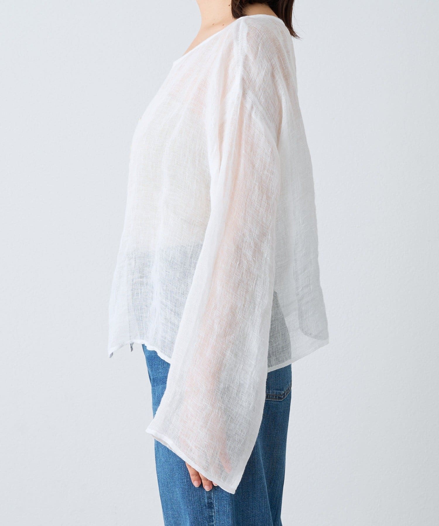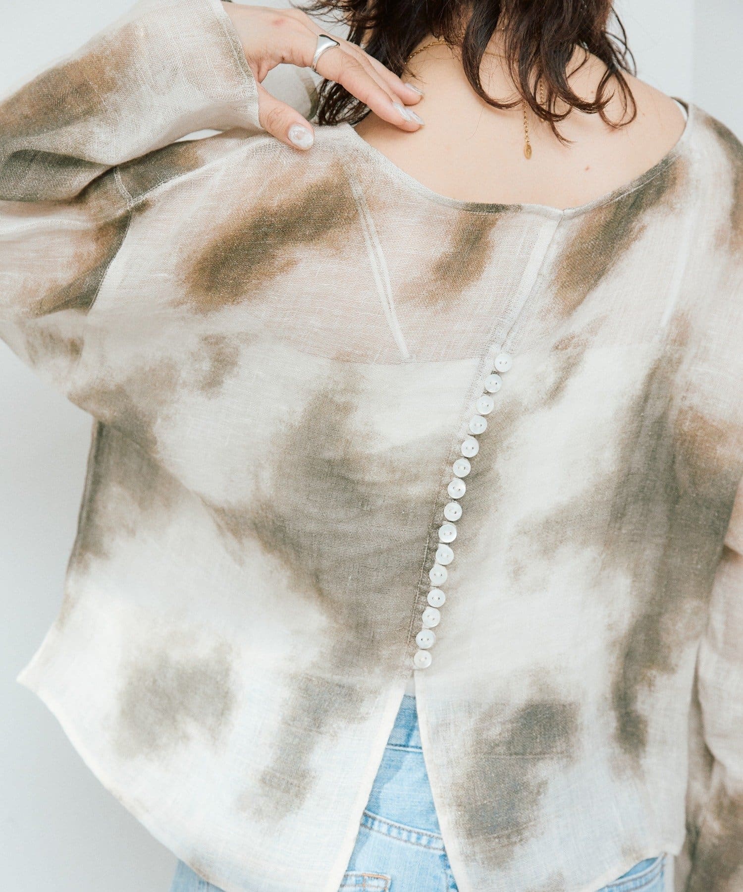 ・リネンの素材感と後ろにつけた貝ボタンのディテールがポイントのシンプルなブラウス