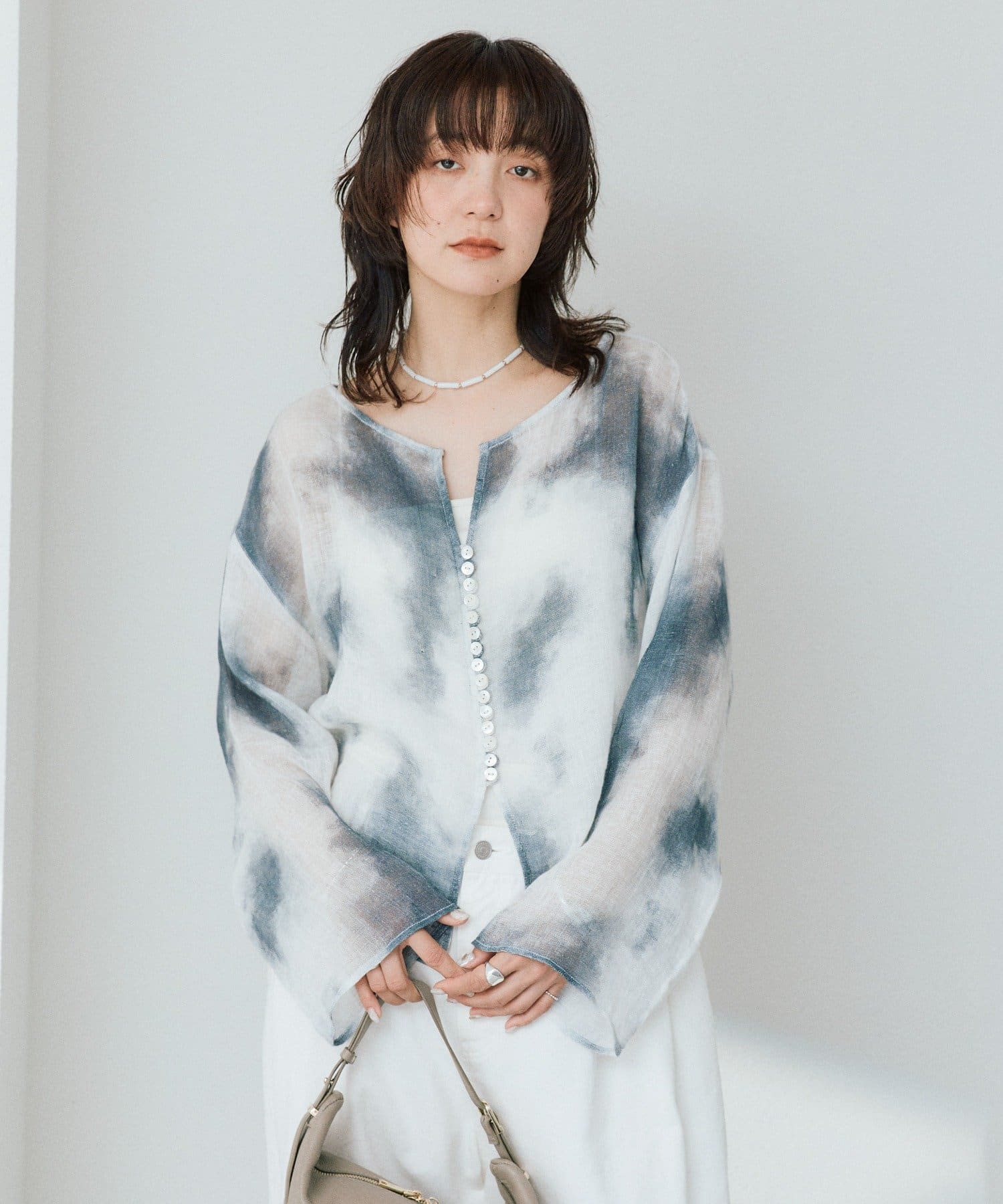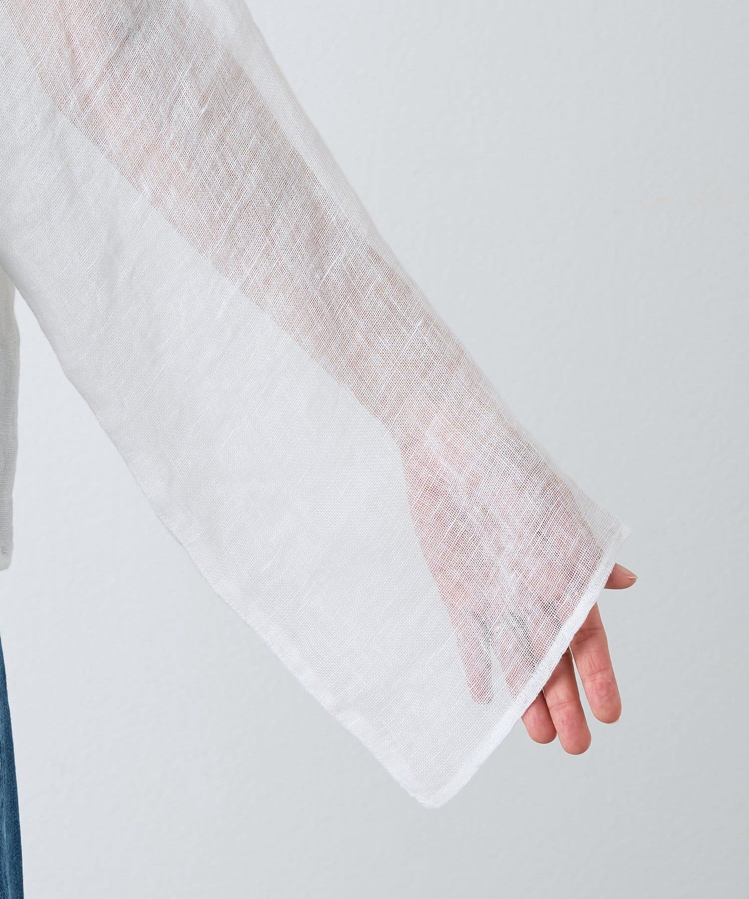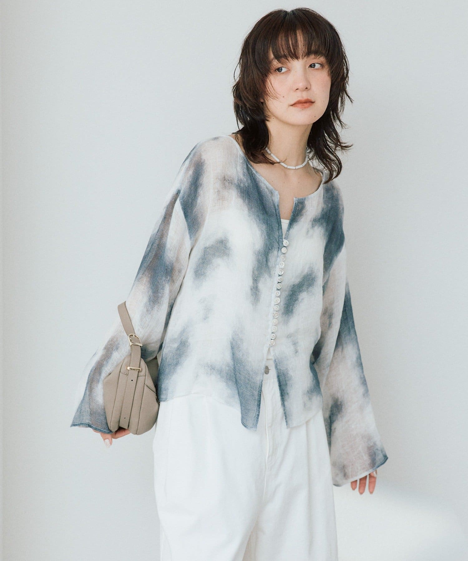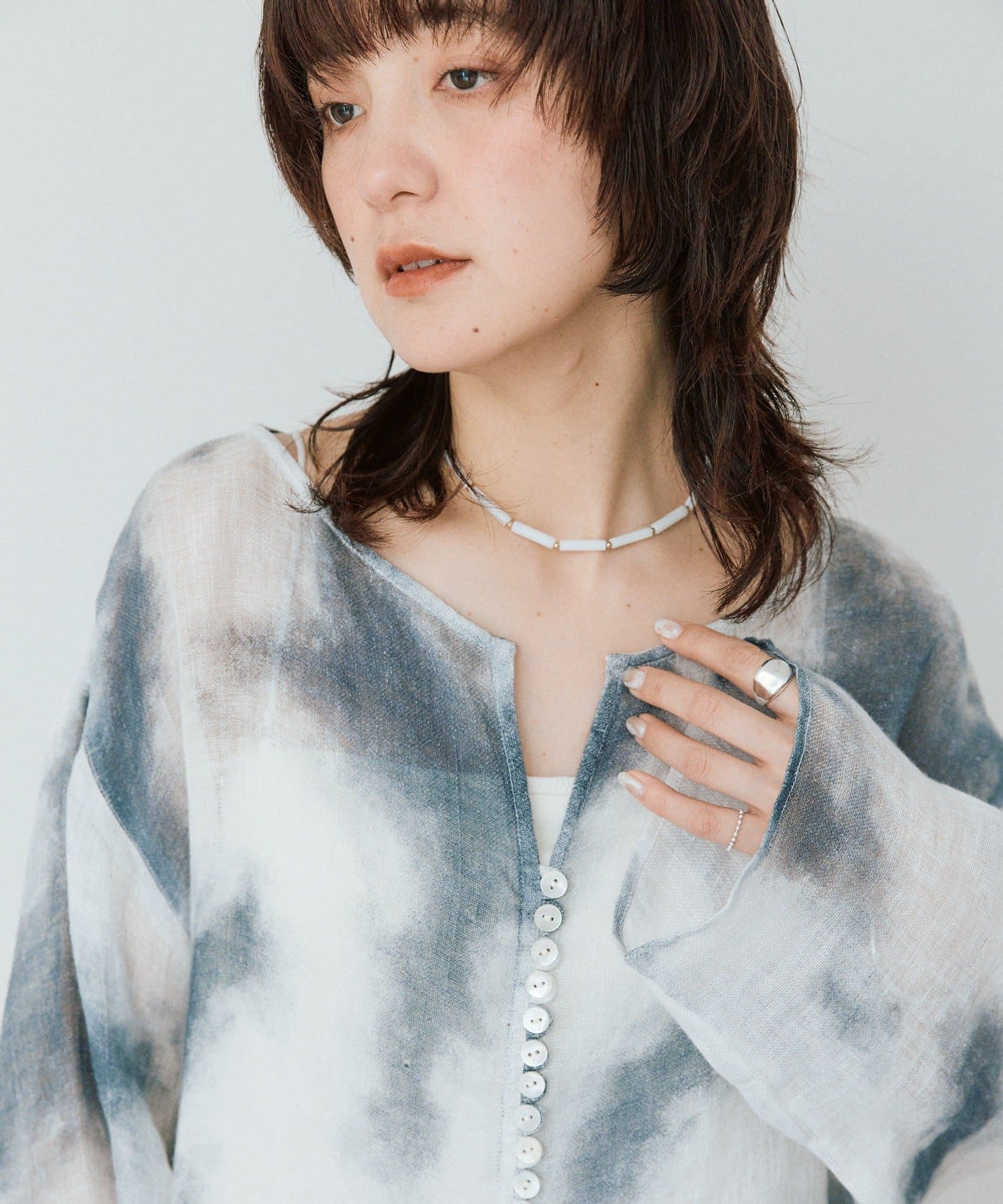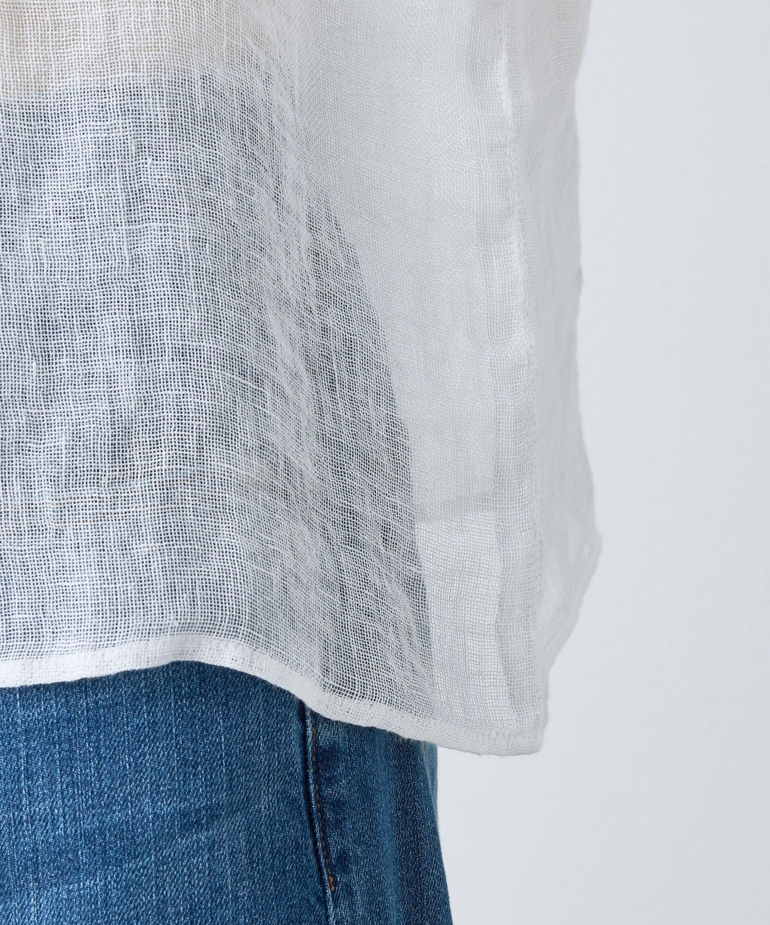 ・リネンの素材感と後ろにつけた貝ボタンのディテールがポイントのシンプルなブラウス