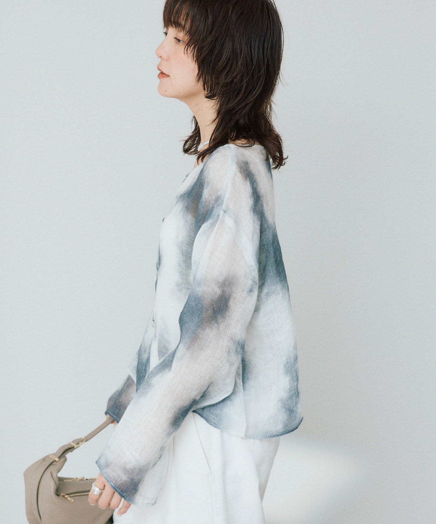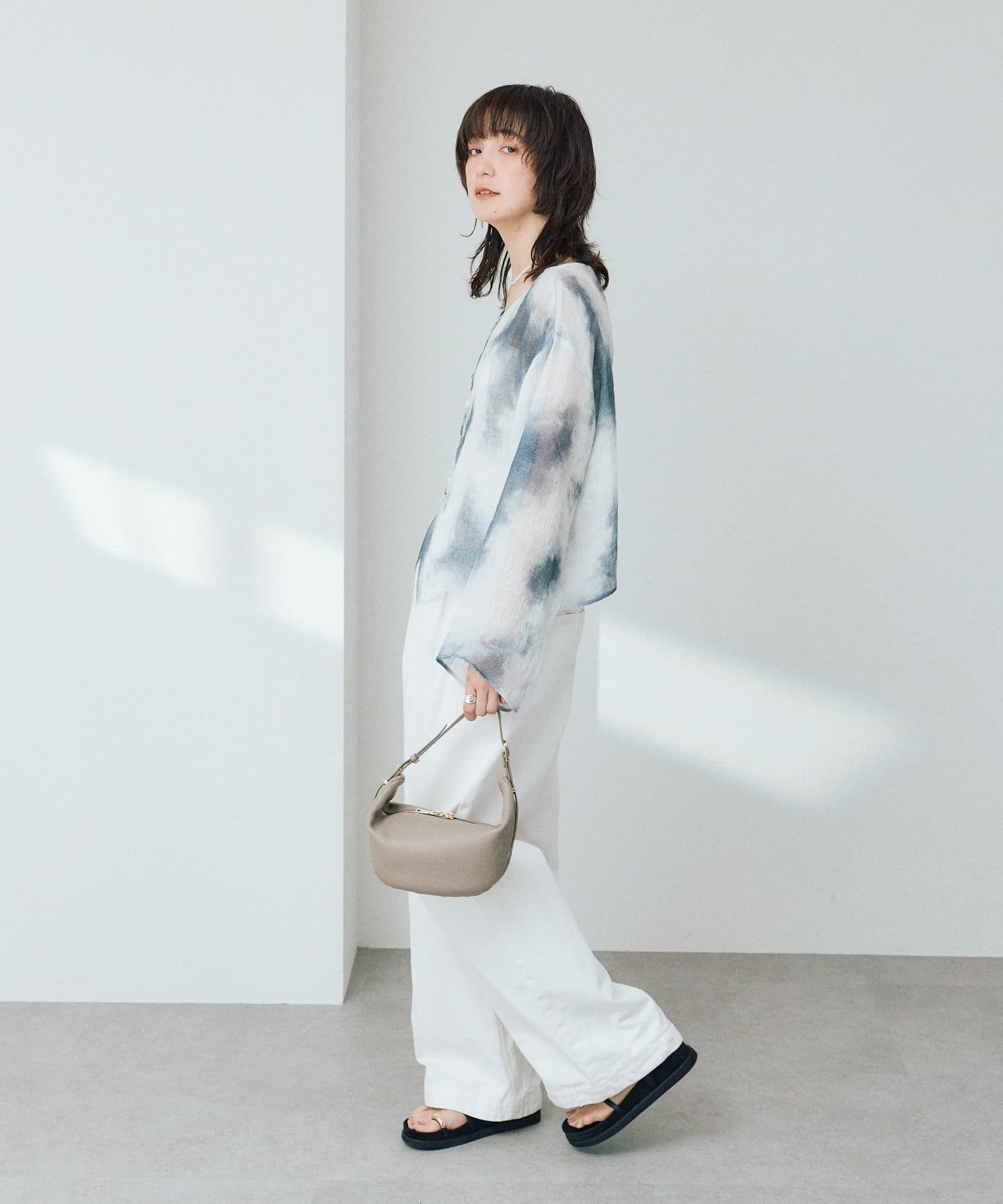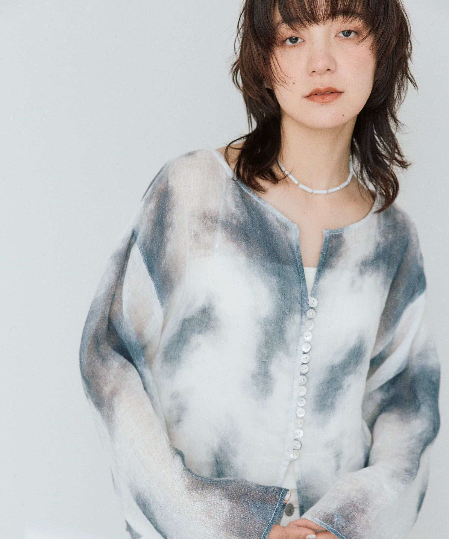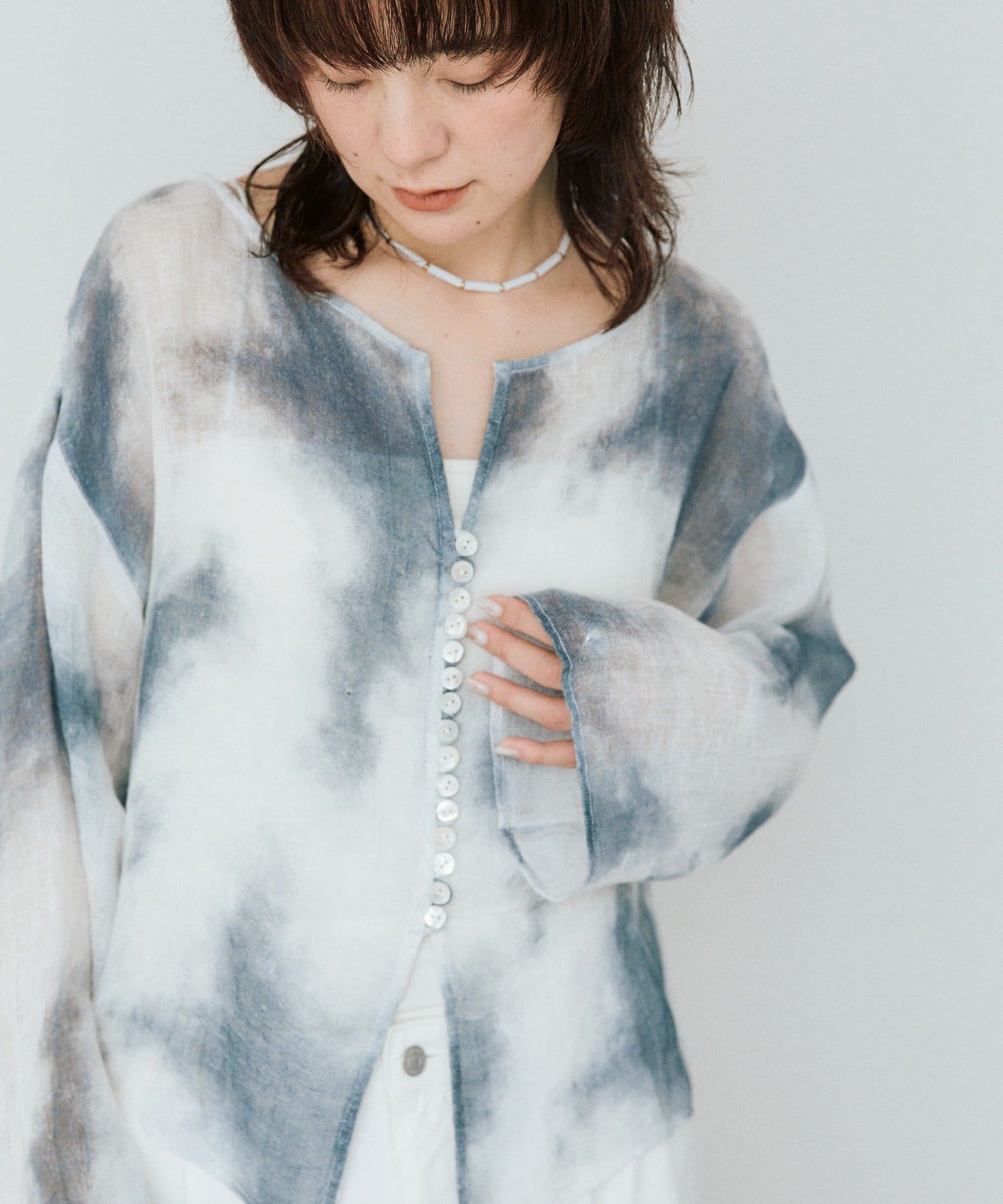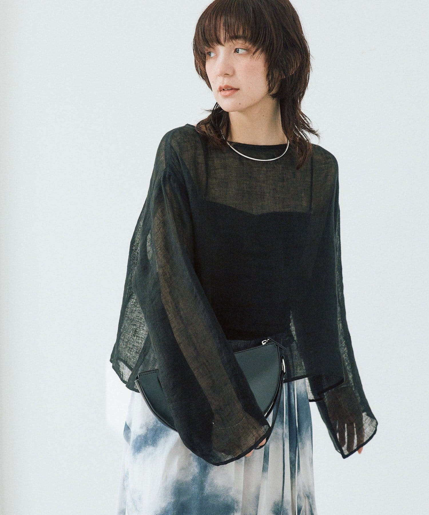 ・リネンの素材感と後ろにつけた貝ボタンのディテールがポイントのシンプルなブラウス