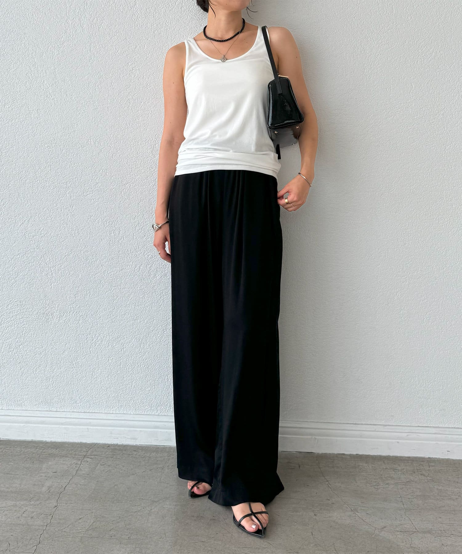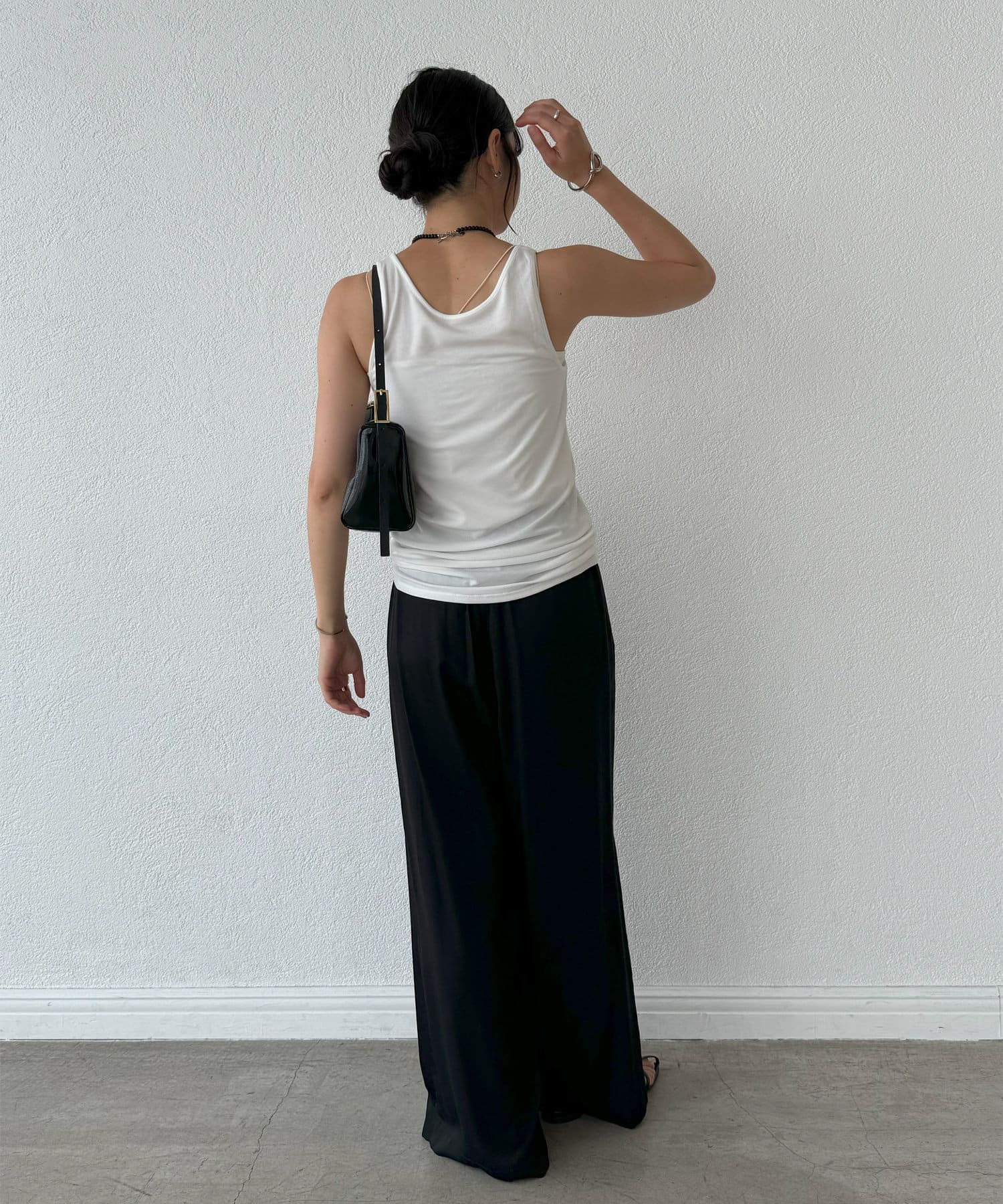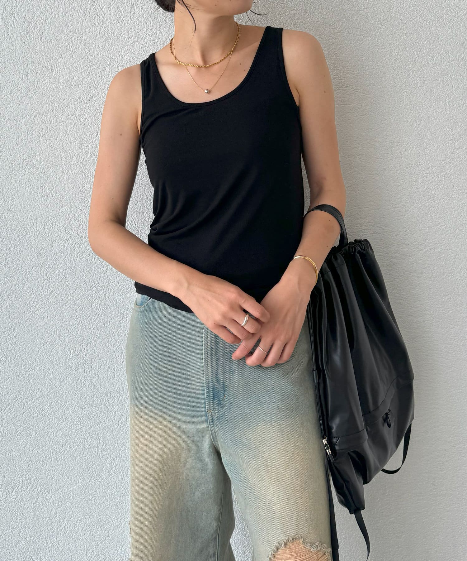 ユーカリの木を原料とした再生繊維リヨセルを使用し、柔らかくなめらかな肌触りの生地を使用したタンクトップ。