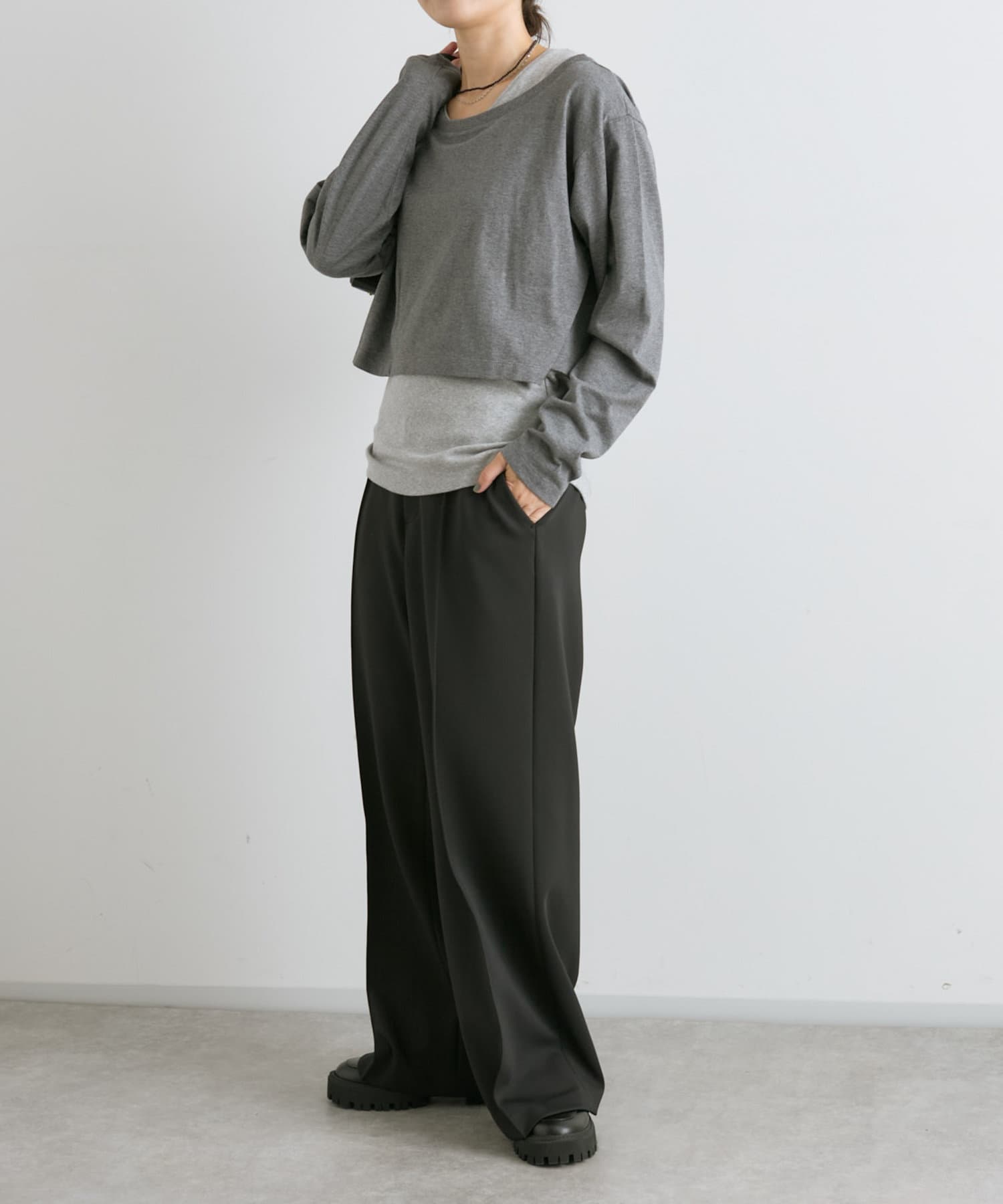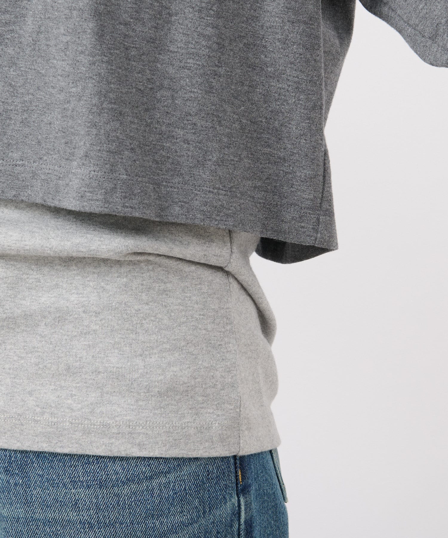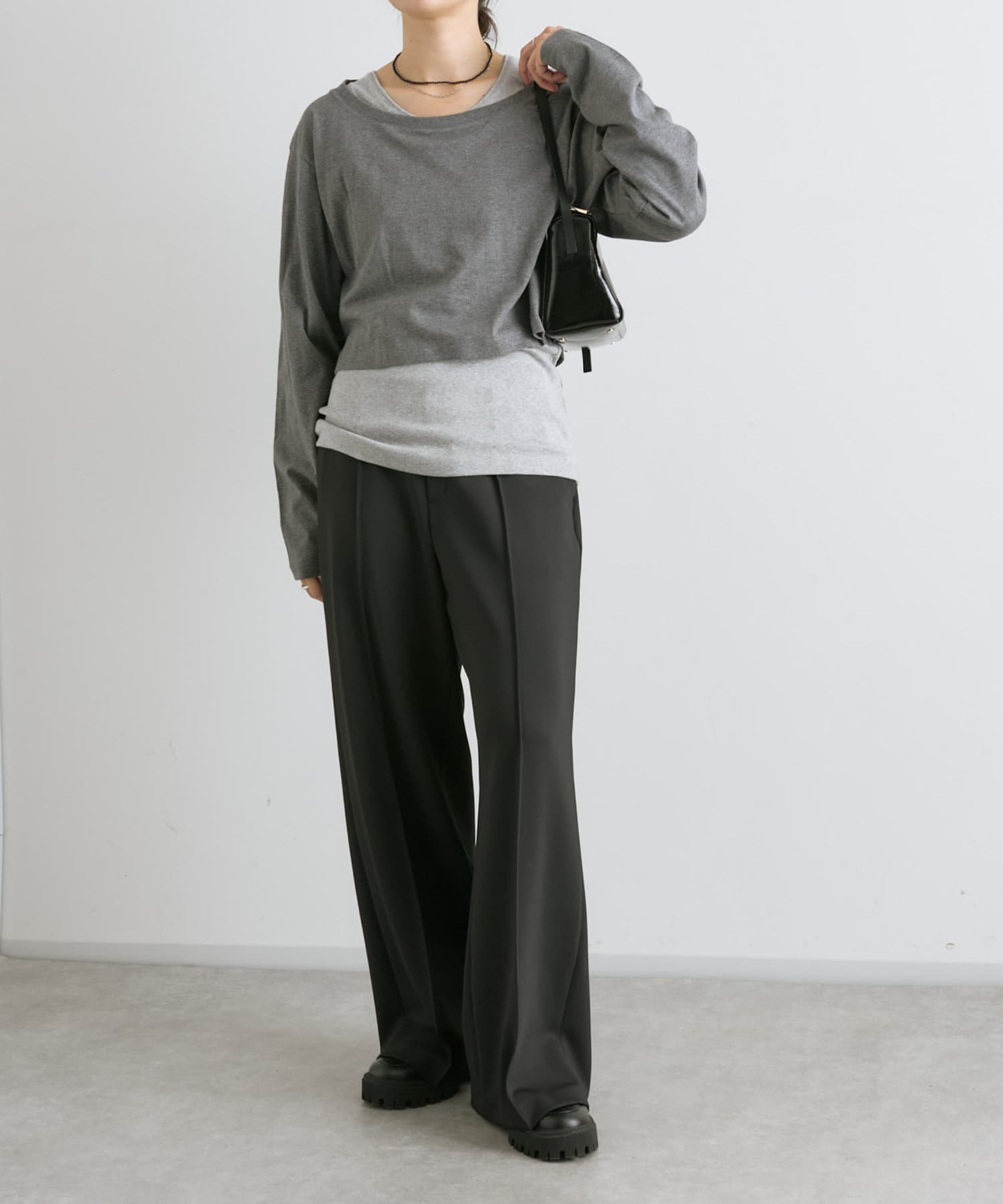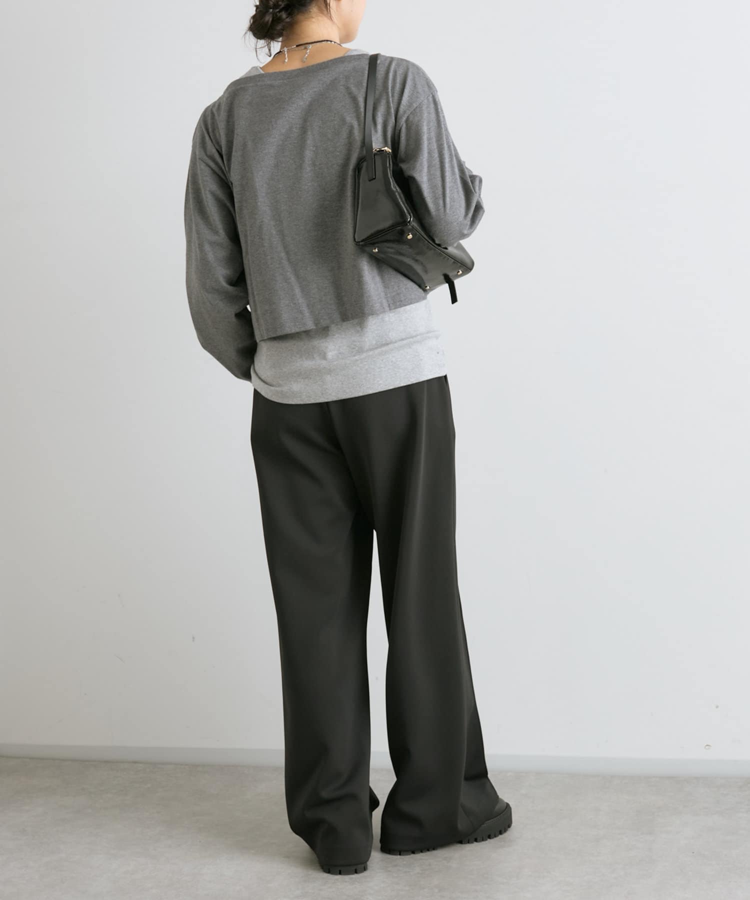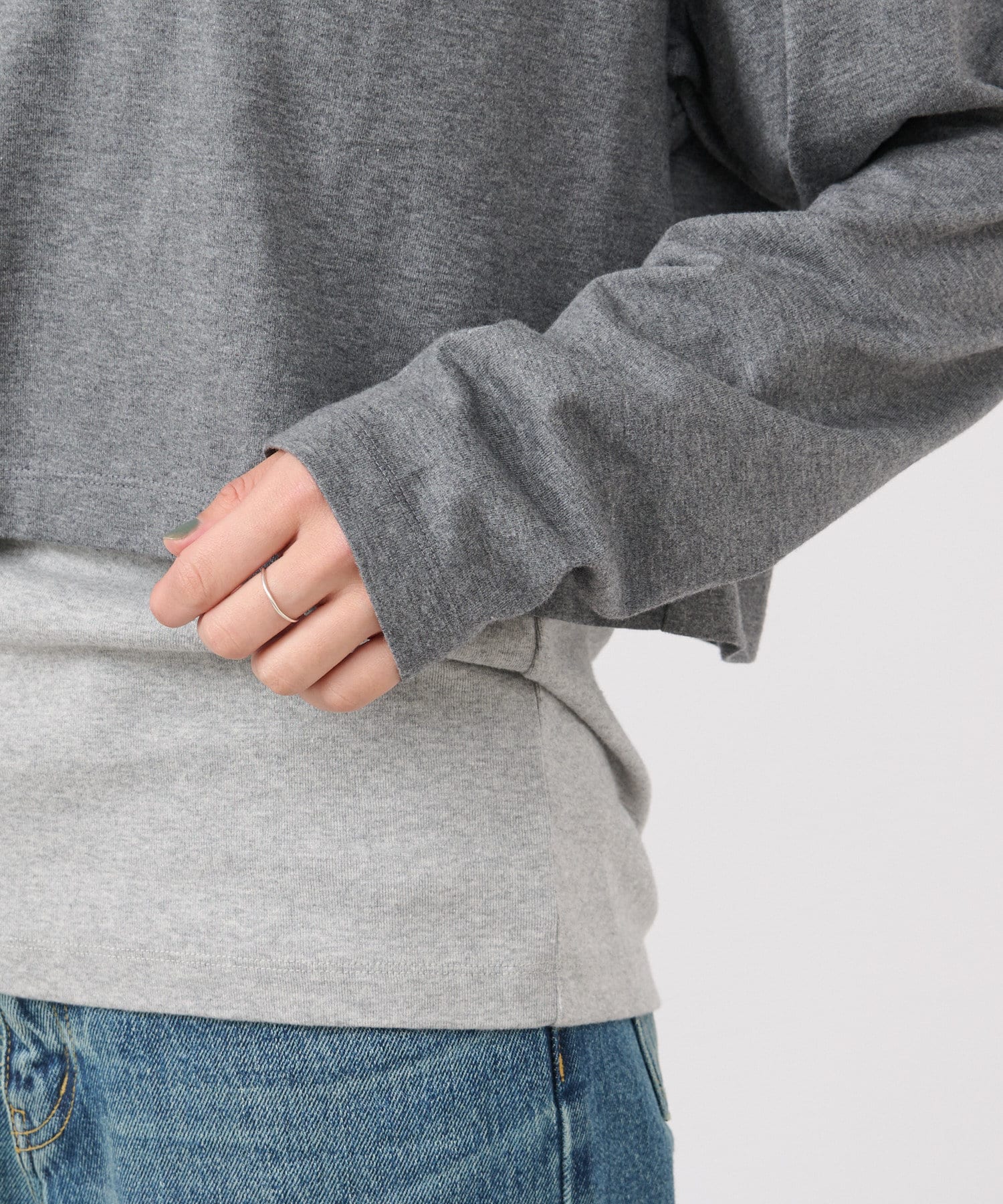 ロンTeeはネックを大き目に開けており、丈は短めのバランスにして袖は長め。