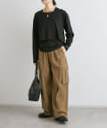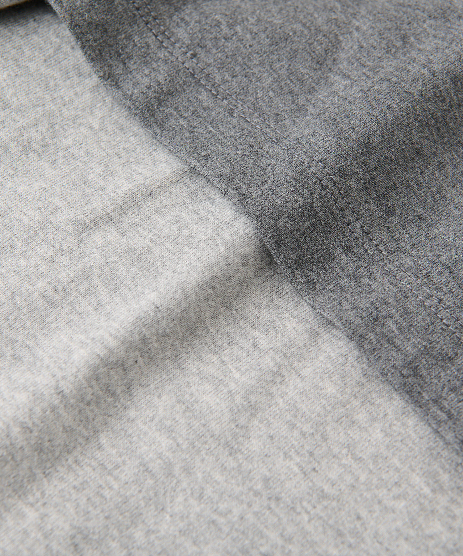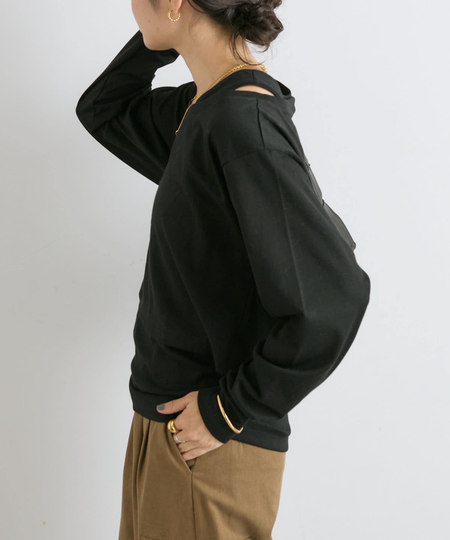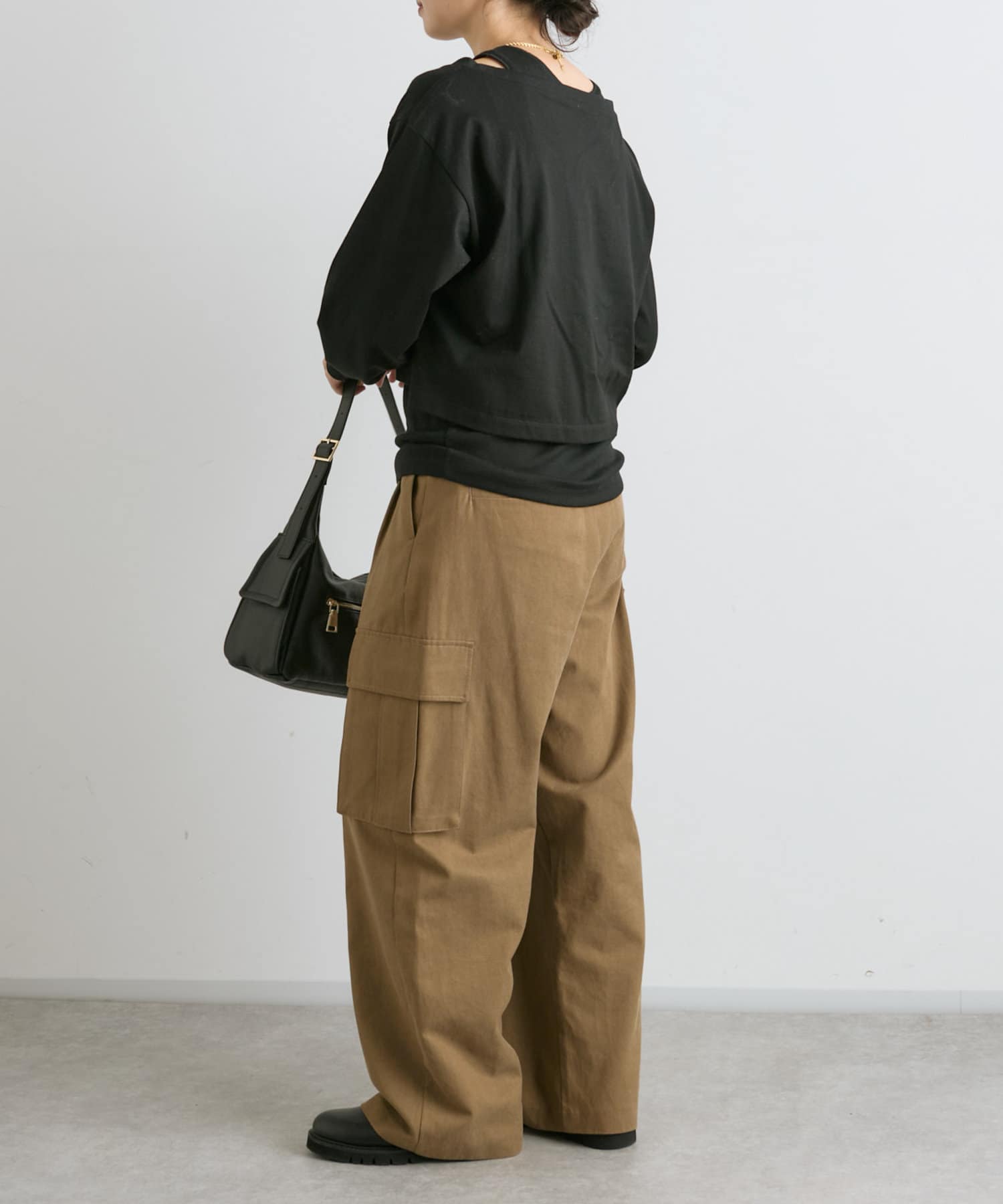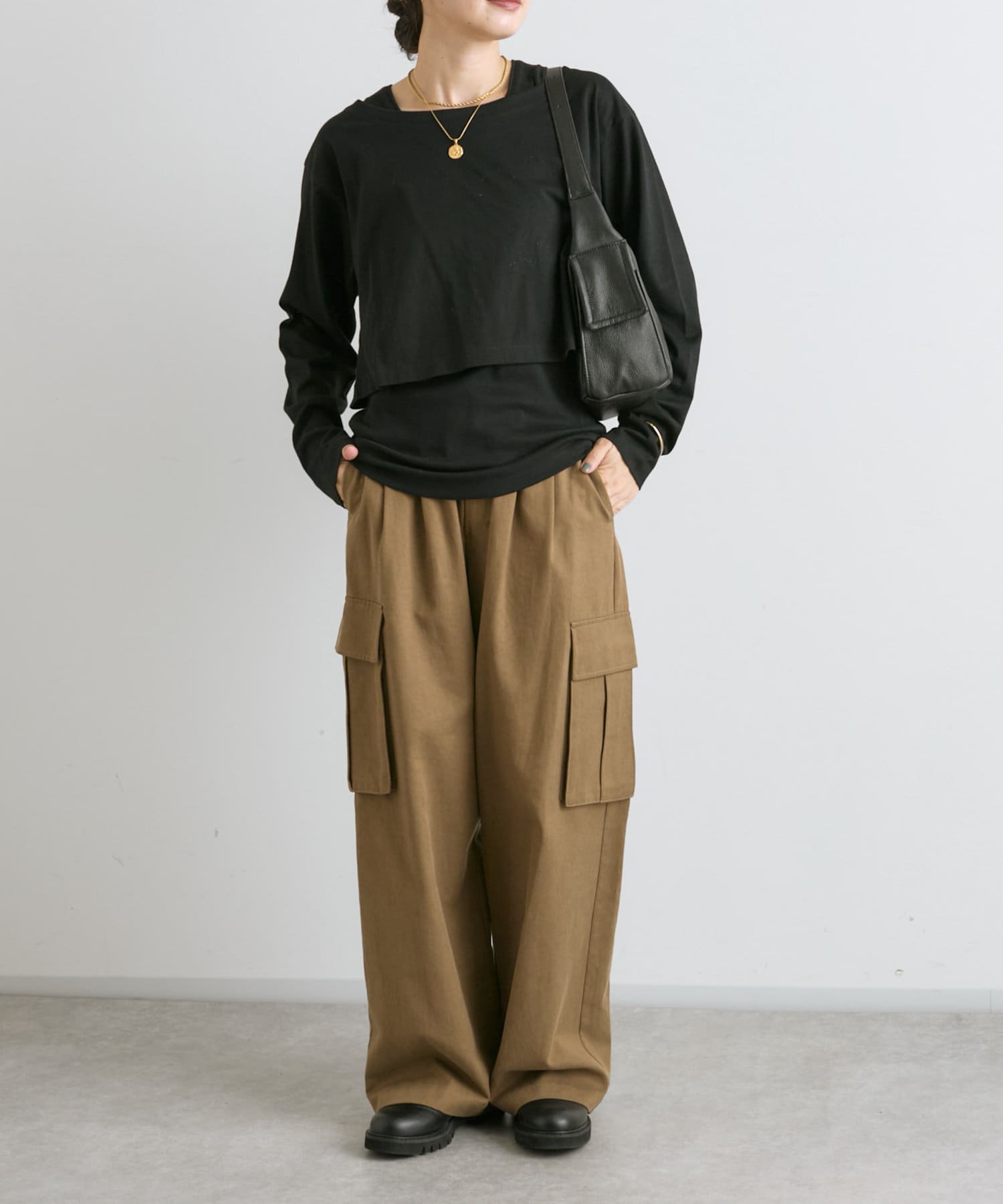 ロンTeeはネックを大き目に開けており、丈は短めのバランスにして袖は長め。