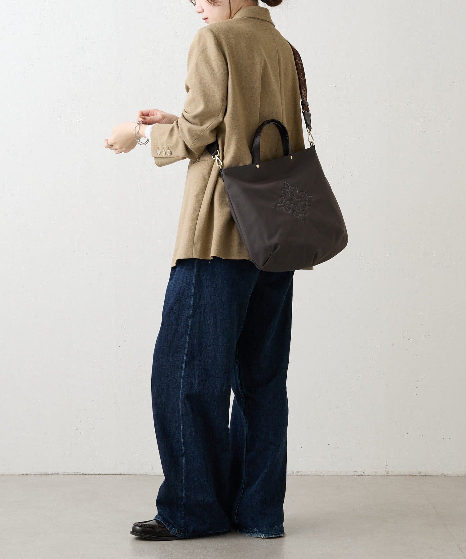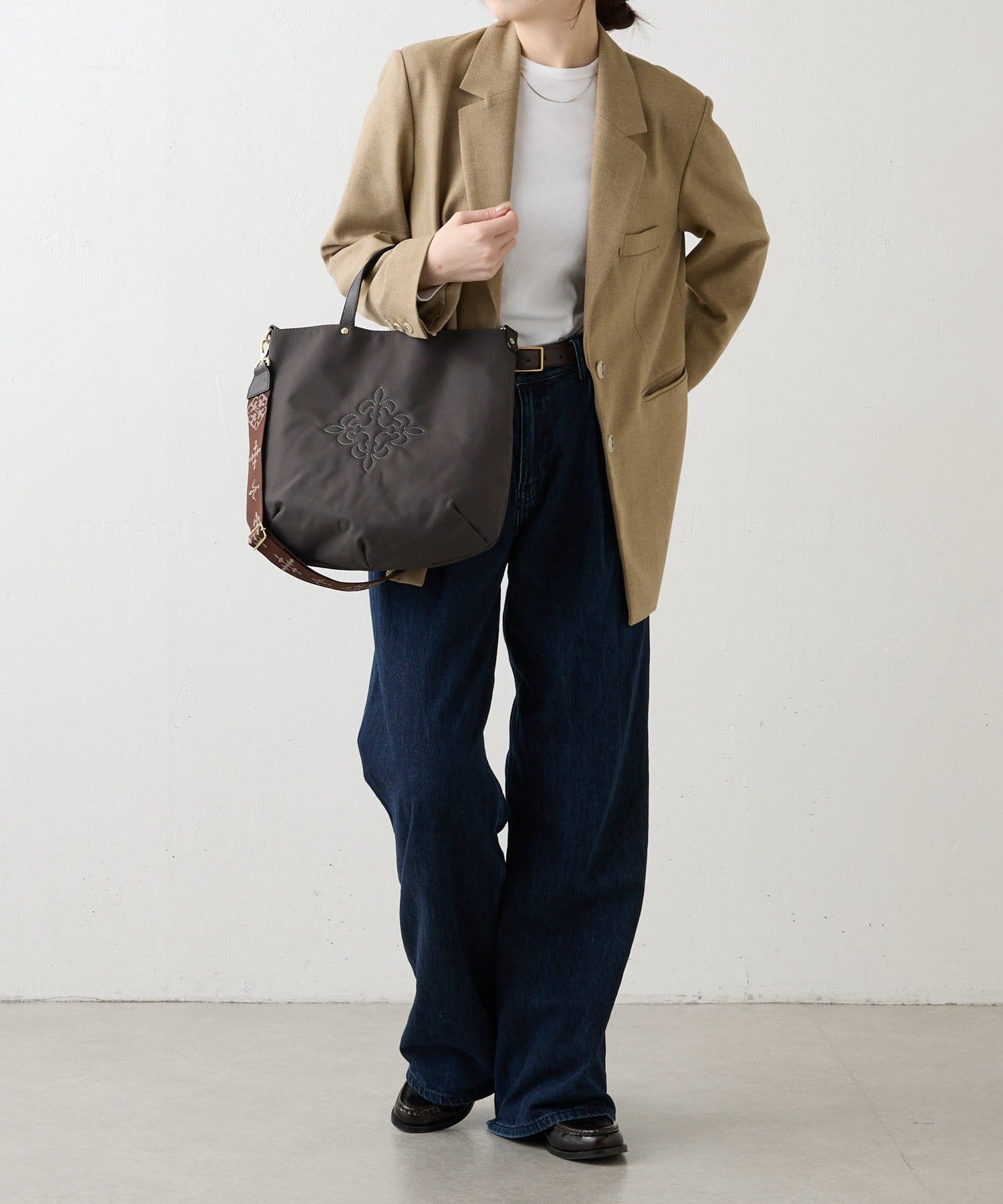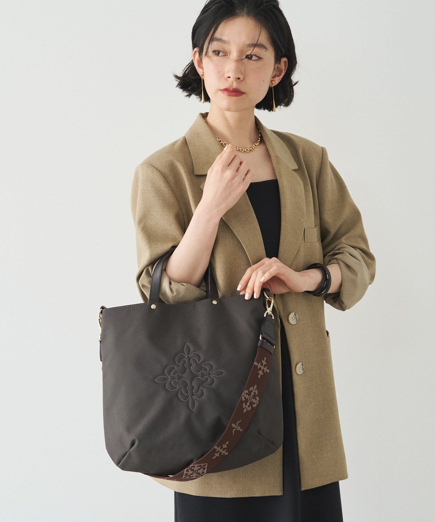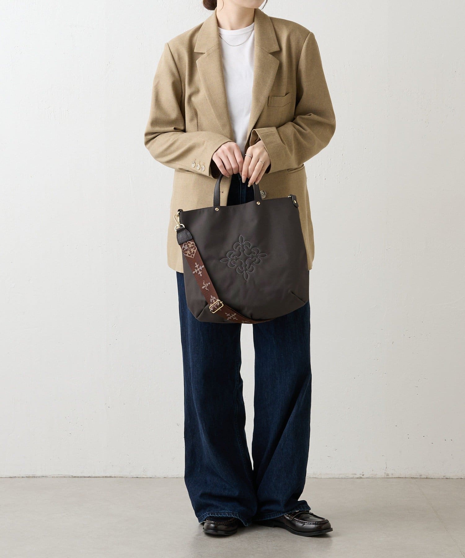 コーデを引き締める定番カラー。バッグ中央の刺繍がホワイトなので、重くなりすぎず抜け感を演出します。