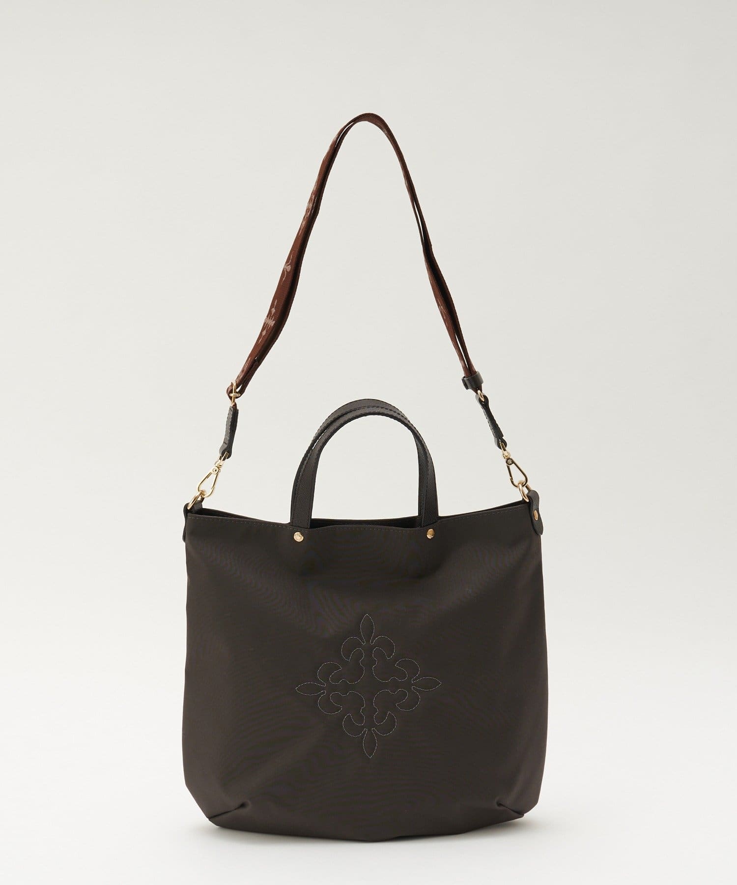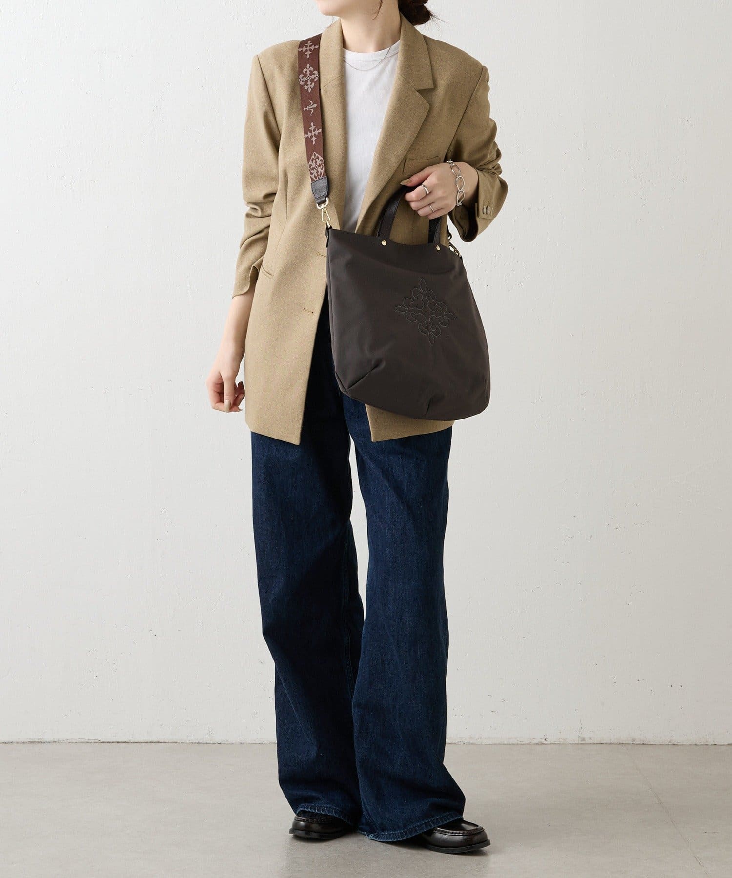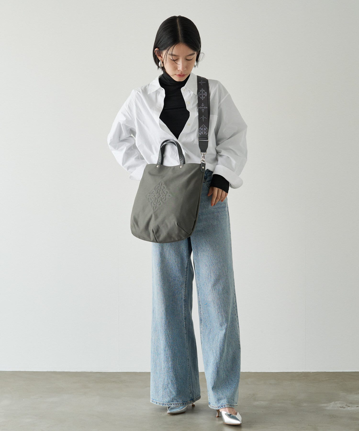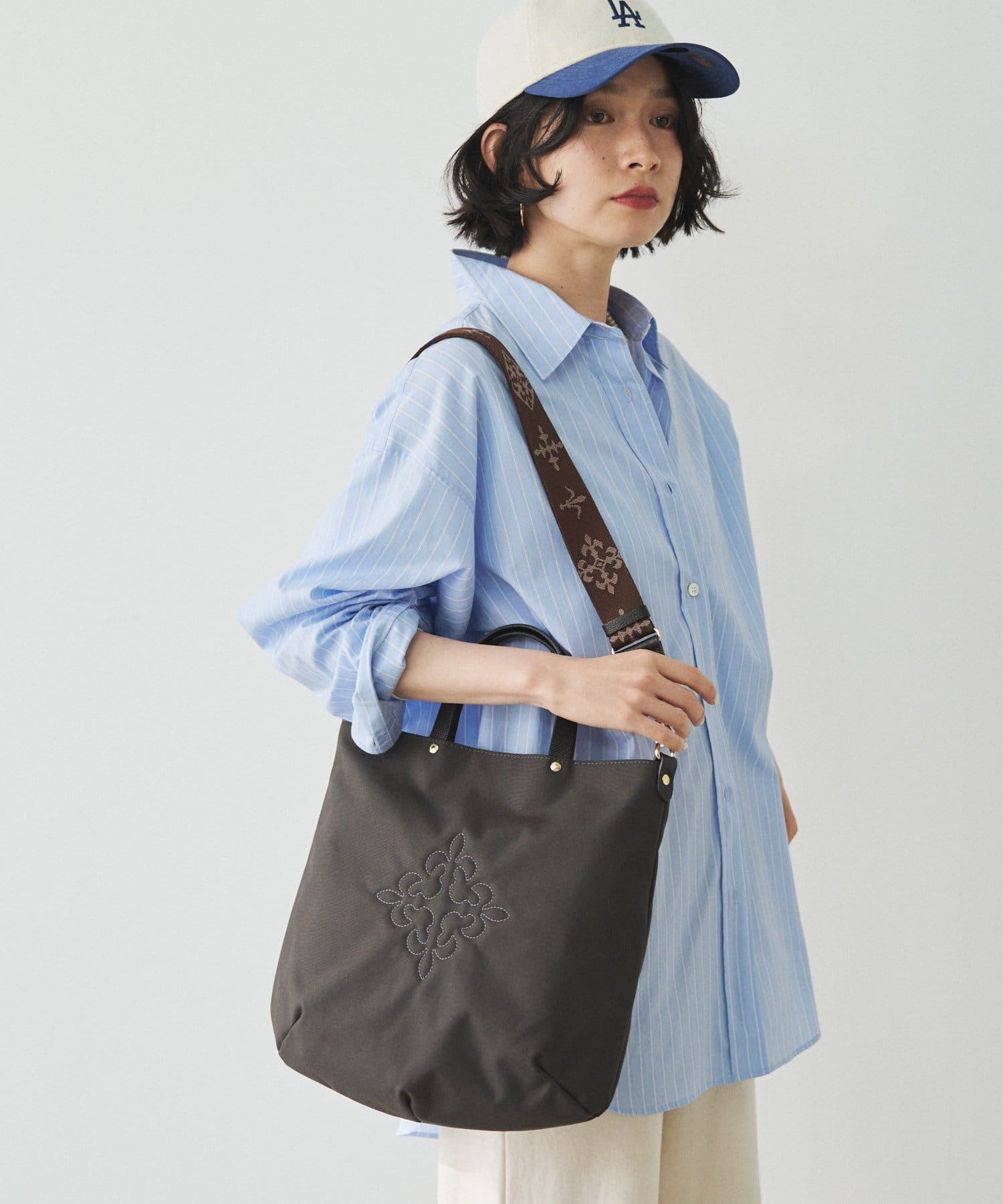 コーデを引き締める定番カラー。バッグ中央の刺繍がホワイトなので、重くなりすぎず抜け感を演出します。