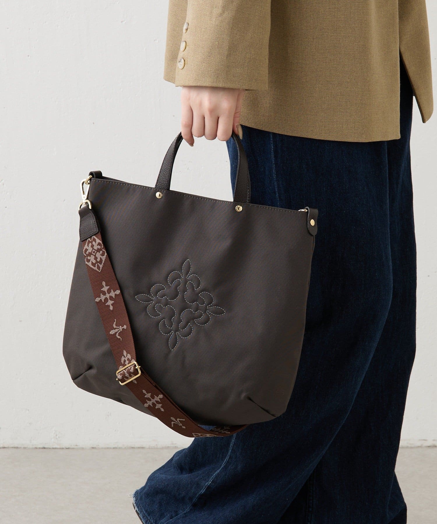 落ち着いたくすみ感のあるピンクが、甘さを抑えた上品な印象に。刺繍がやさしくなじみ、配色ショルダーがほどよいアクセントを添えます。