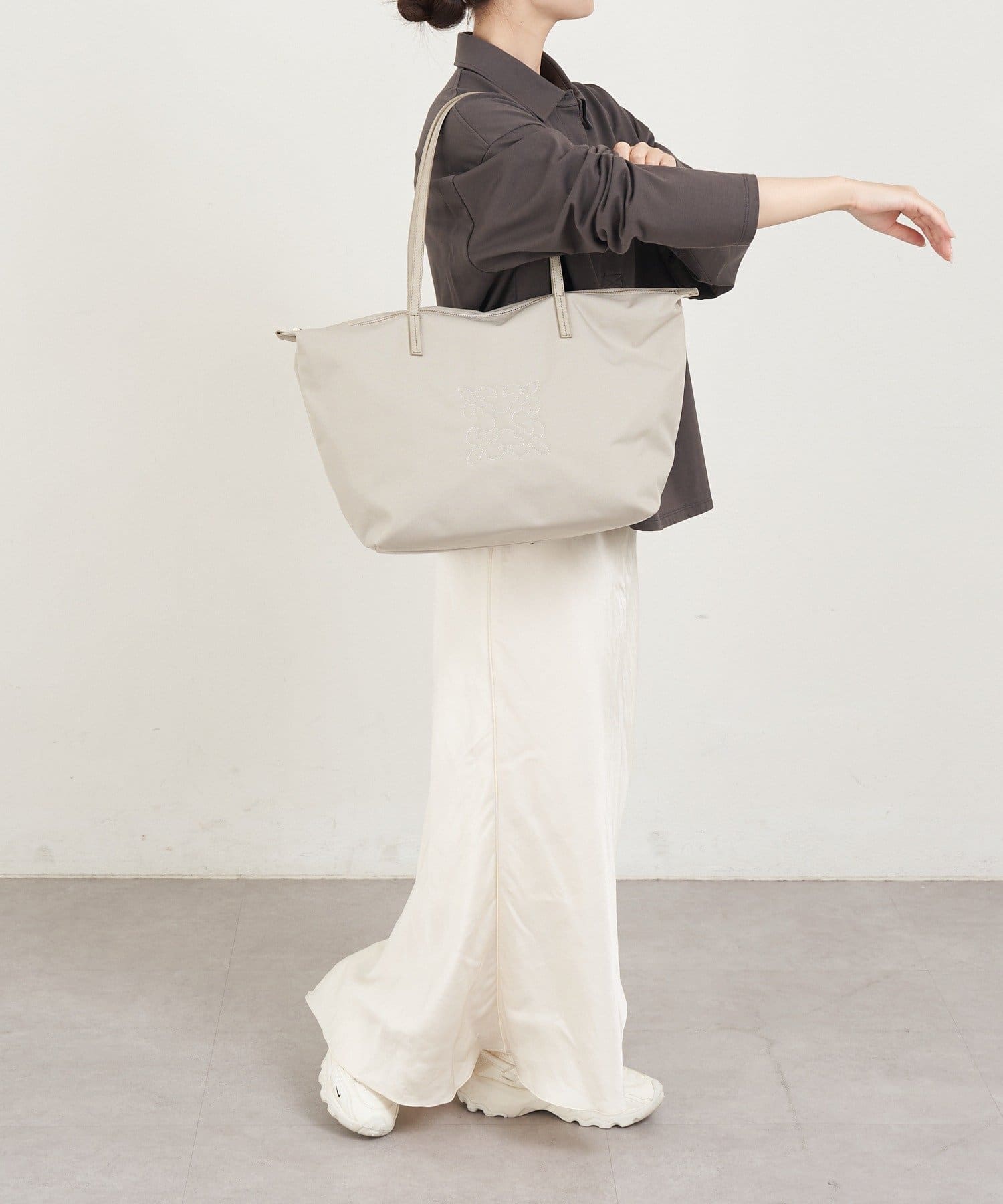 モノグラムモチーフの刺繍がポイントでカジュアルだけど、どこか上品。