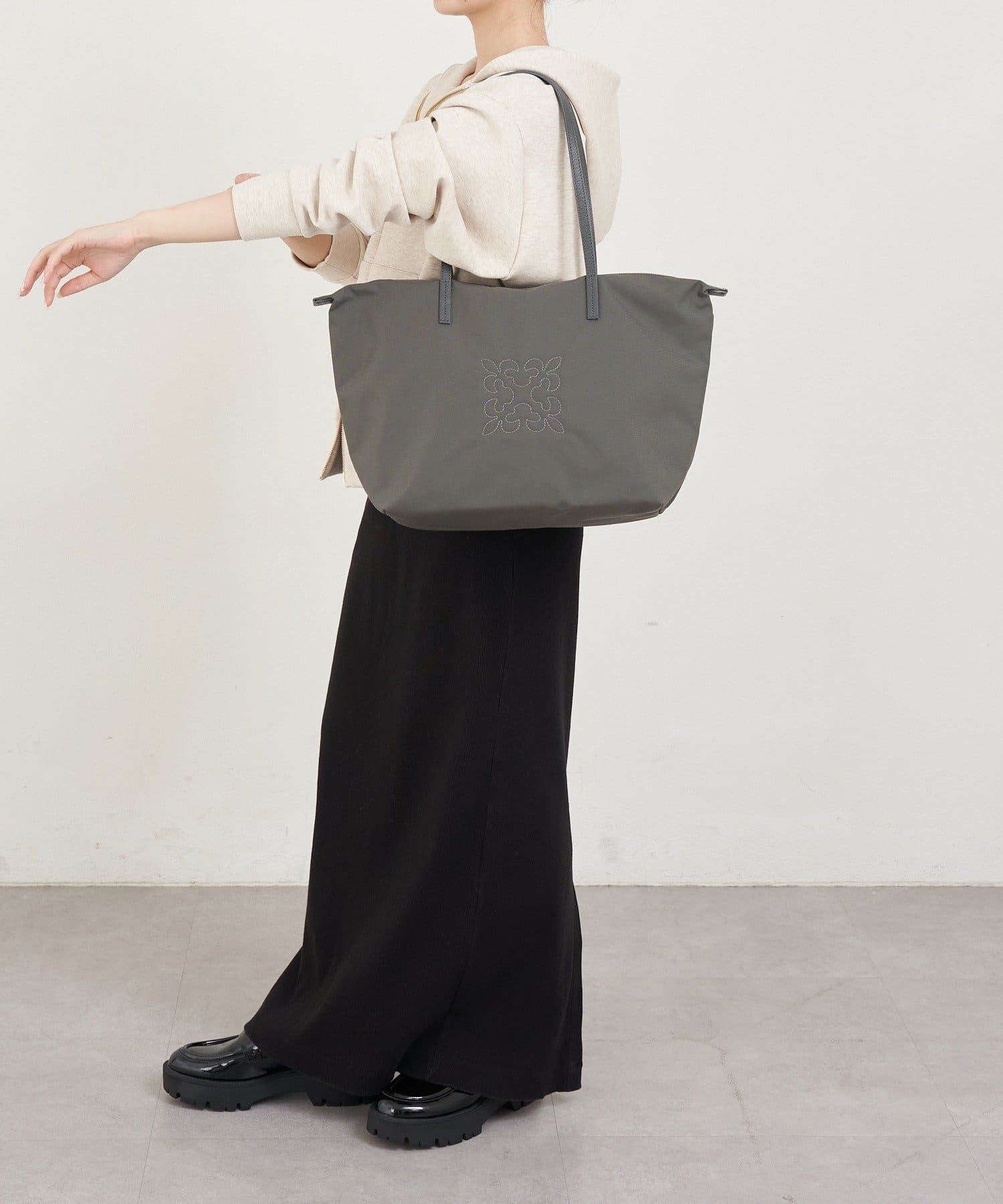 コーデを引き締める定番カラー。バッグ中央の刺繍がホワイトなので、重くなりすぎず抜け感を演出します。