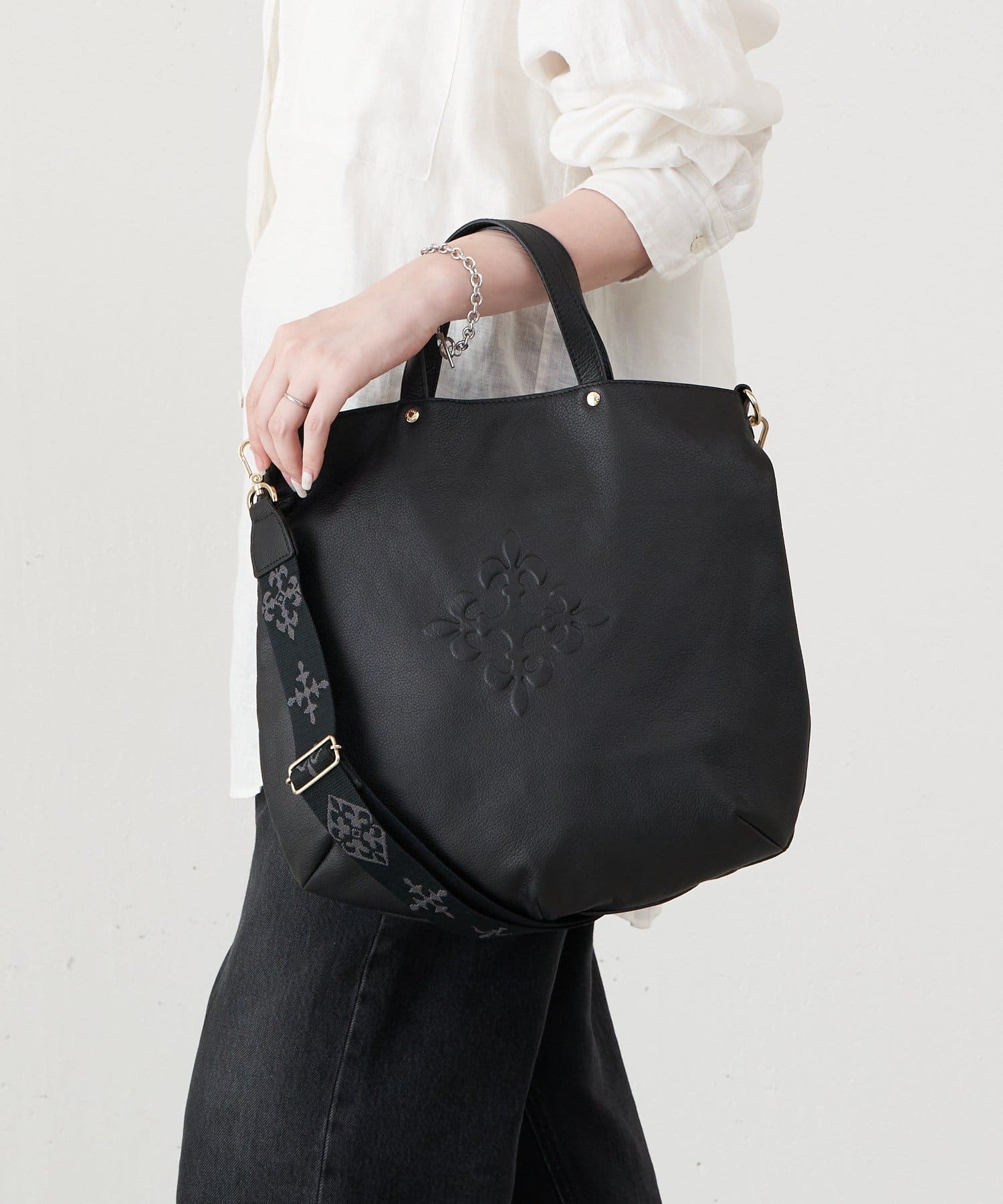 ・シンプルながらもモチーフのエンボスやショルダーストラップで上品な華やかさをプラス。