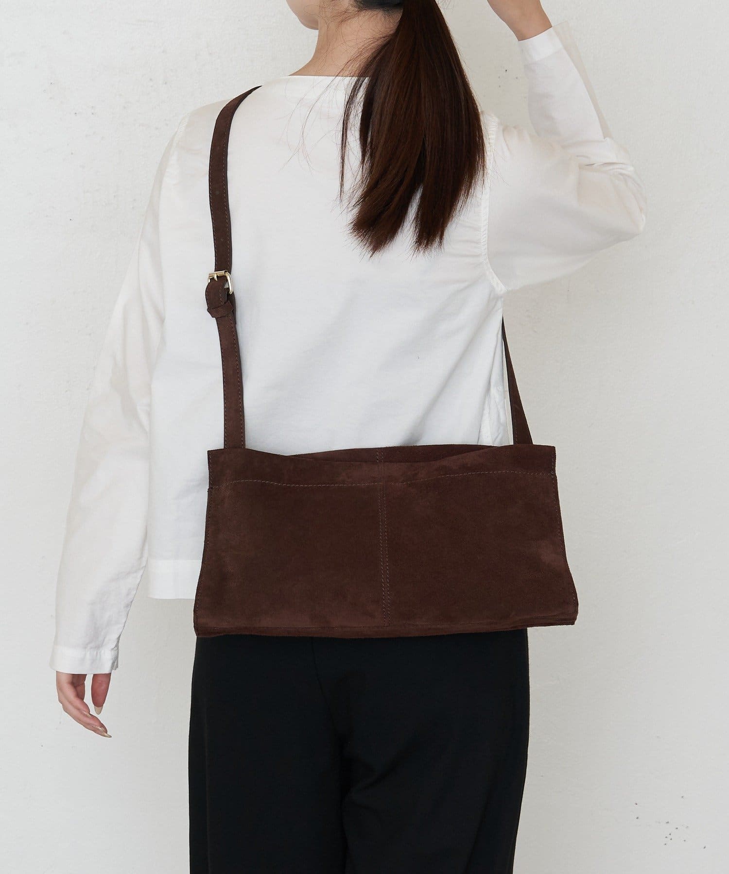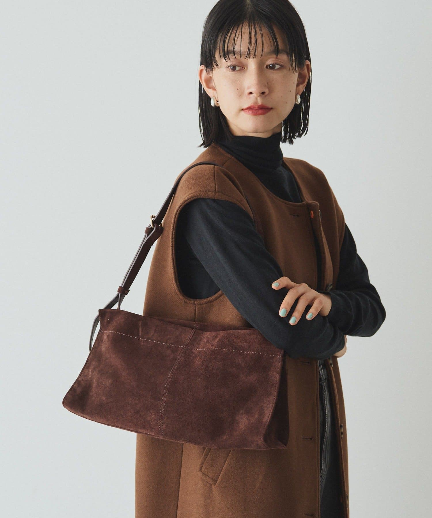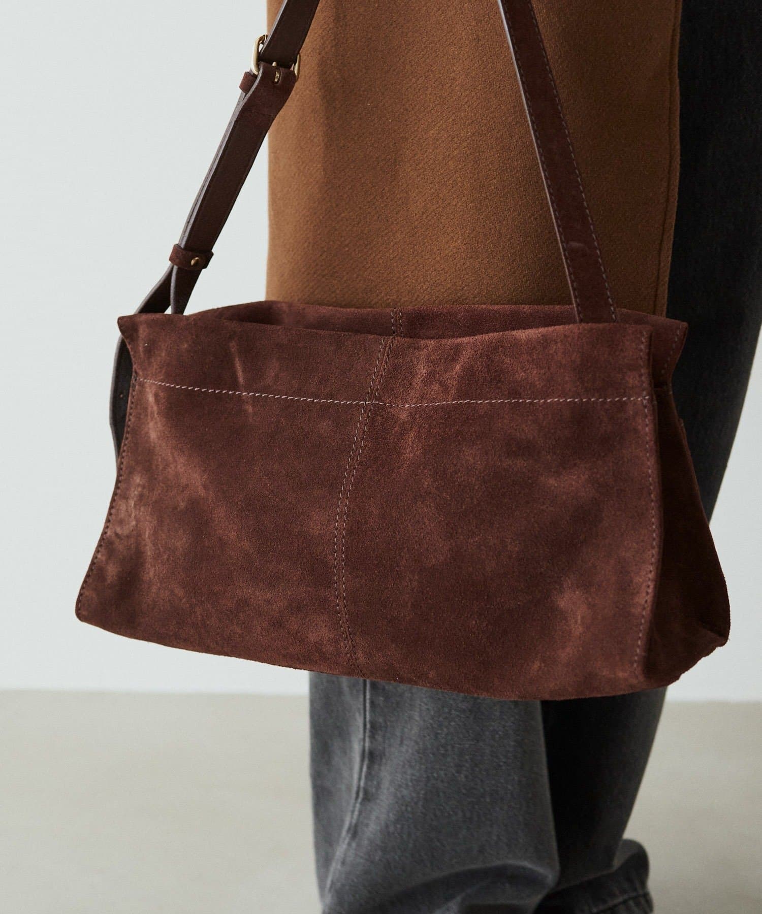 装いに深みを添える、スエードショルダーバッグ。