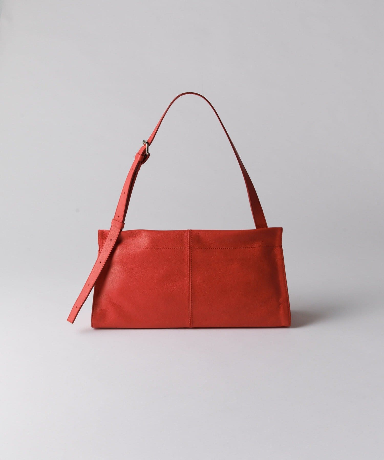 直線的なラインとすっきりとしたフォルムが魅力のレザーショルダーバッグ。