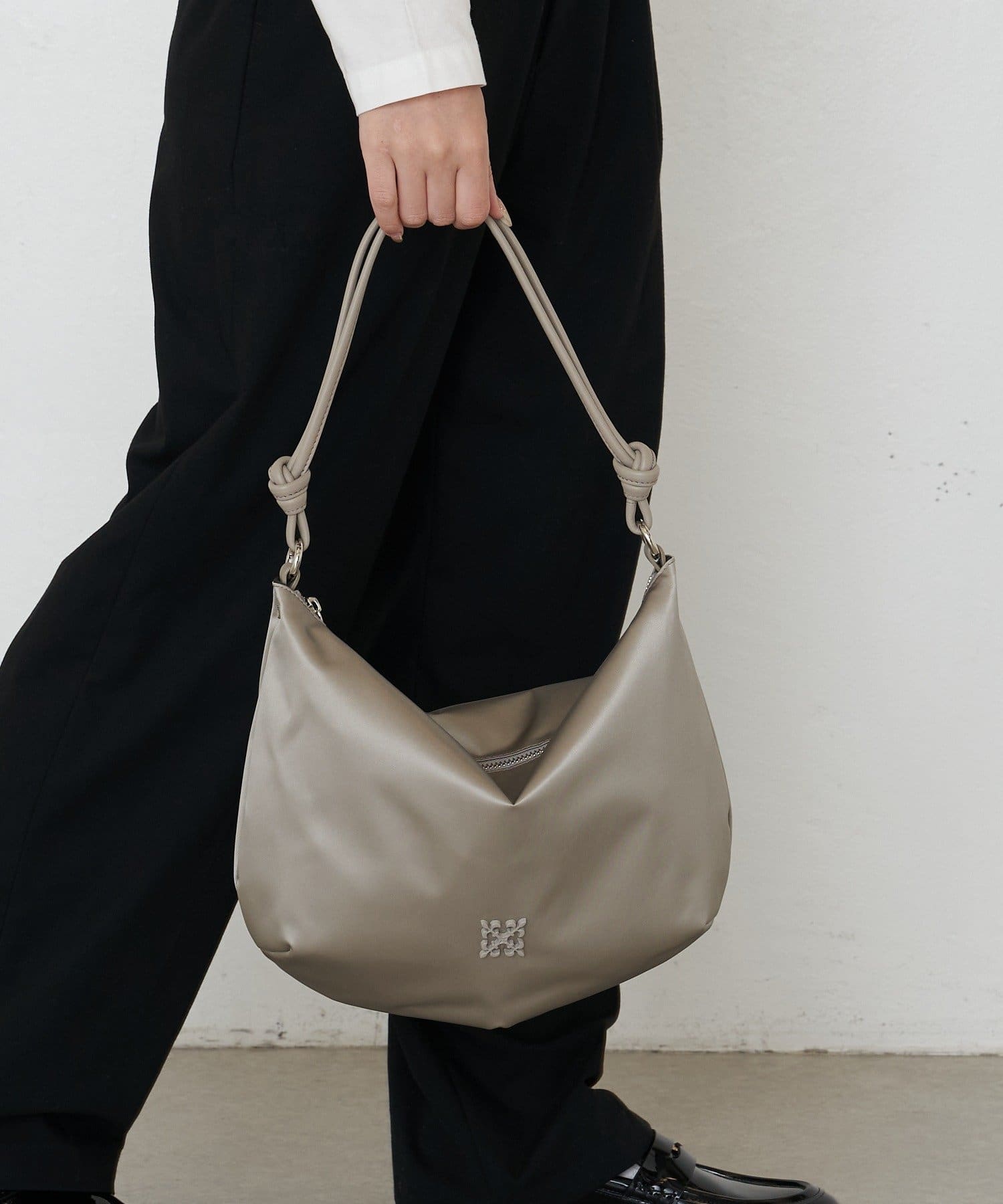 丸みを持たせた柔らかなフォルムに、結び目をアクセントにしたハンドルが目を惹くデザイン。