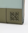 異なるカラーのレザーを組み合わせたパッチワークデザインに同色のモノグラムプレートが、さりげなく個性を引き立てます。