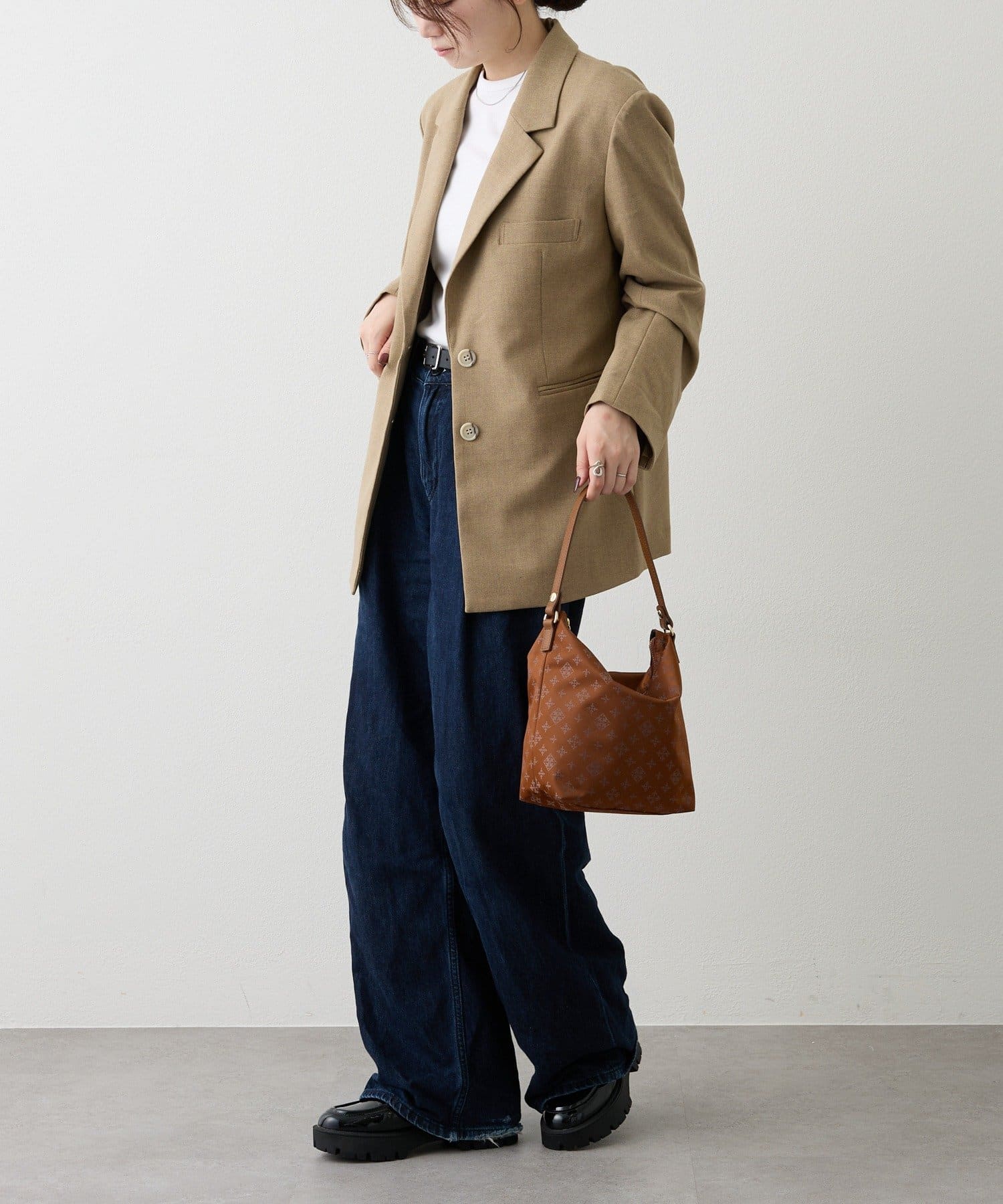 短いハンドルで肩掛けのワンショルダーとして、また付属のナイロンストラップで斜め掛けとしても使用可能。