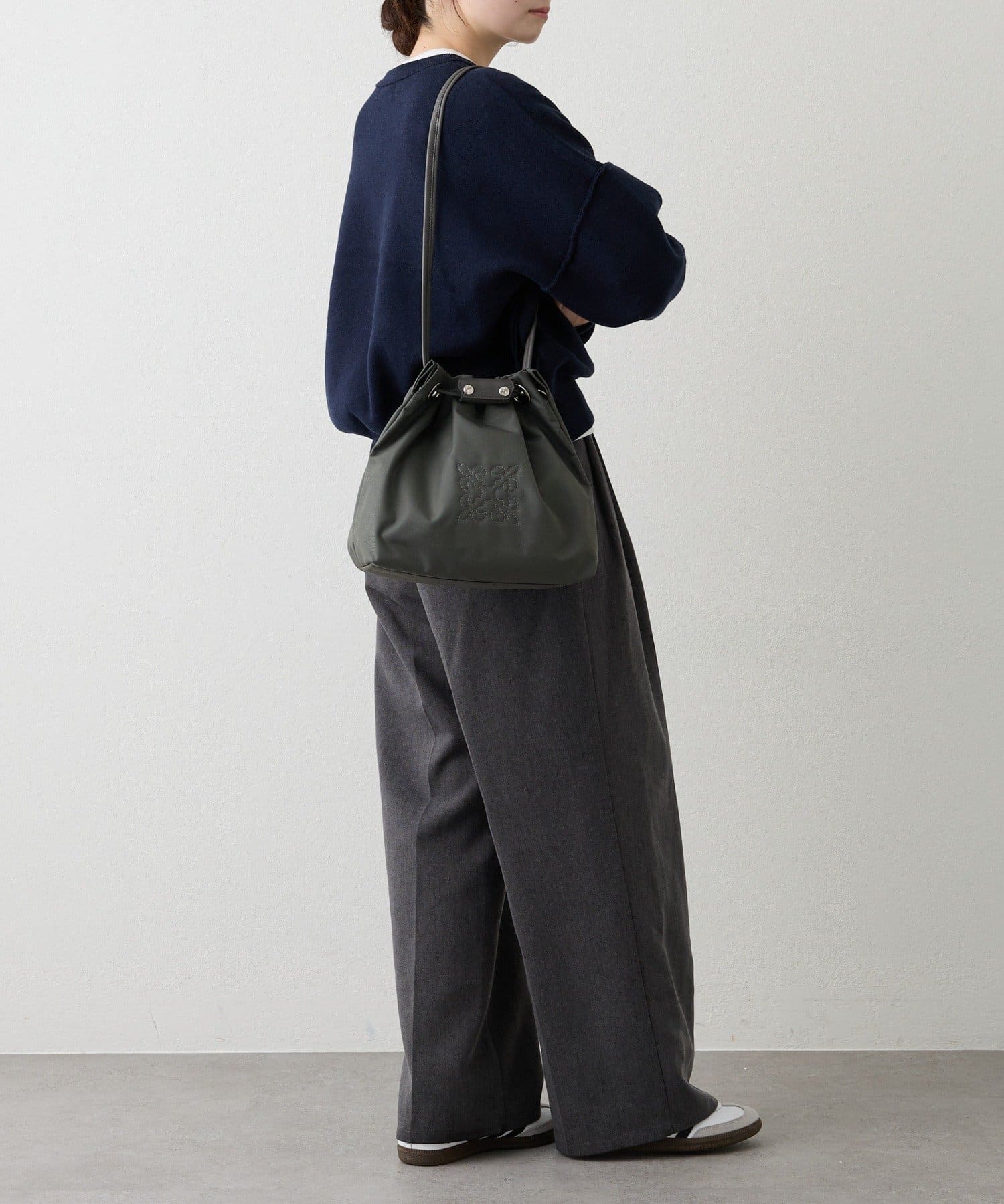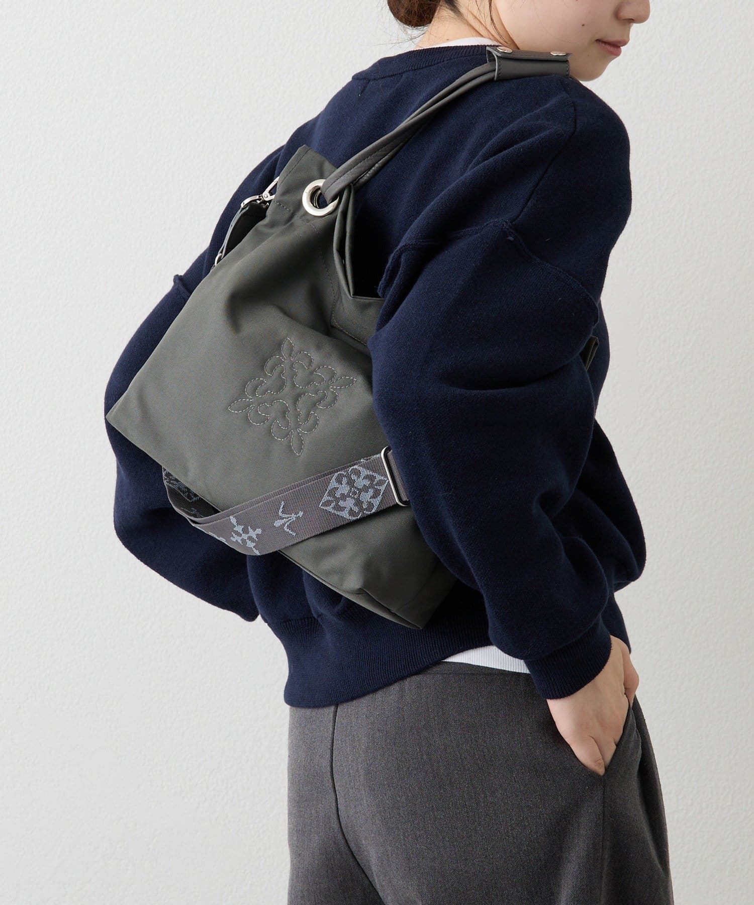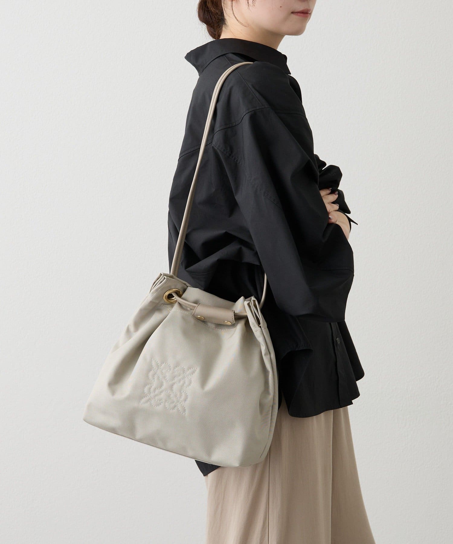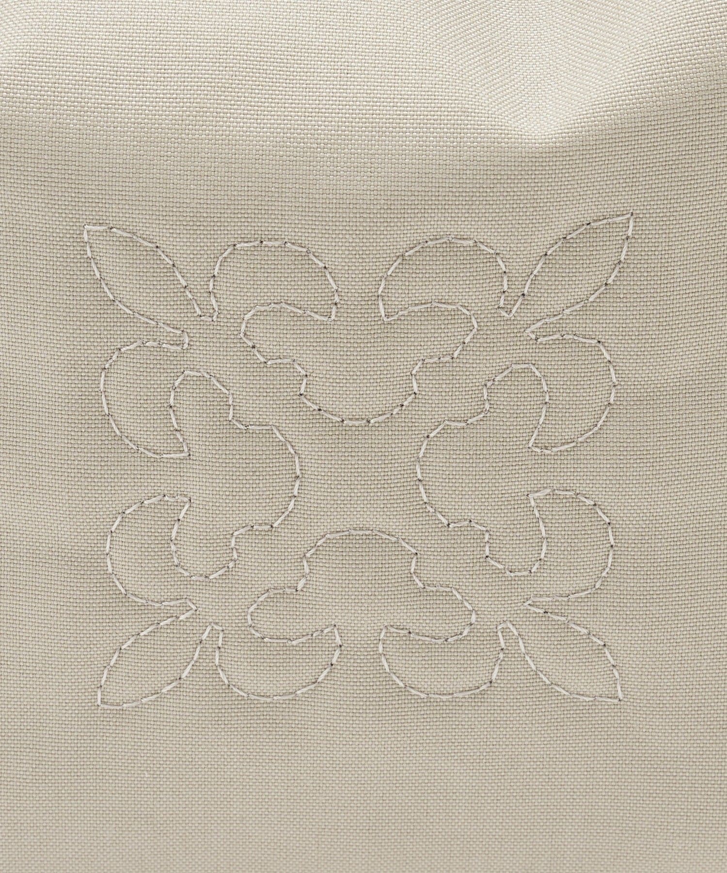 従来のひし形配置ではなく四角いグリッド状に施すことで、バッグ上部をくしゅっとさせても刺繍の美しさが際立つよう仕立てています。
