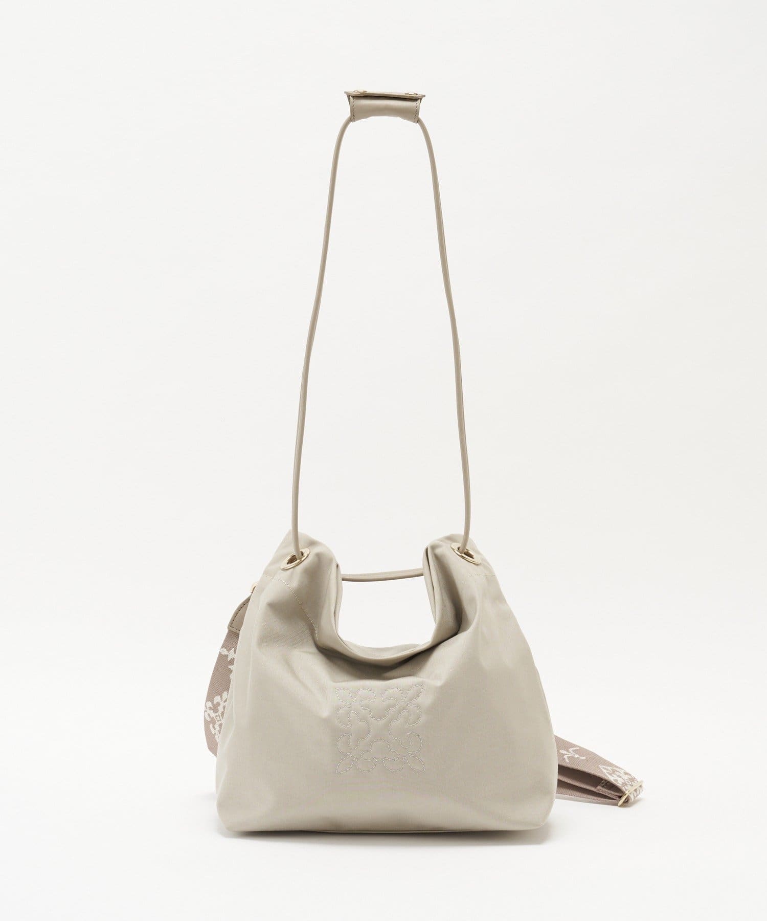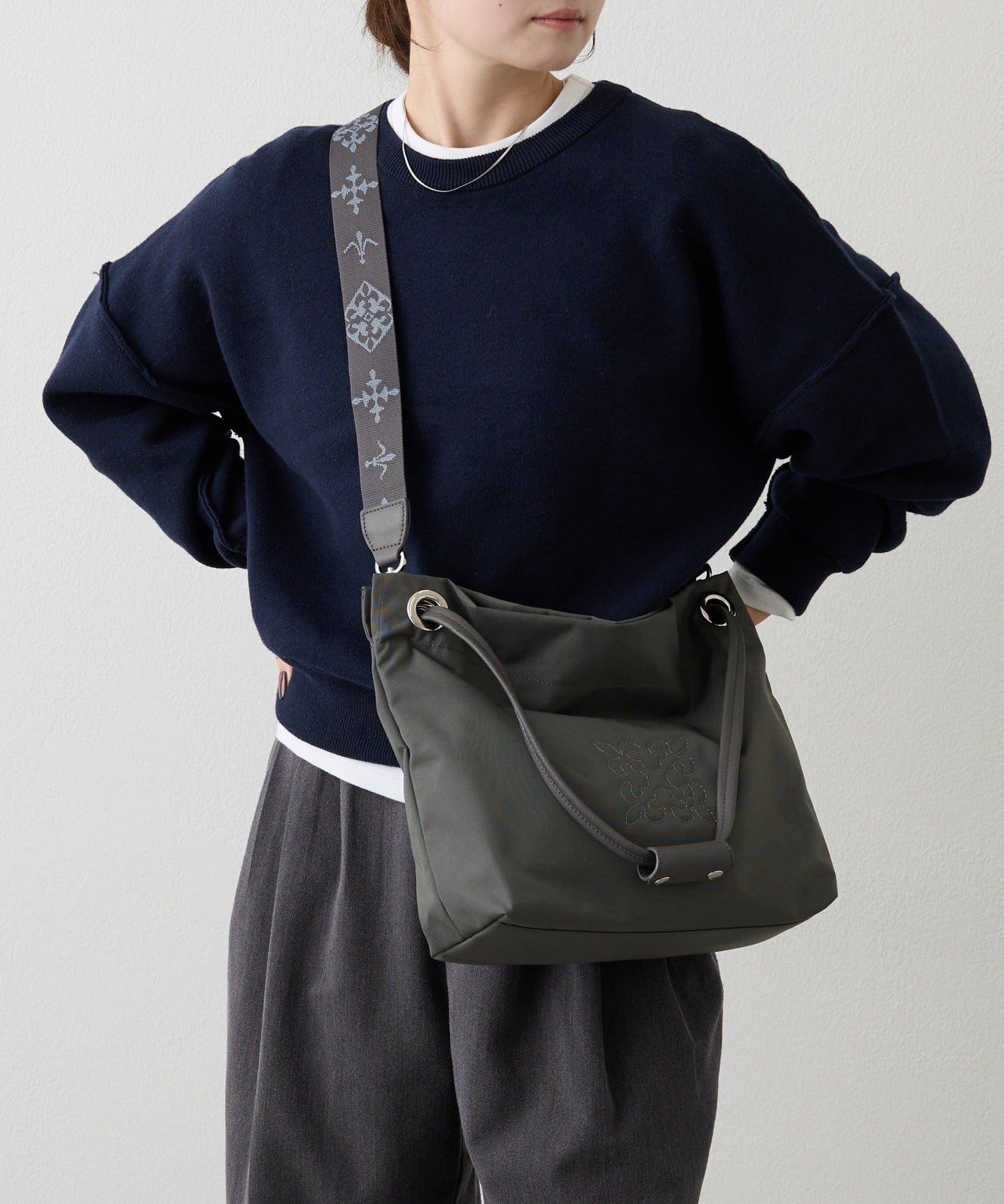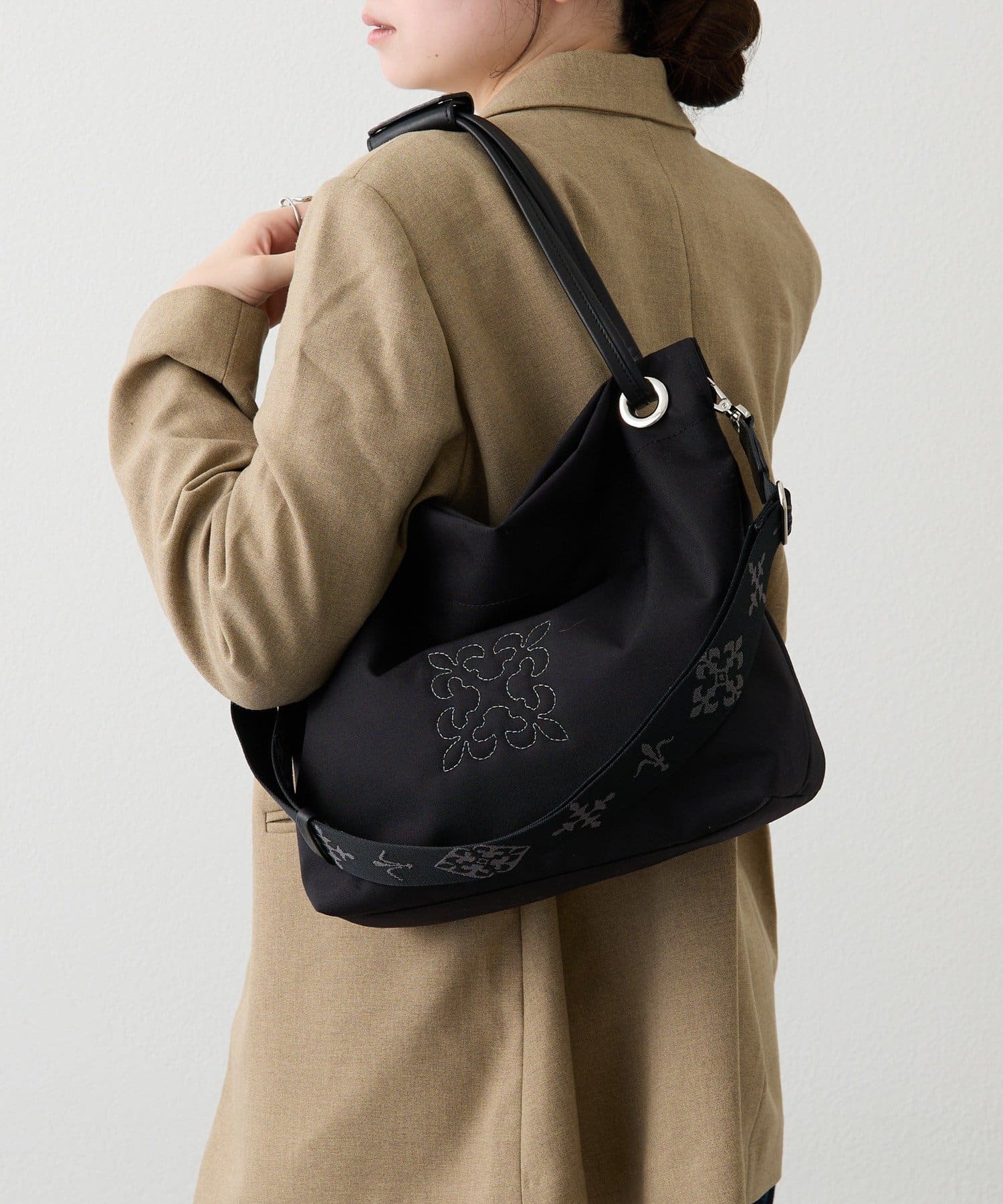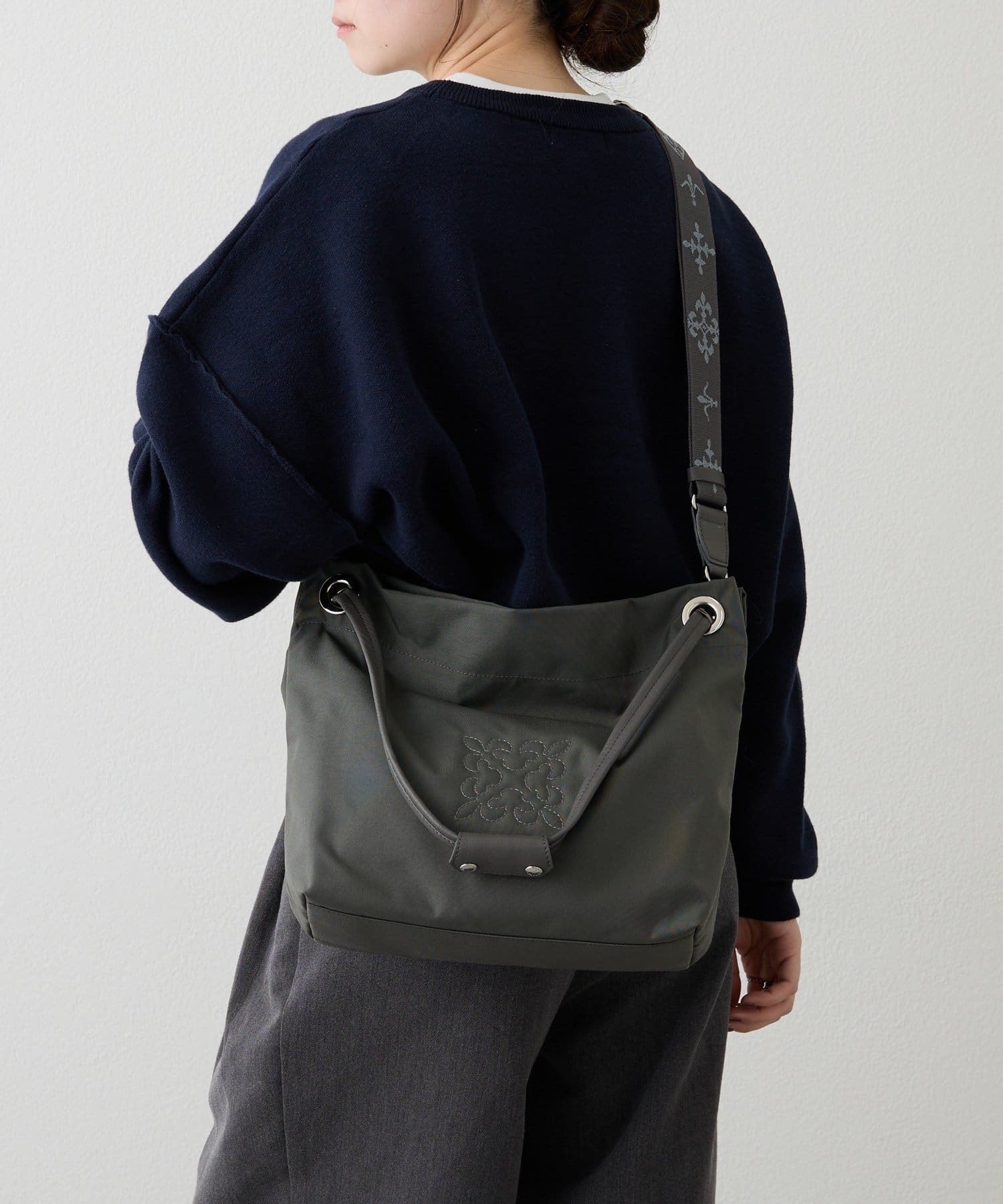 従来のひし形配置ではなく四角いグリッド状に施すことで、バッグ上部をくしゅっとさせても刺繍の美しさが際立つよう仕立てています。