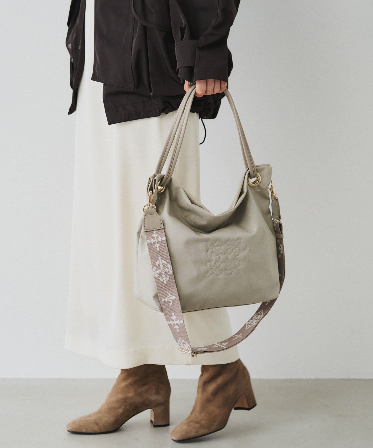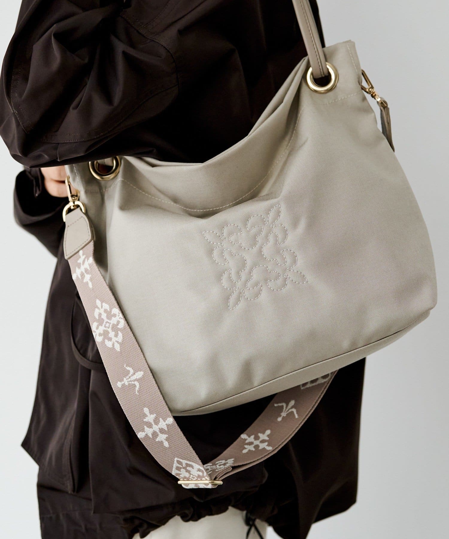 フロントのモノグラム刺繍が、品よく華やかなアクセントに。