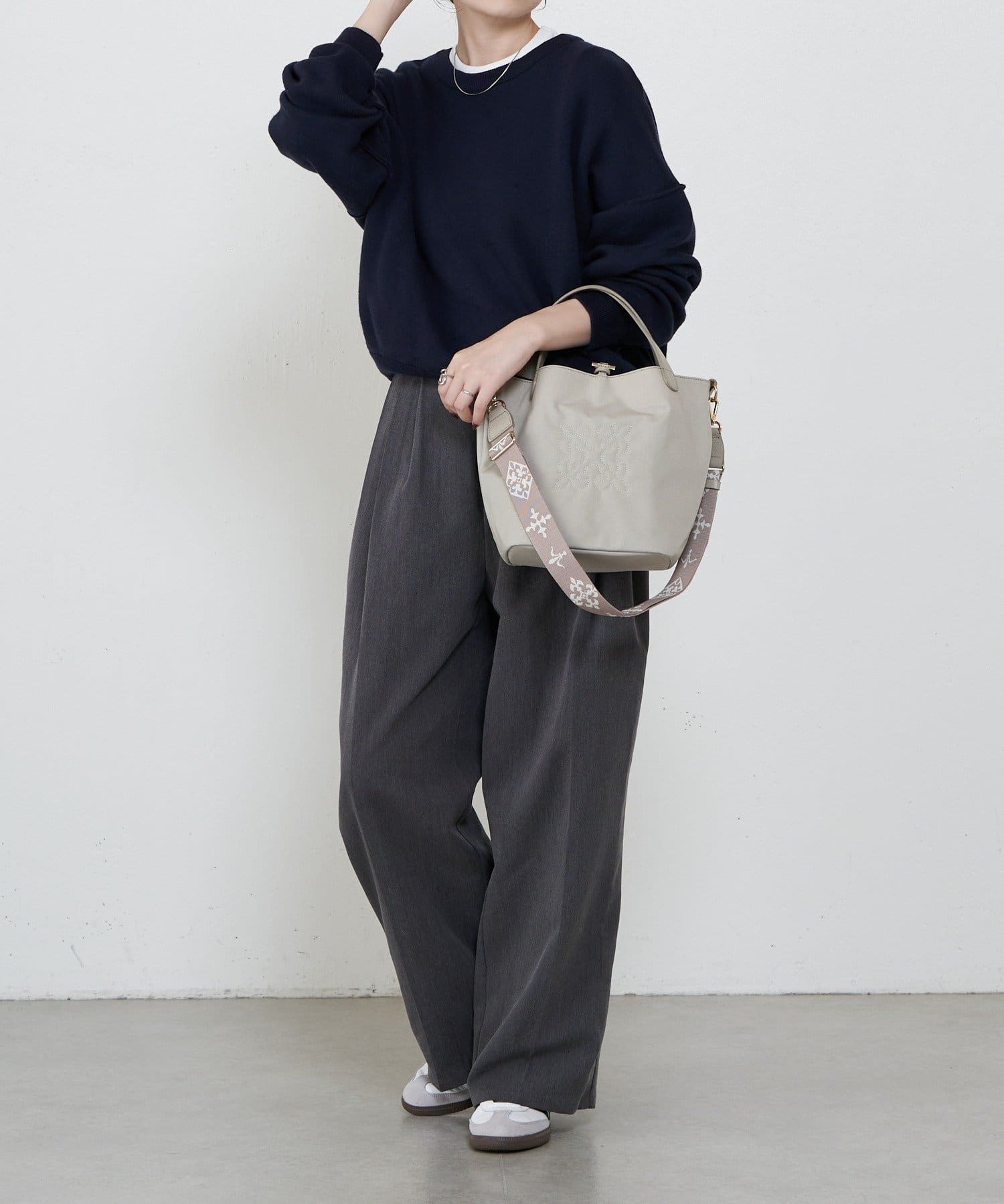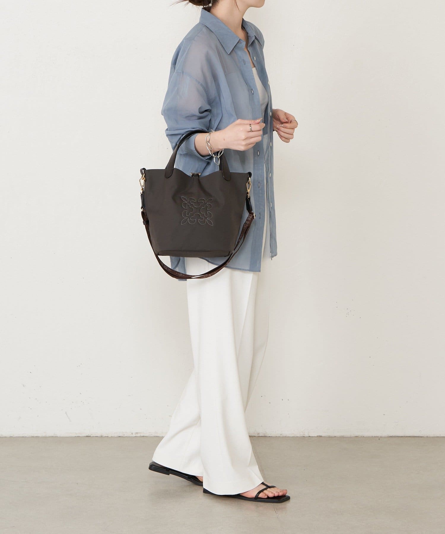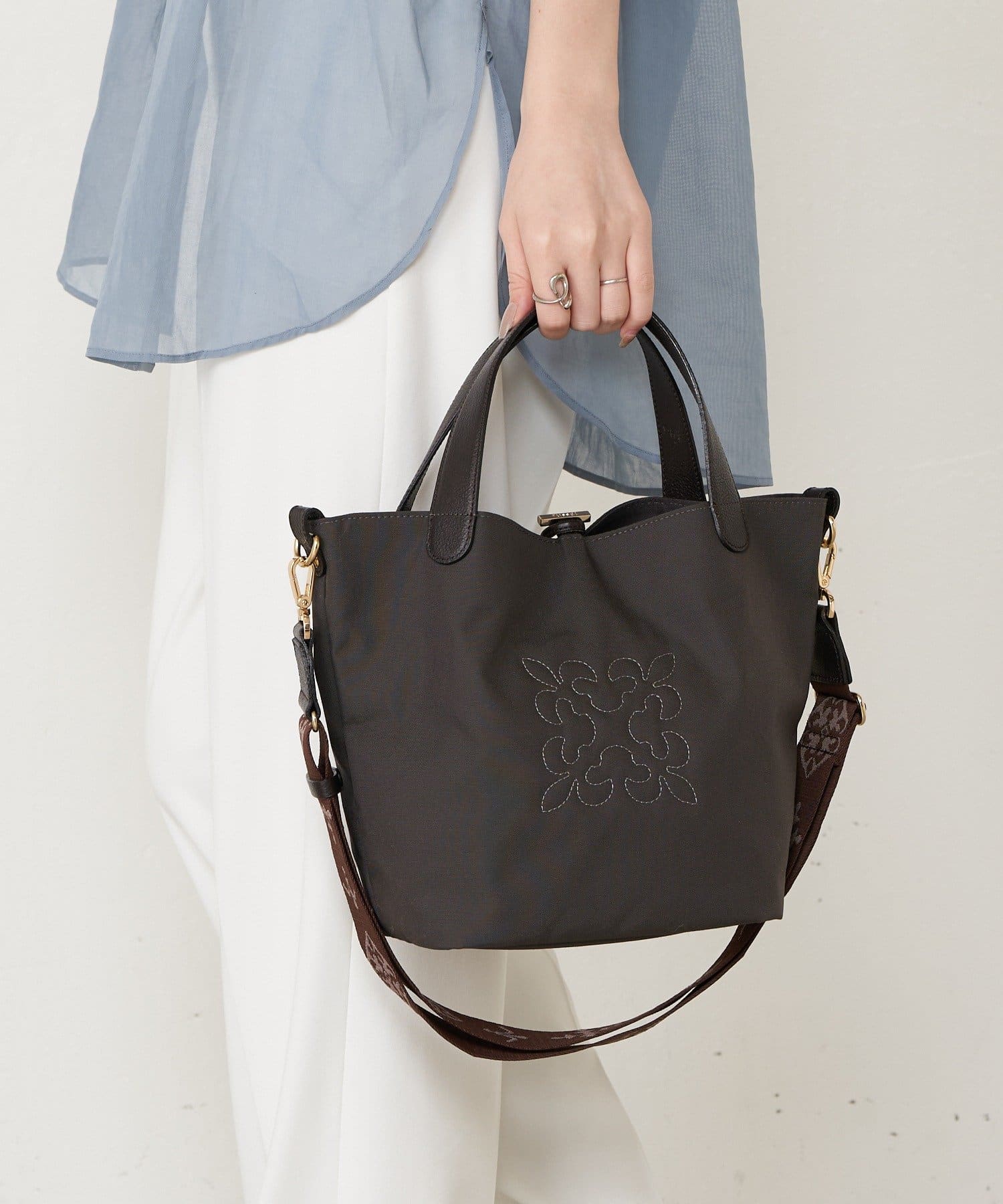 ショルダーベルトを付けてカジュアルに、ハンドル持ちで上品にと、