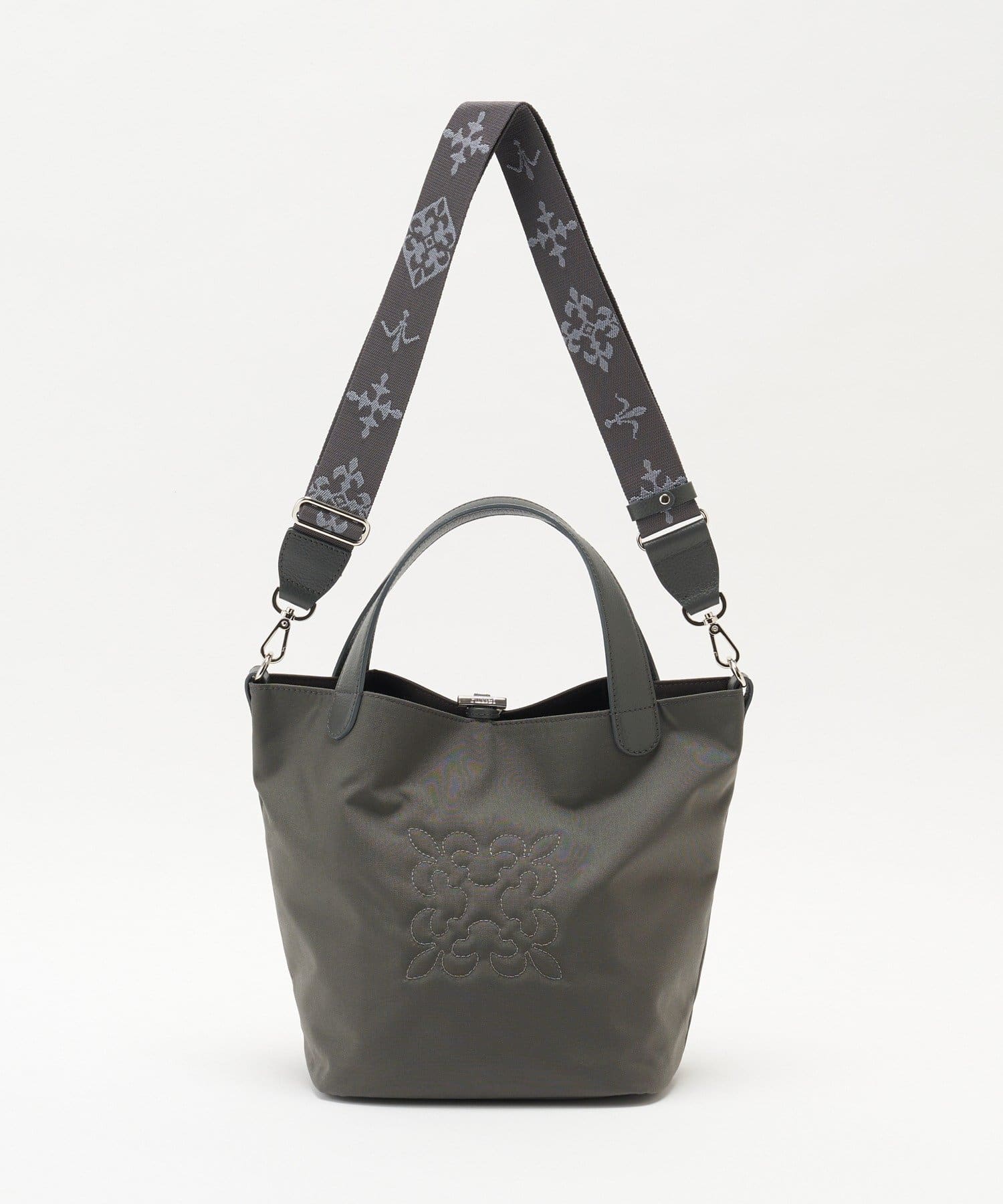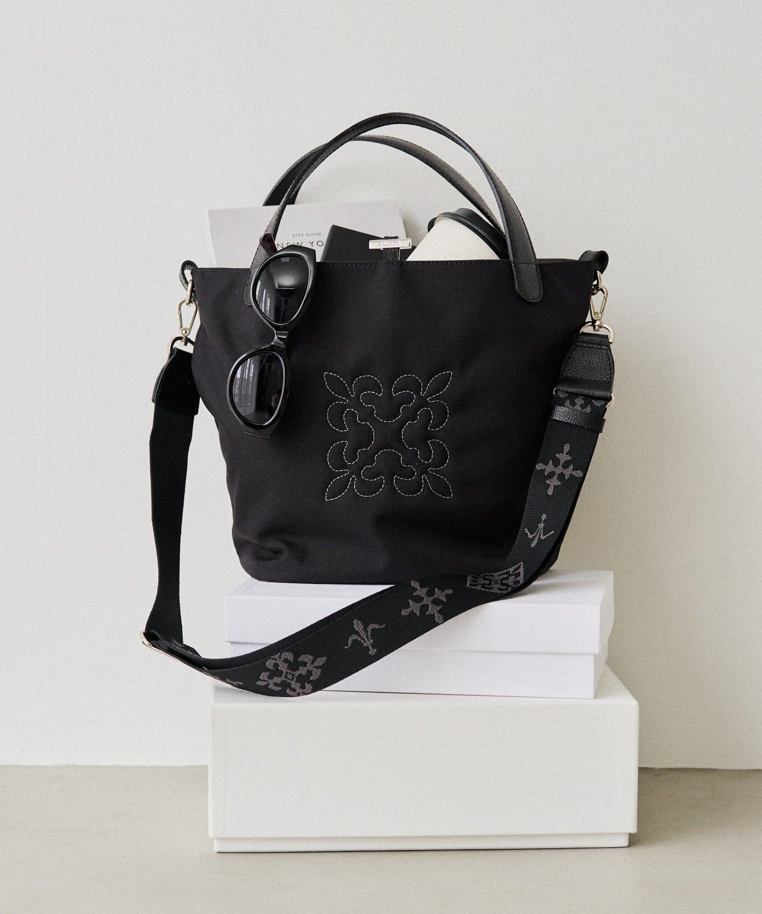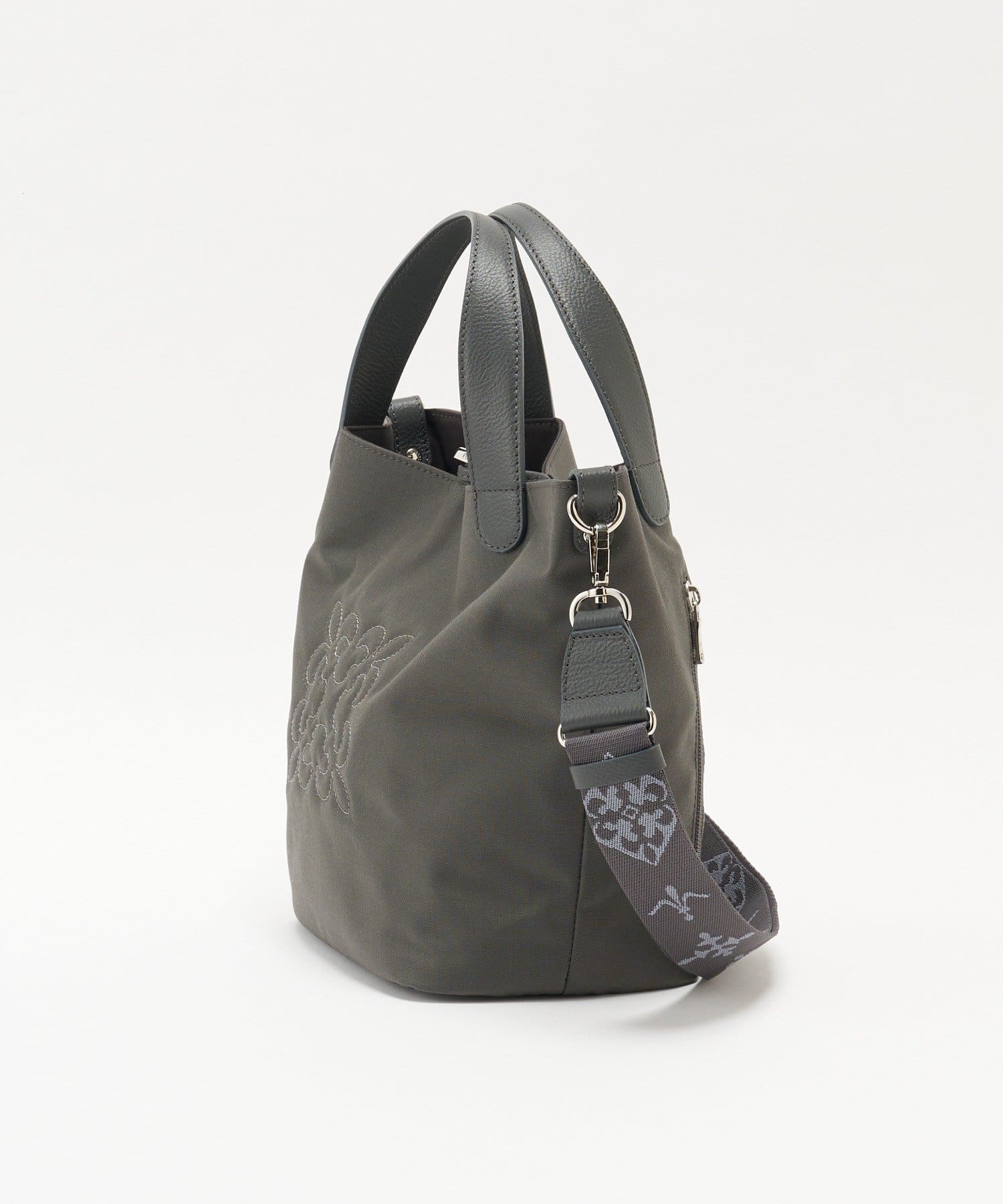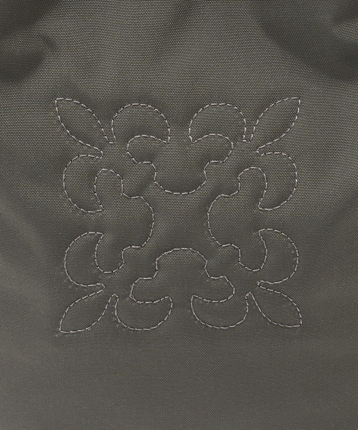 フロントのモノグラム刺繍が、上質なナイロン素材に立体感を添えています。