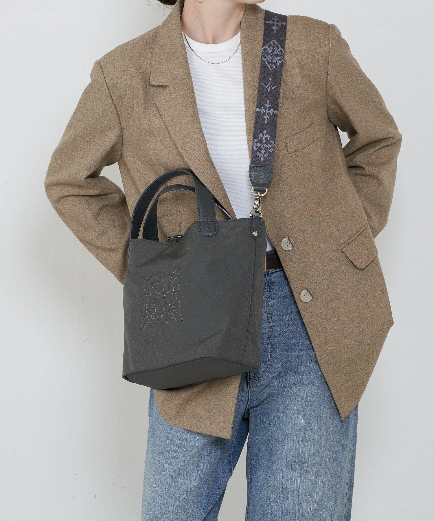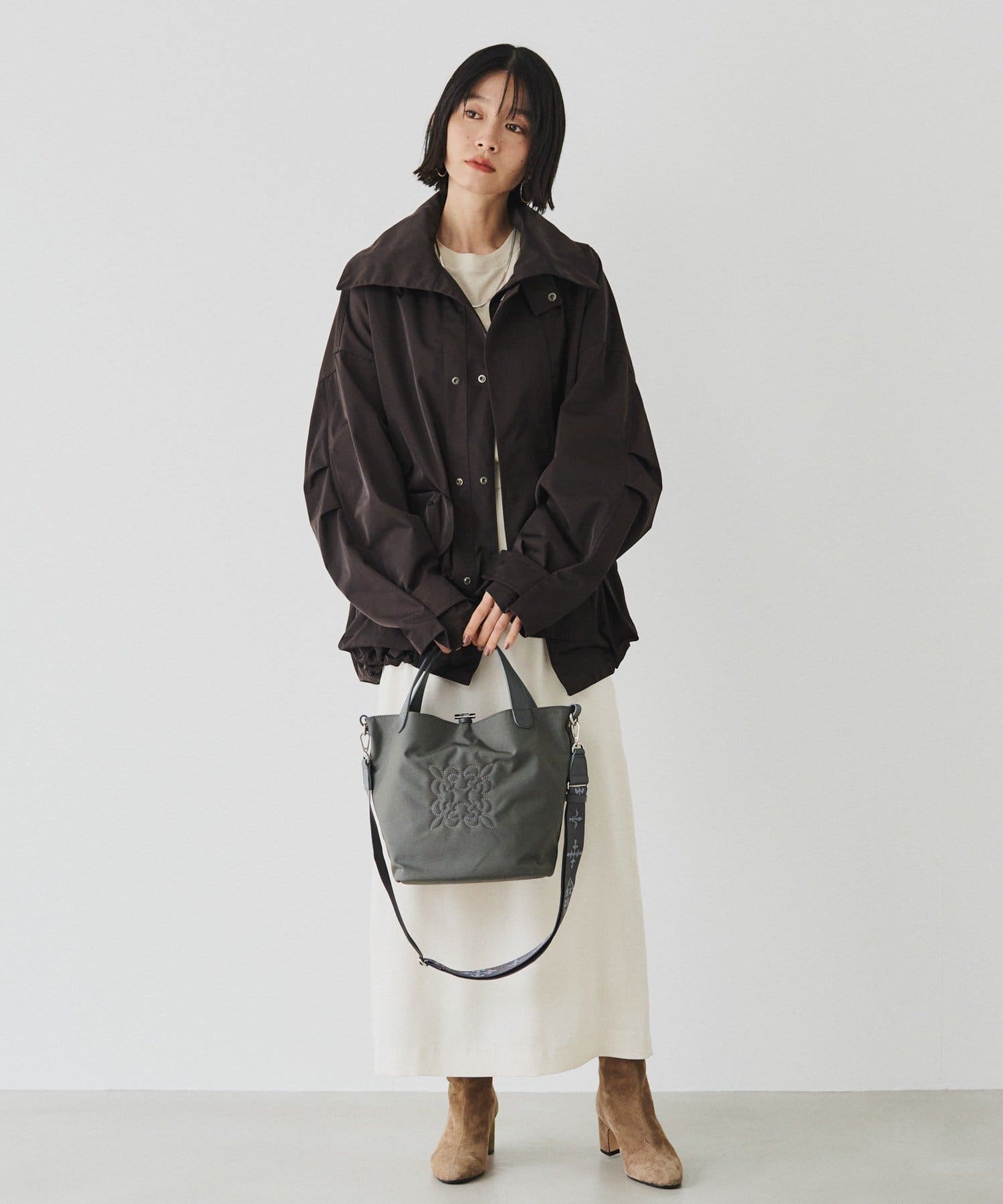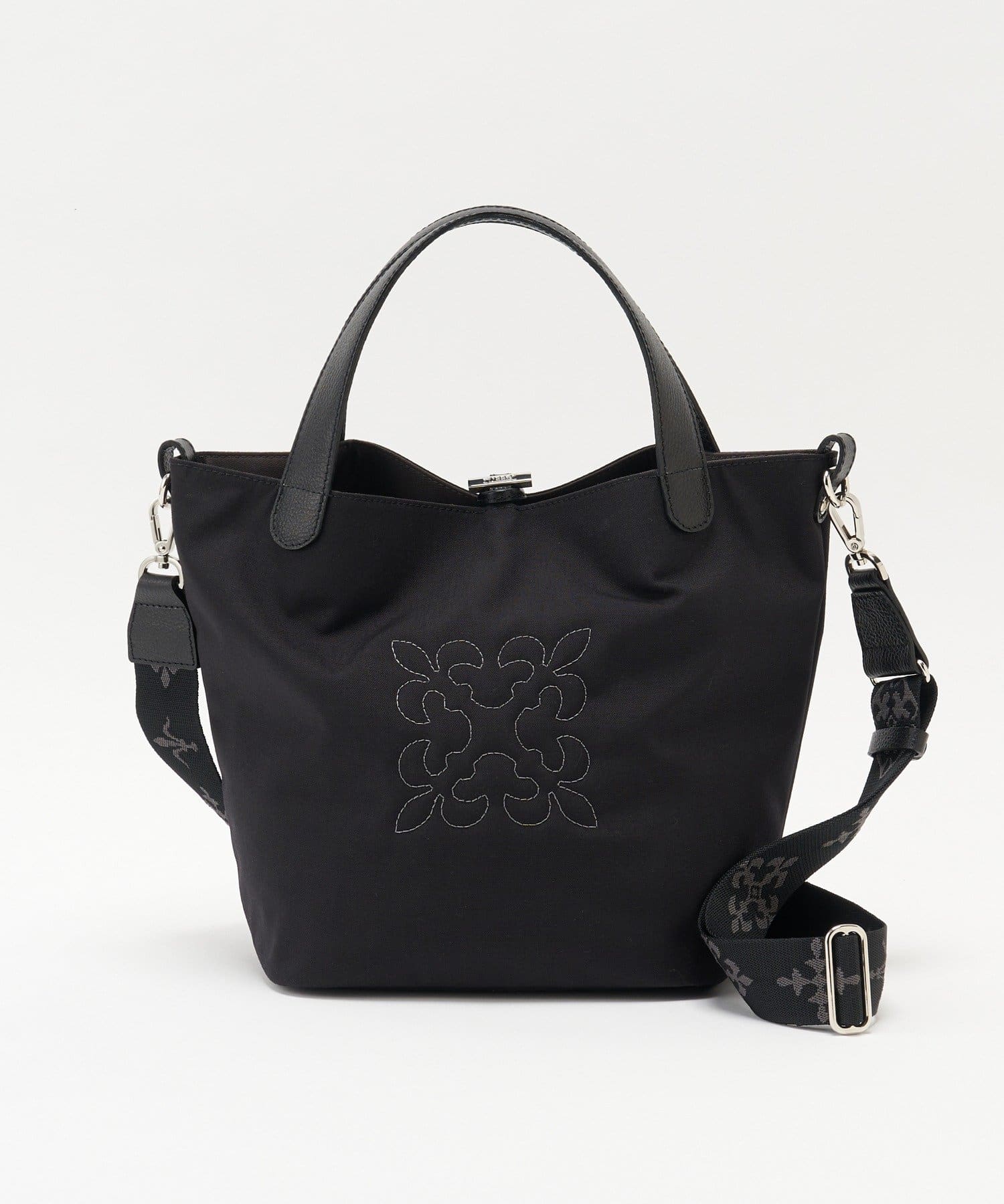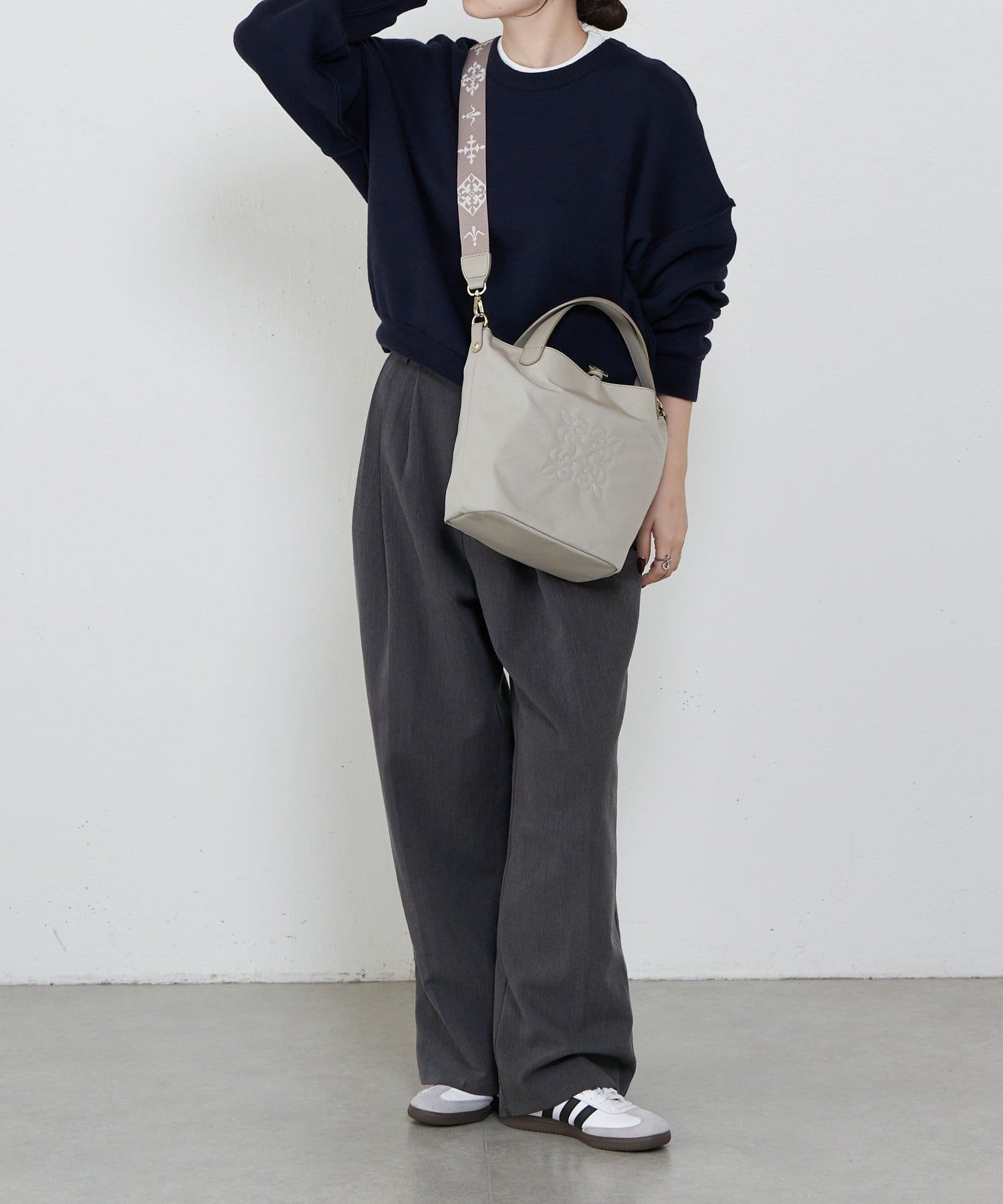フロントのモノグラム刺繍が、上質なナイロン素材に立体感を添えています。