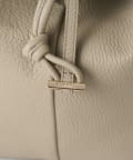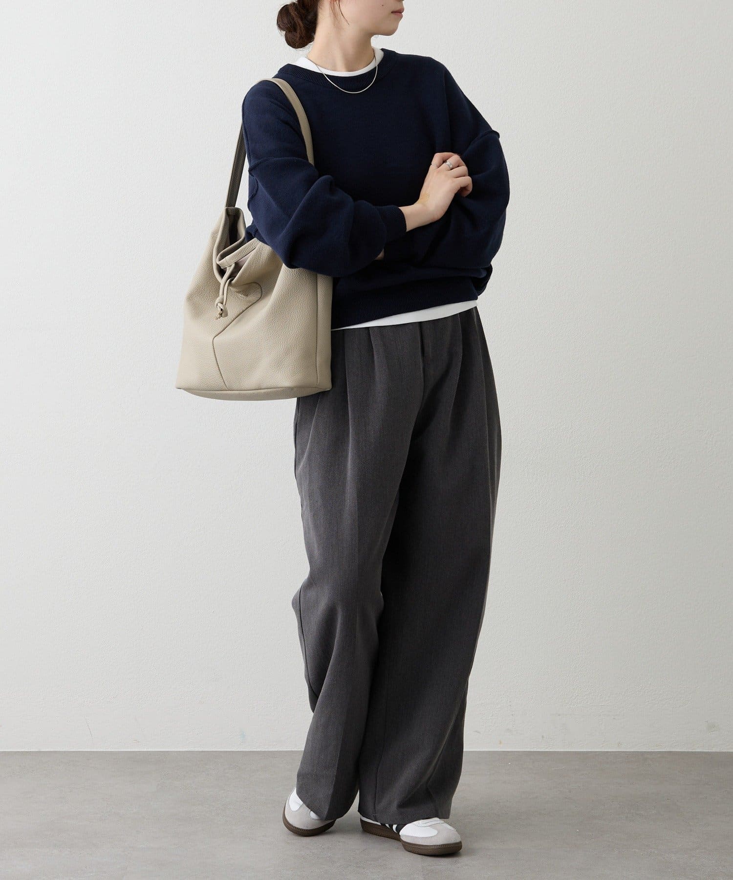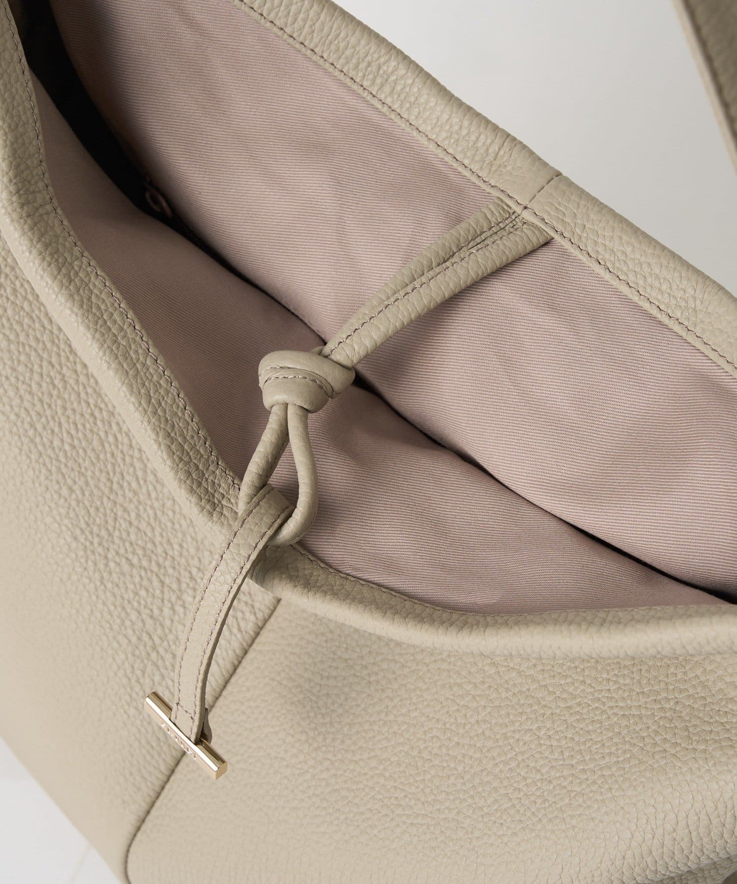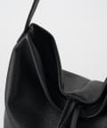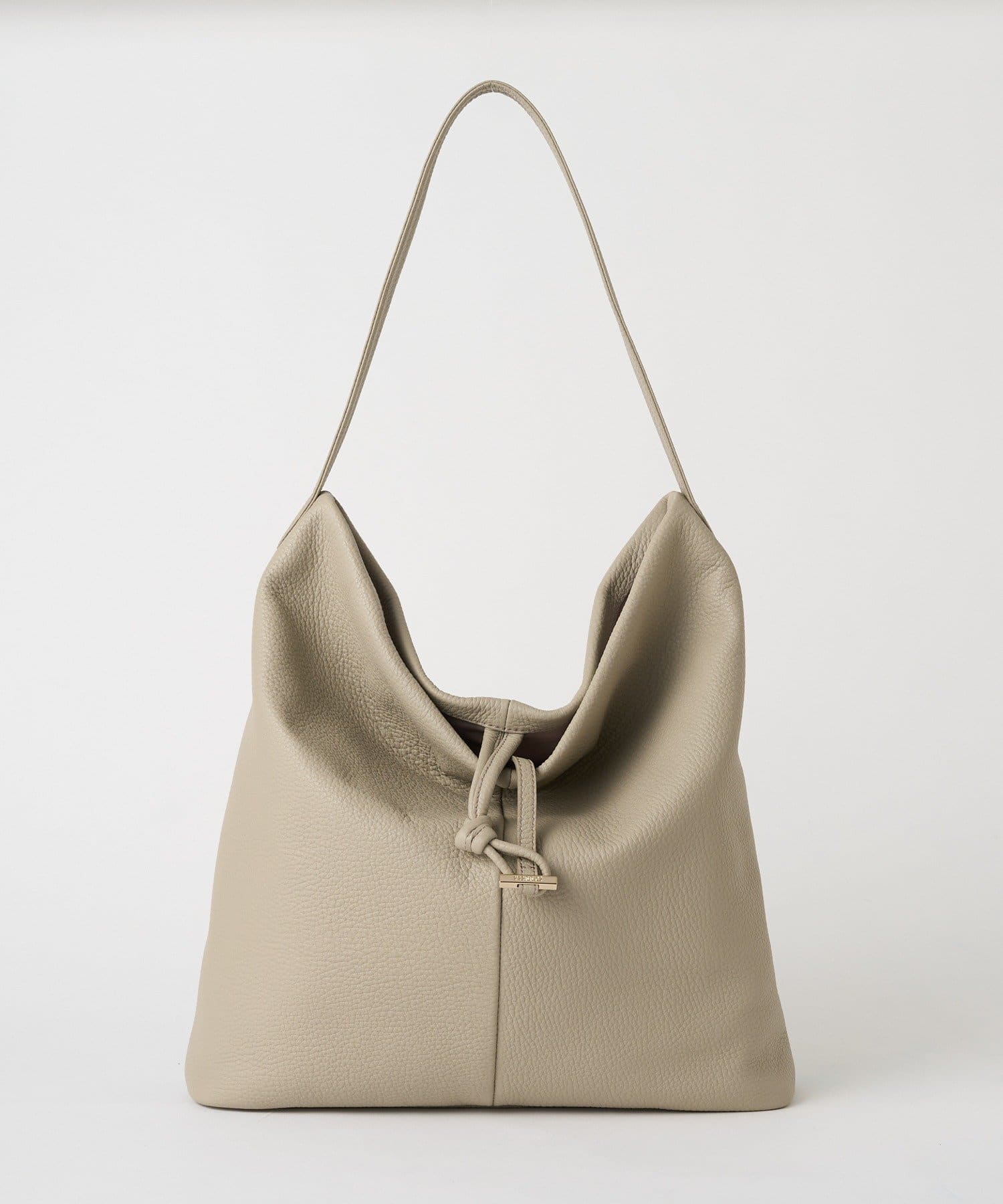 柔らかなレザーが生み出す自然なドレープが美しく、大きめバッグをゆるっと持つことで、こなれたムードを演出します。