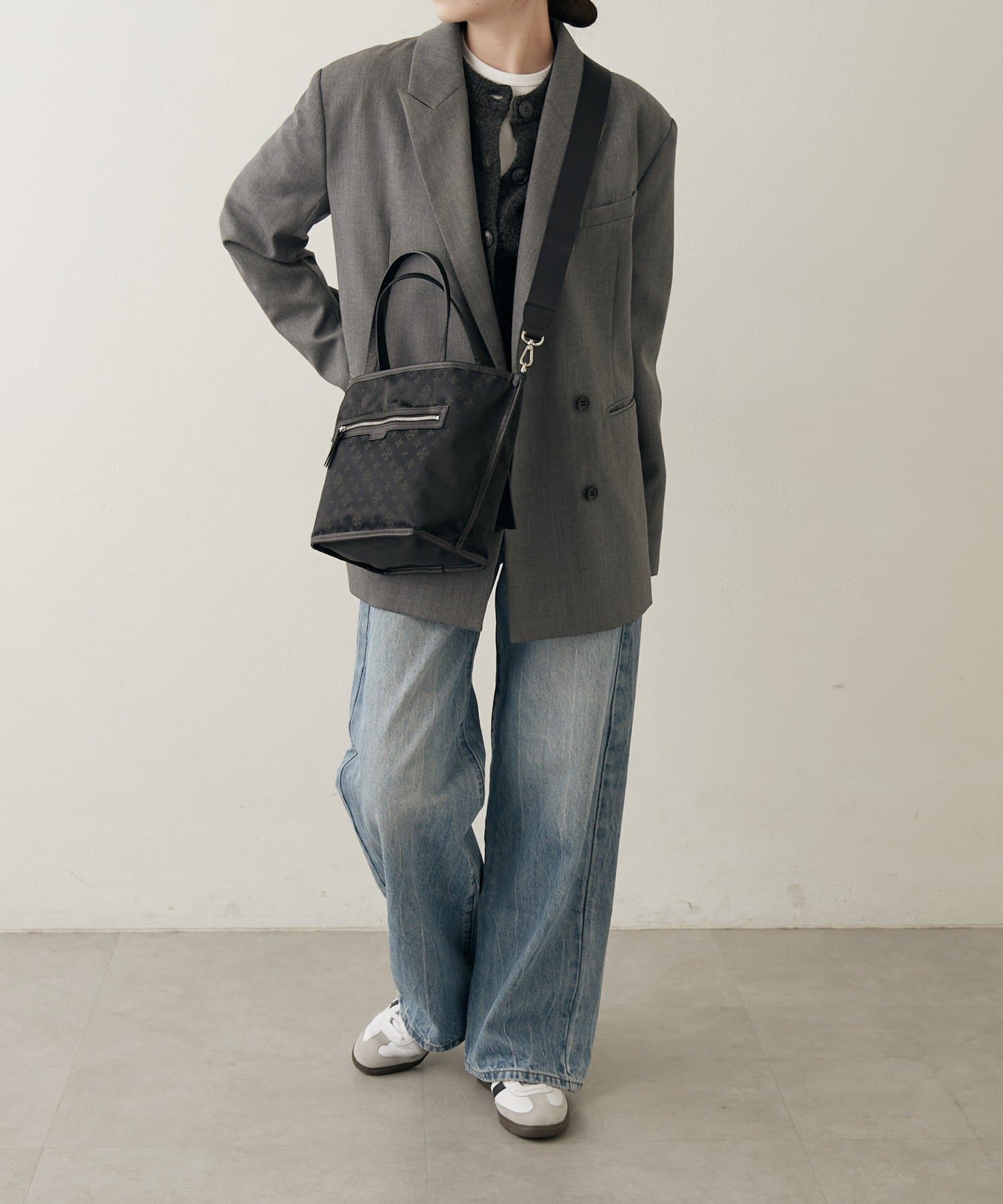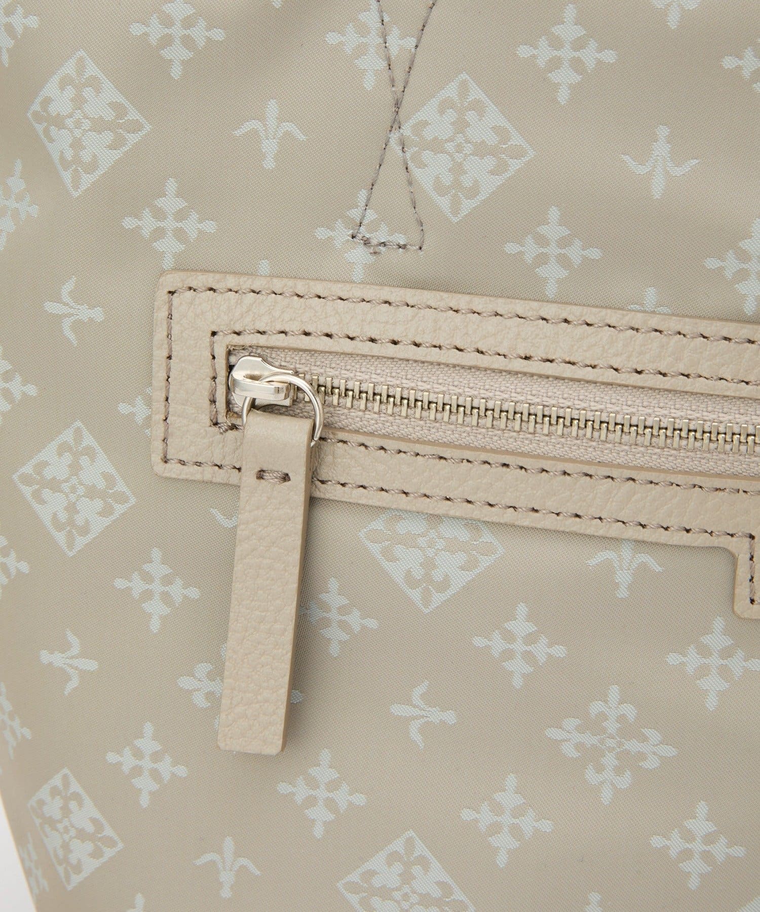 モノグラムジャガード面はレザーパイピングやファスナーポケットのディテールがアクセントになり、ほんのり特別感のあるデザインに仕上がっています。