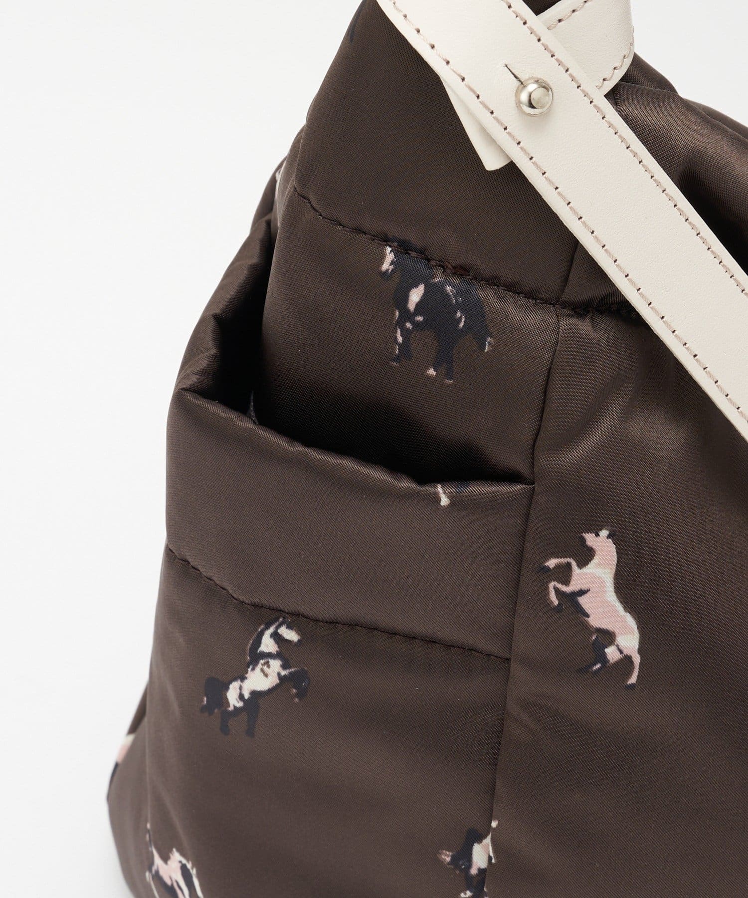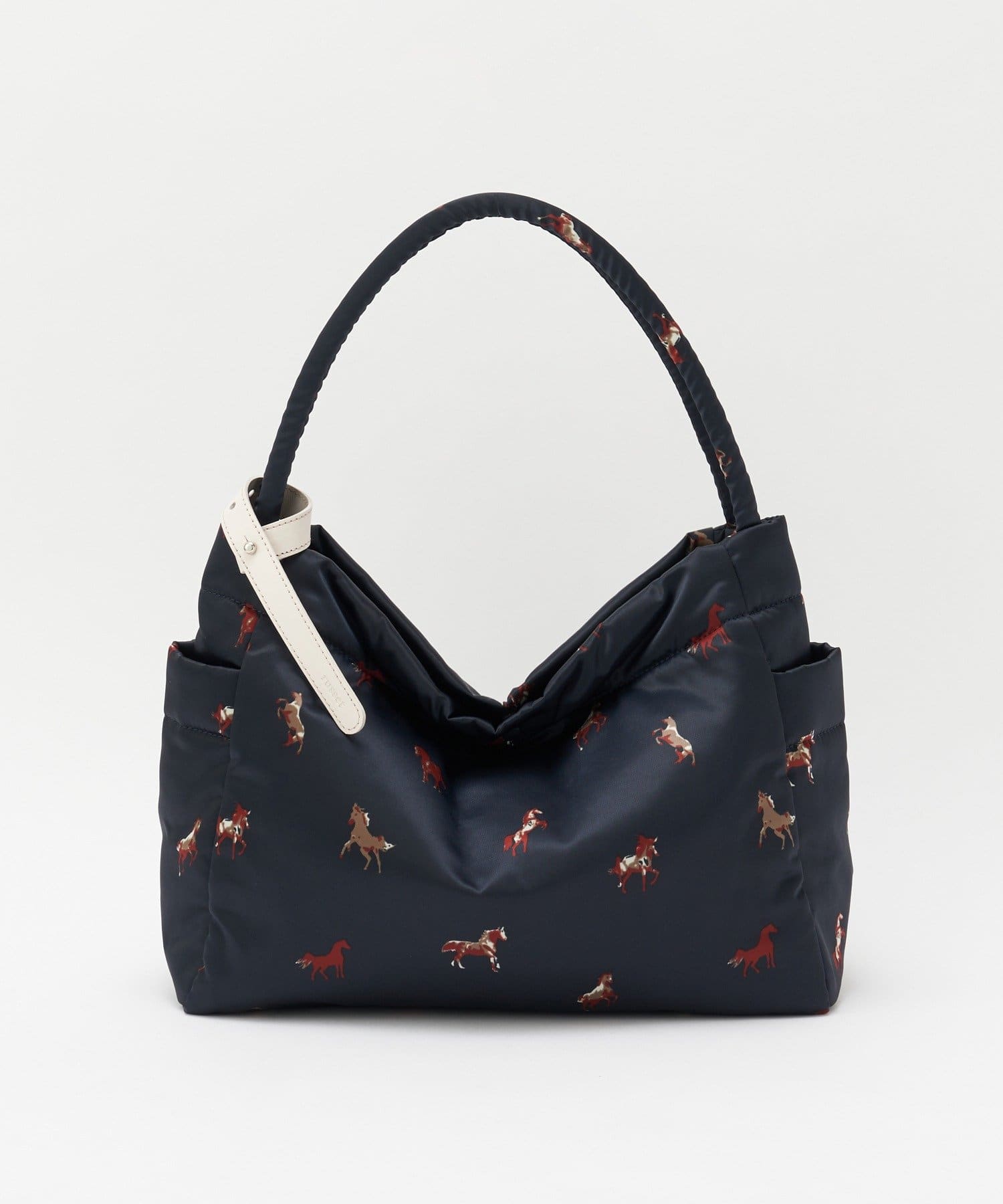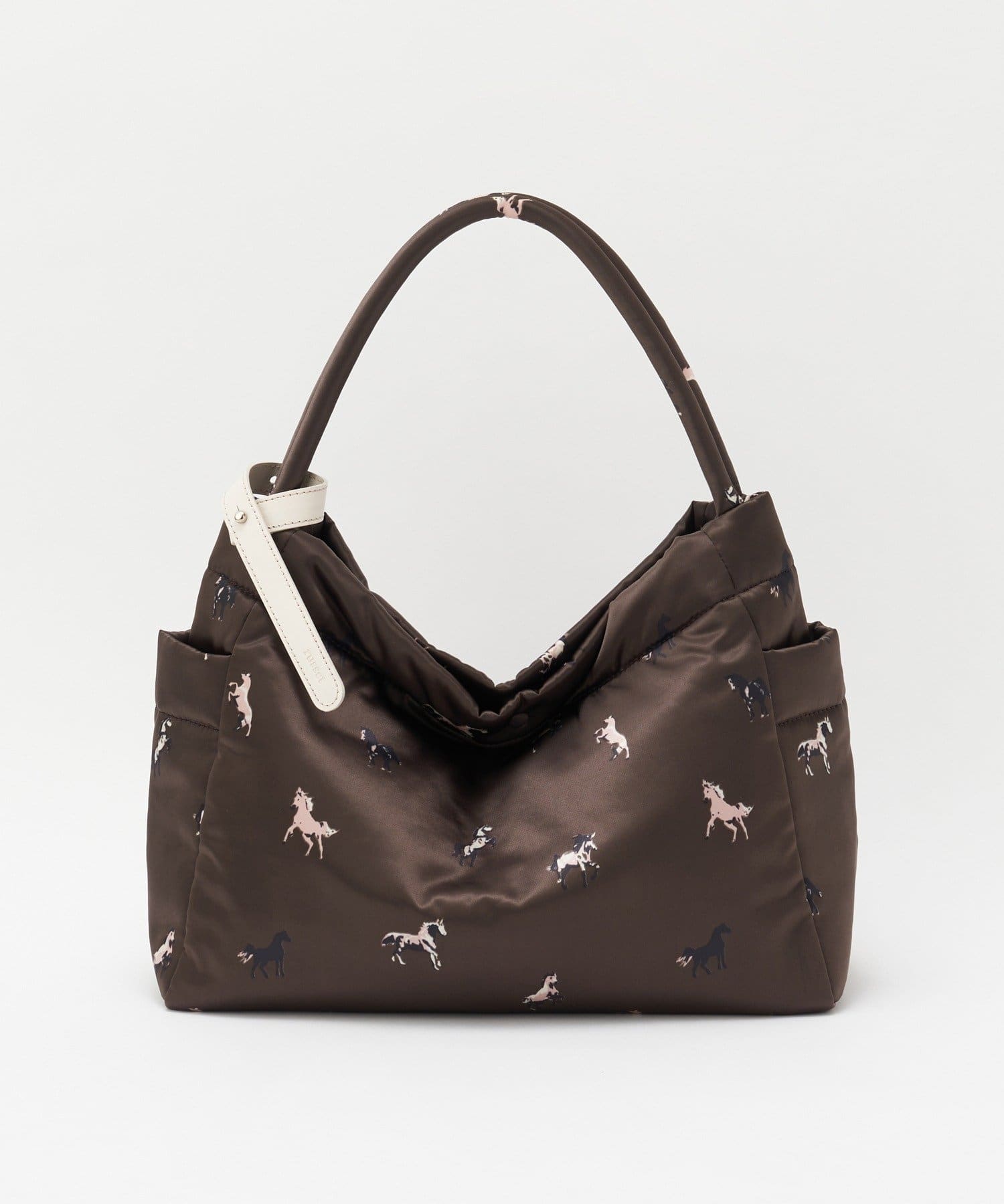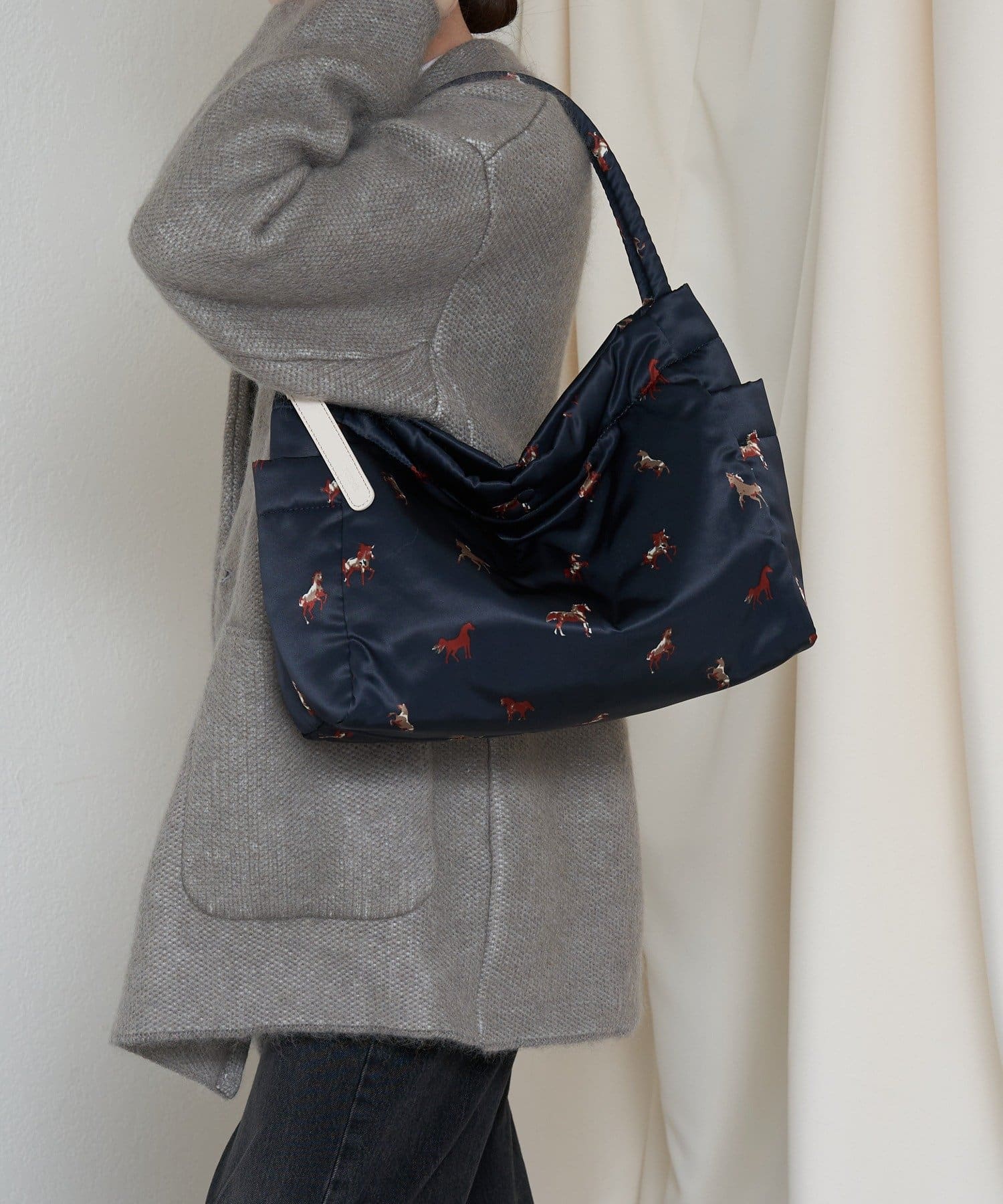 優しい光沢のナイロンにホースモチーフがさりげなくリズムを添え、装いを品よく引き立てます。