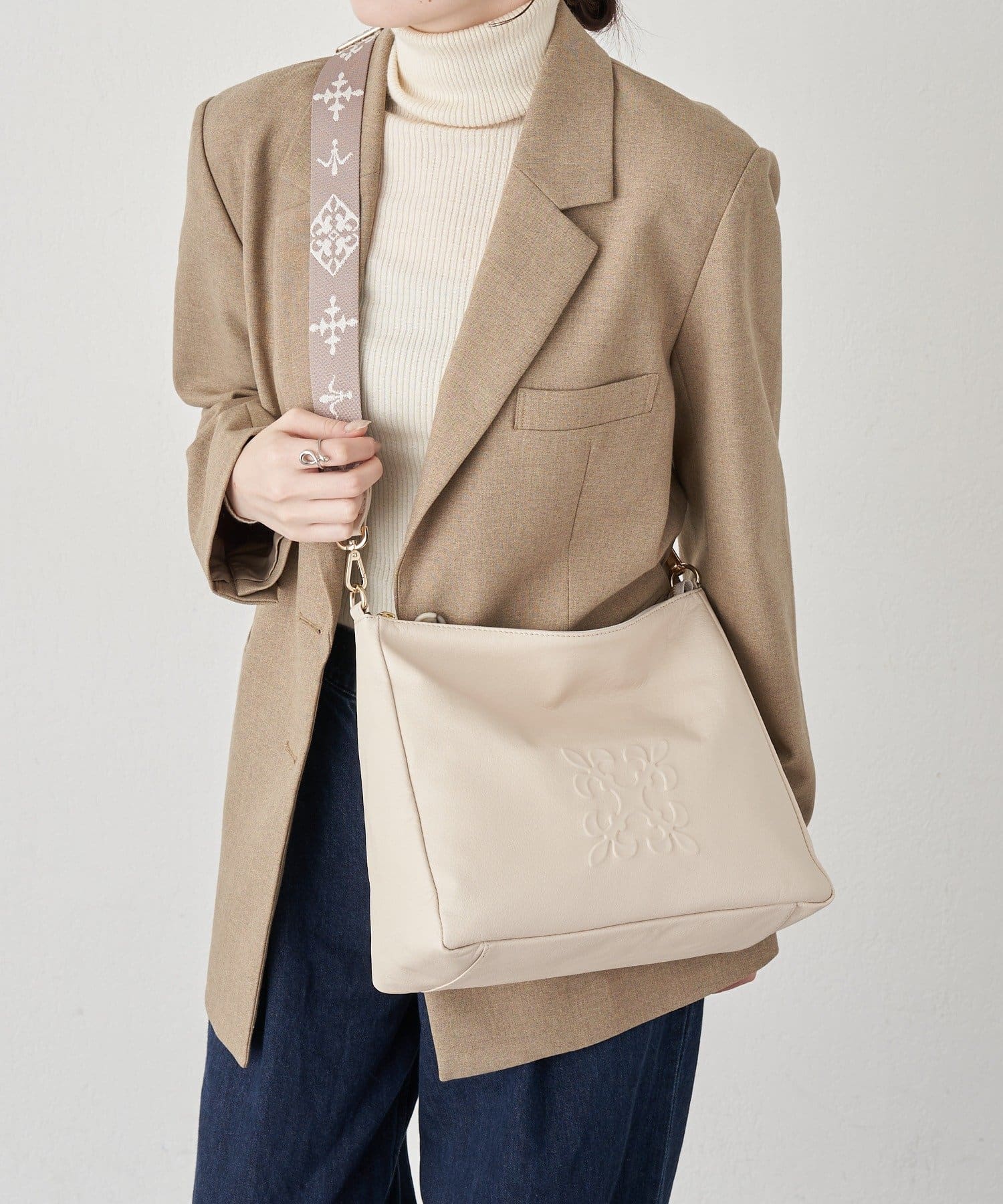 立体的なエンボスモノグラムが、シンプルコーデにさりげない華やかさを添えてくれる一品です。