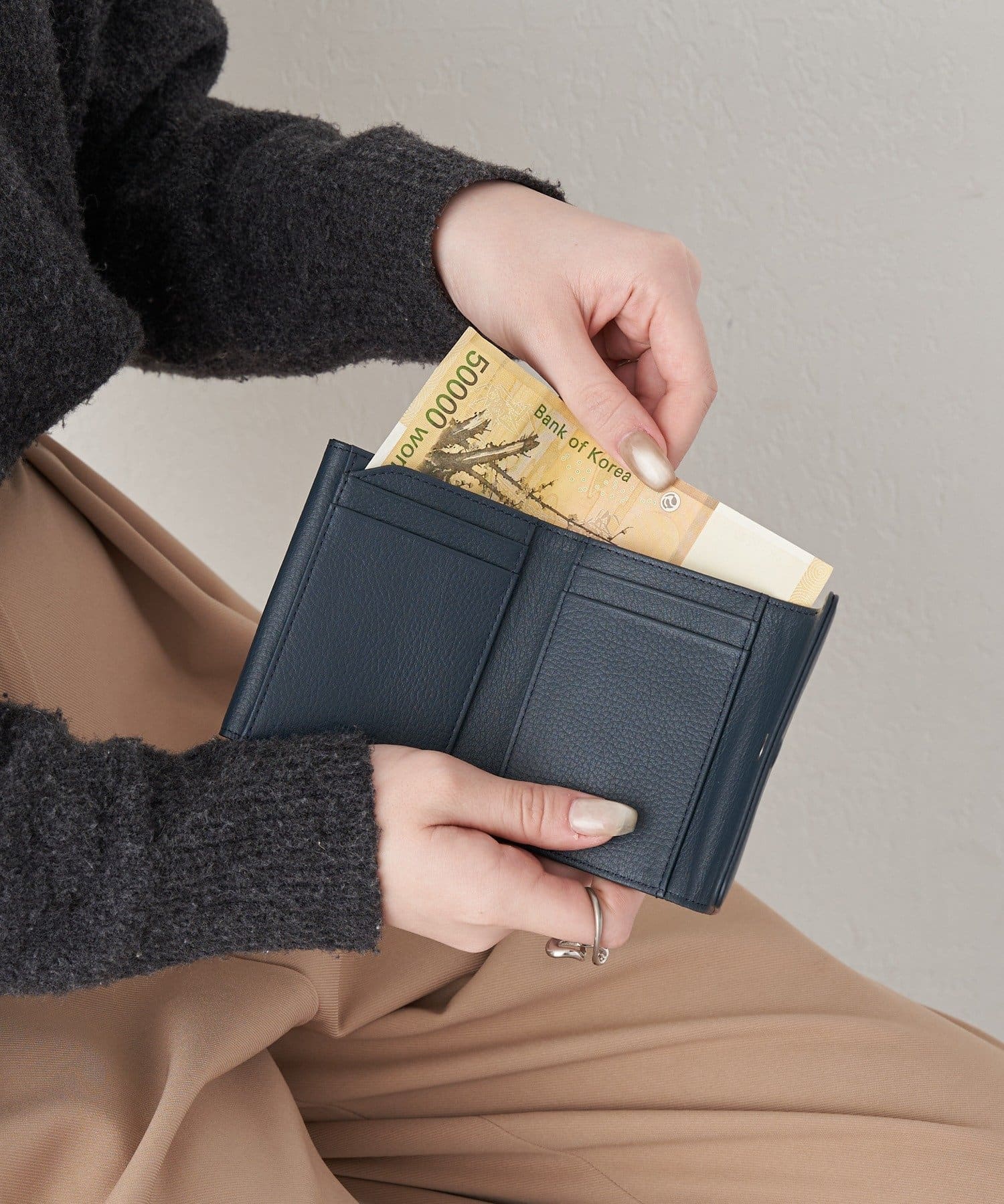 余計な装飾を抑えつつ、日々の使いやすさをしっかりプラスした〈シンプルプラス〉シリーズの三つ折りウォレット。