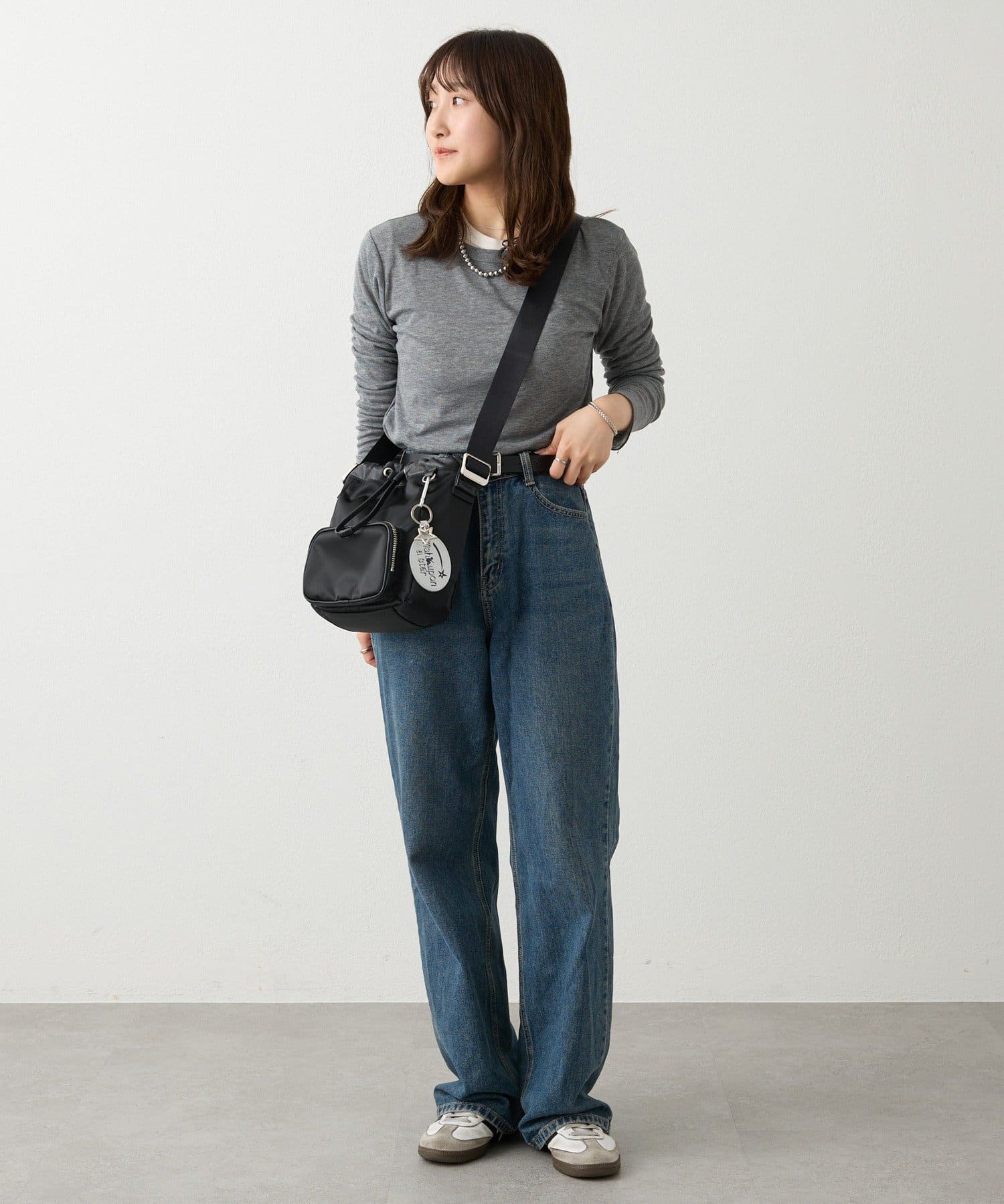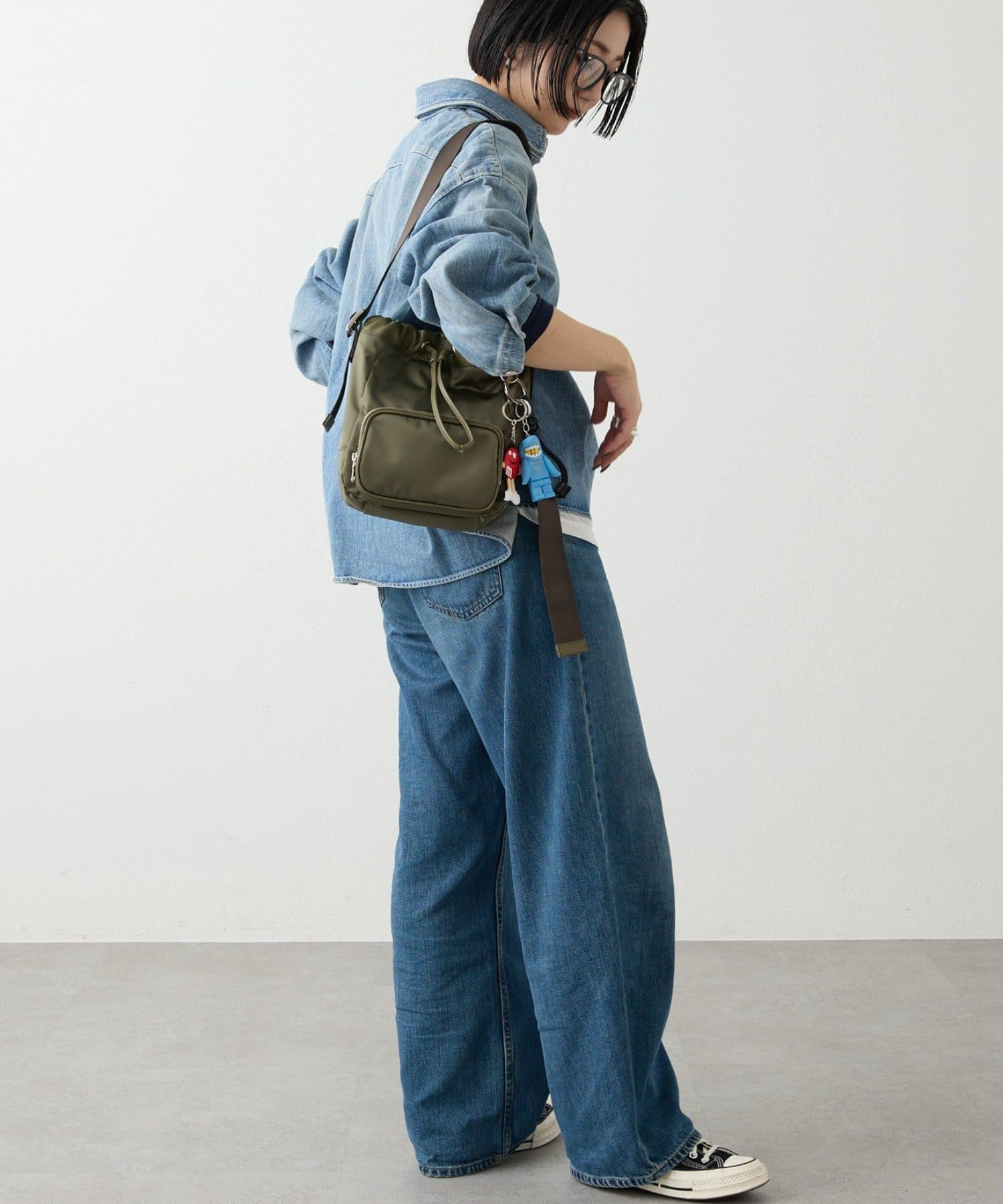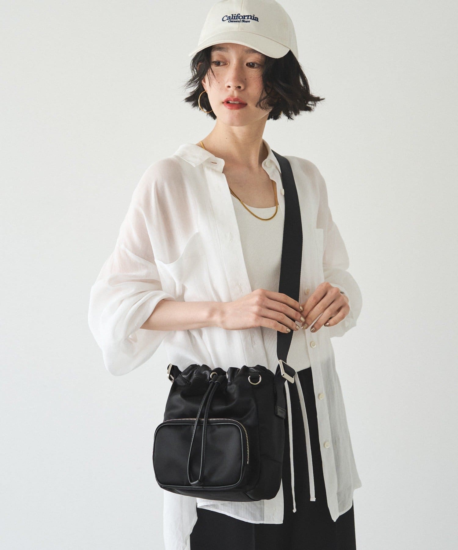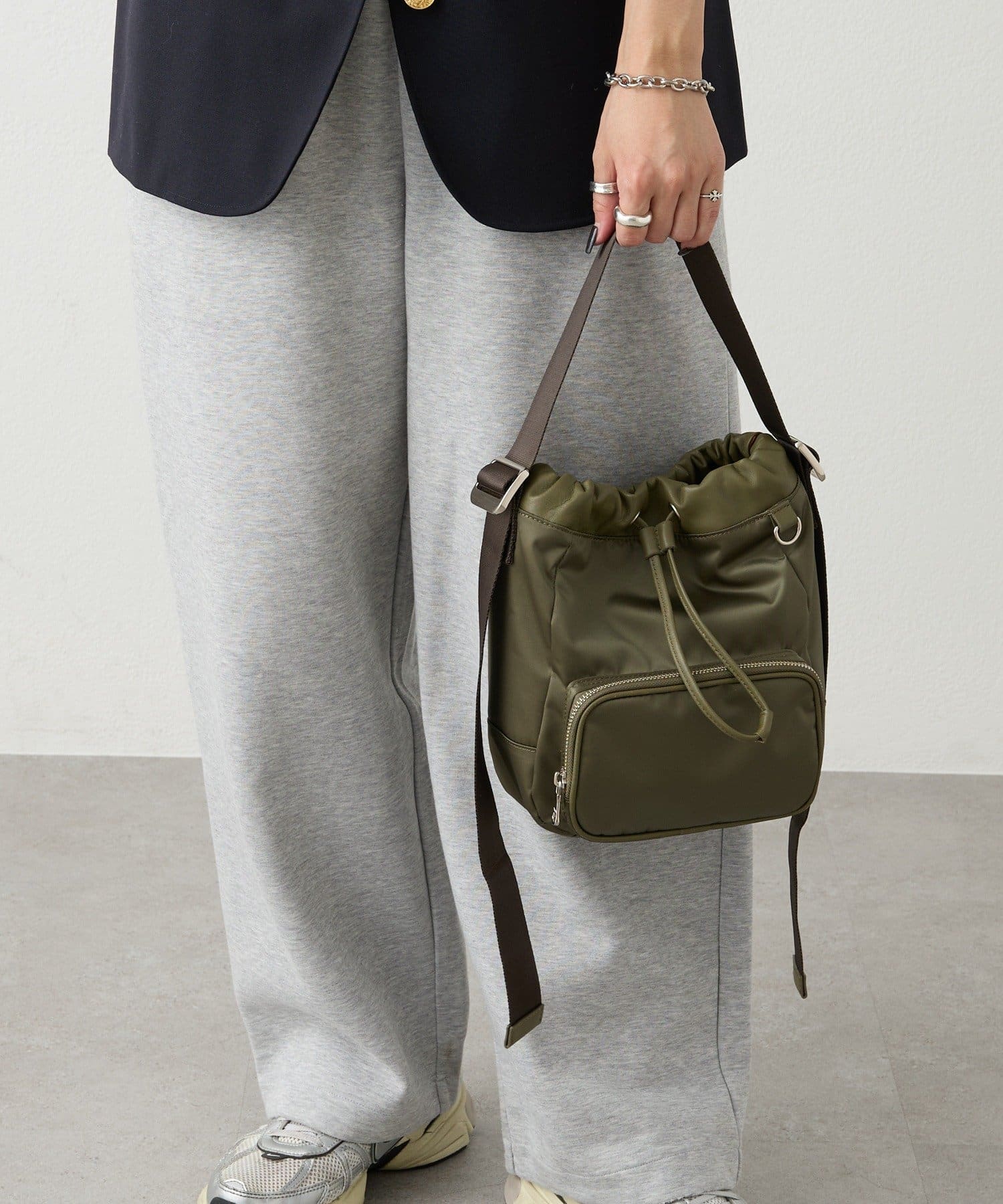 巾着の絞り具合やショルダーベルトの長さ調整によって、表情を変えて楽しめるデザイン。