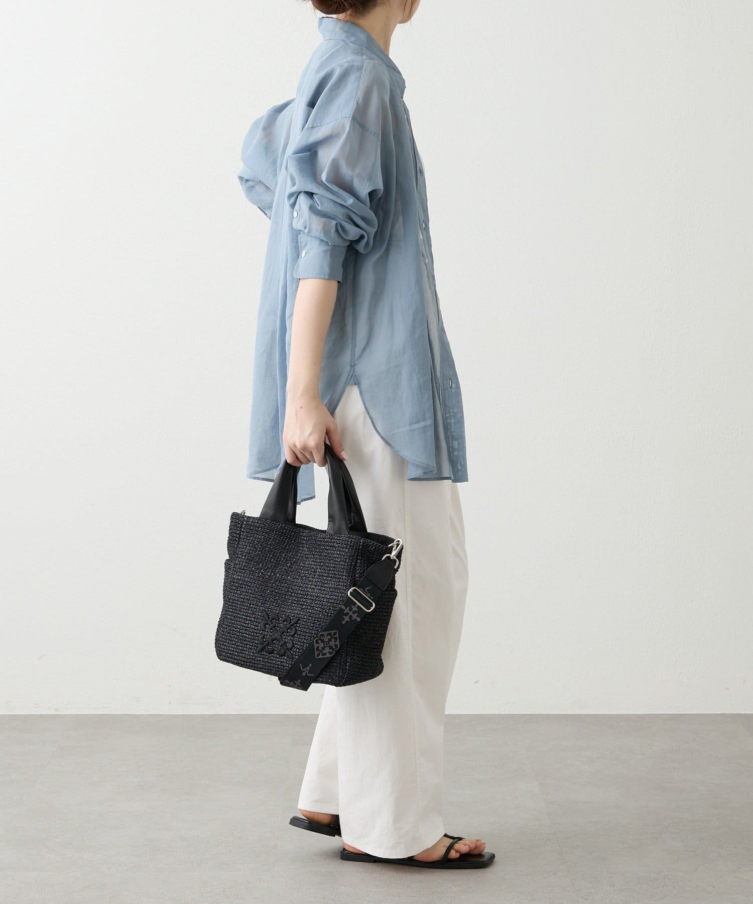 涼やかなラフィアの表情を、軽やかで扱いやすいナイロン素材で表現した2WAYトートバッグ。