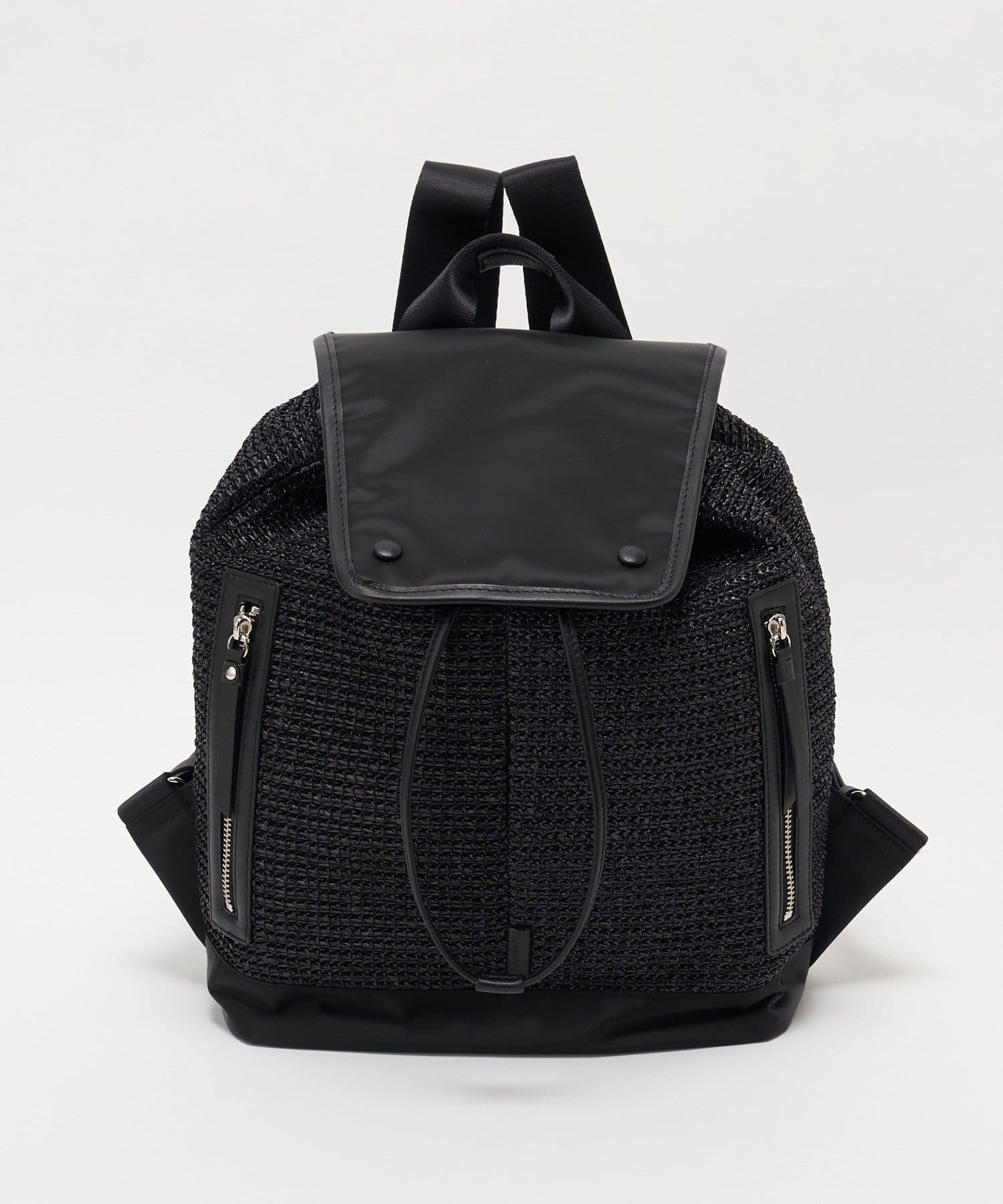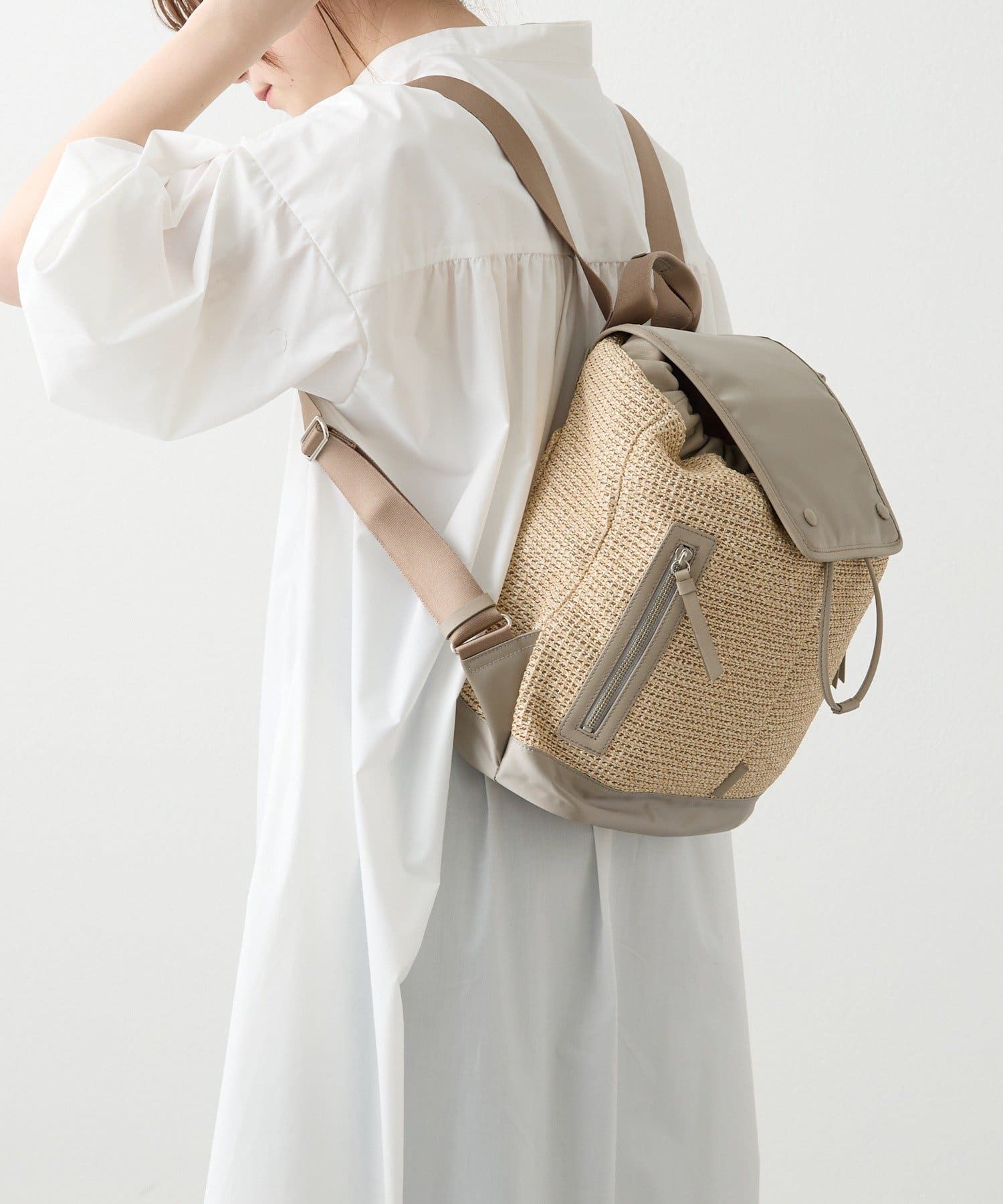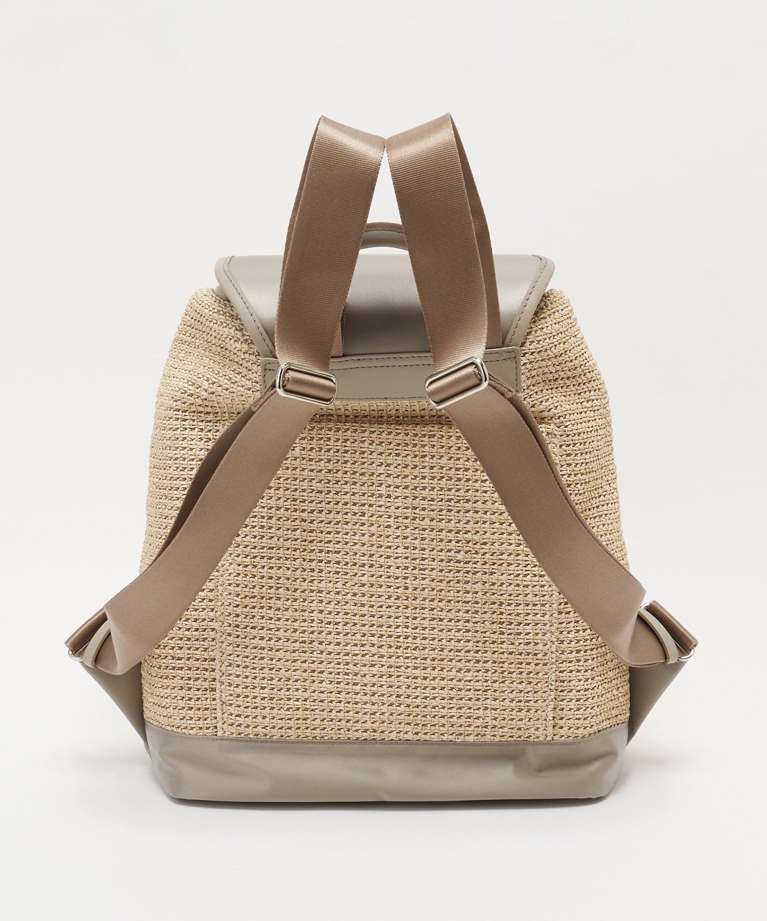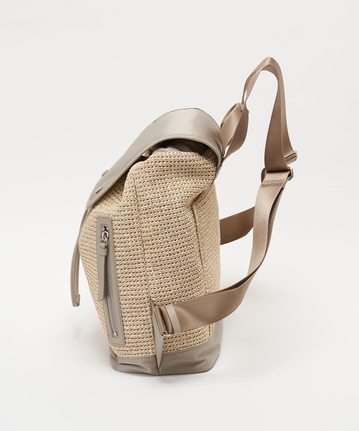 ナチュラルなラフィアの表情に、機能性素材を掛け合わせたコンビリュックサック。