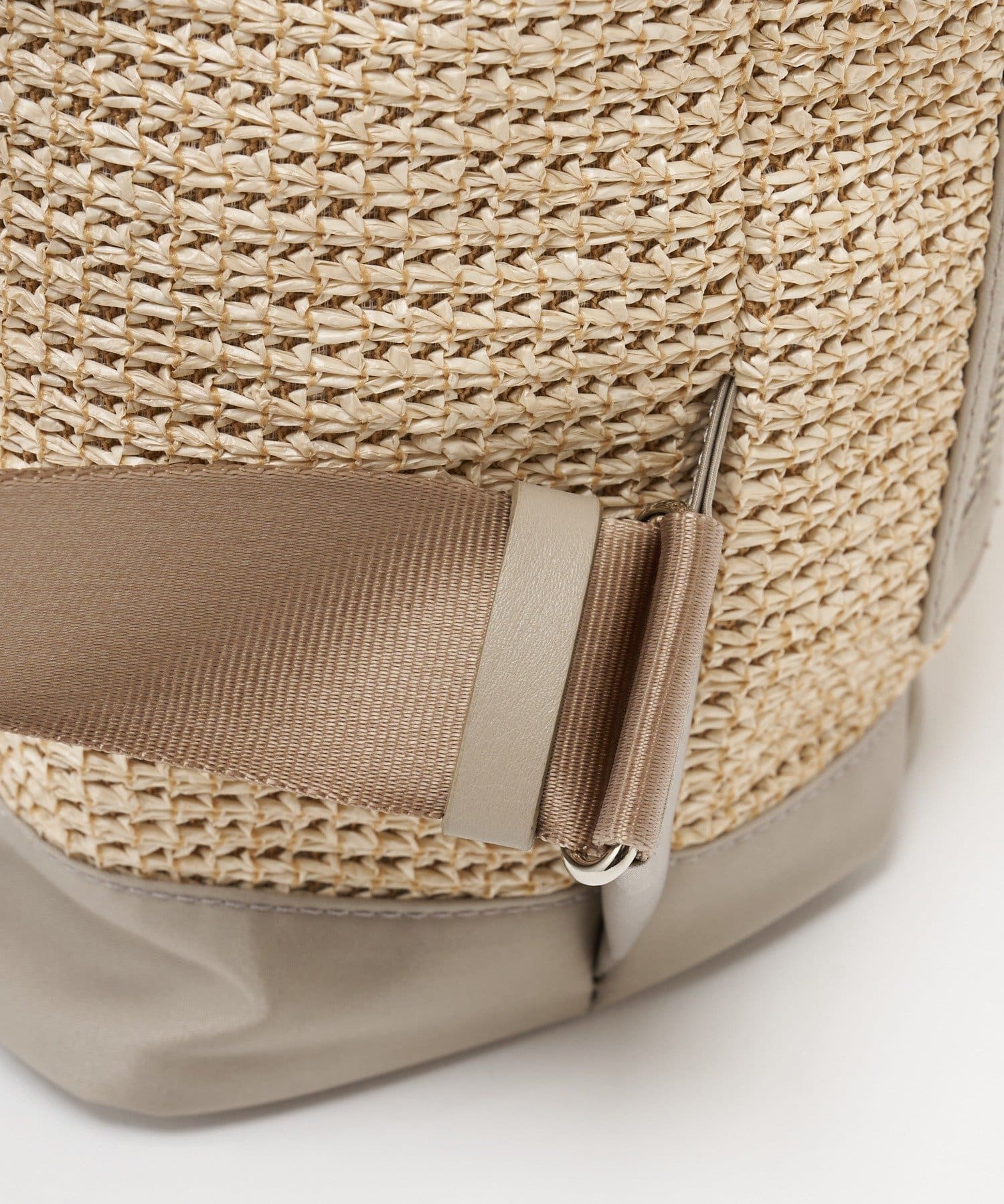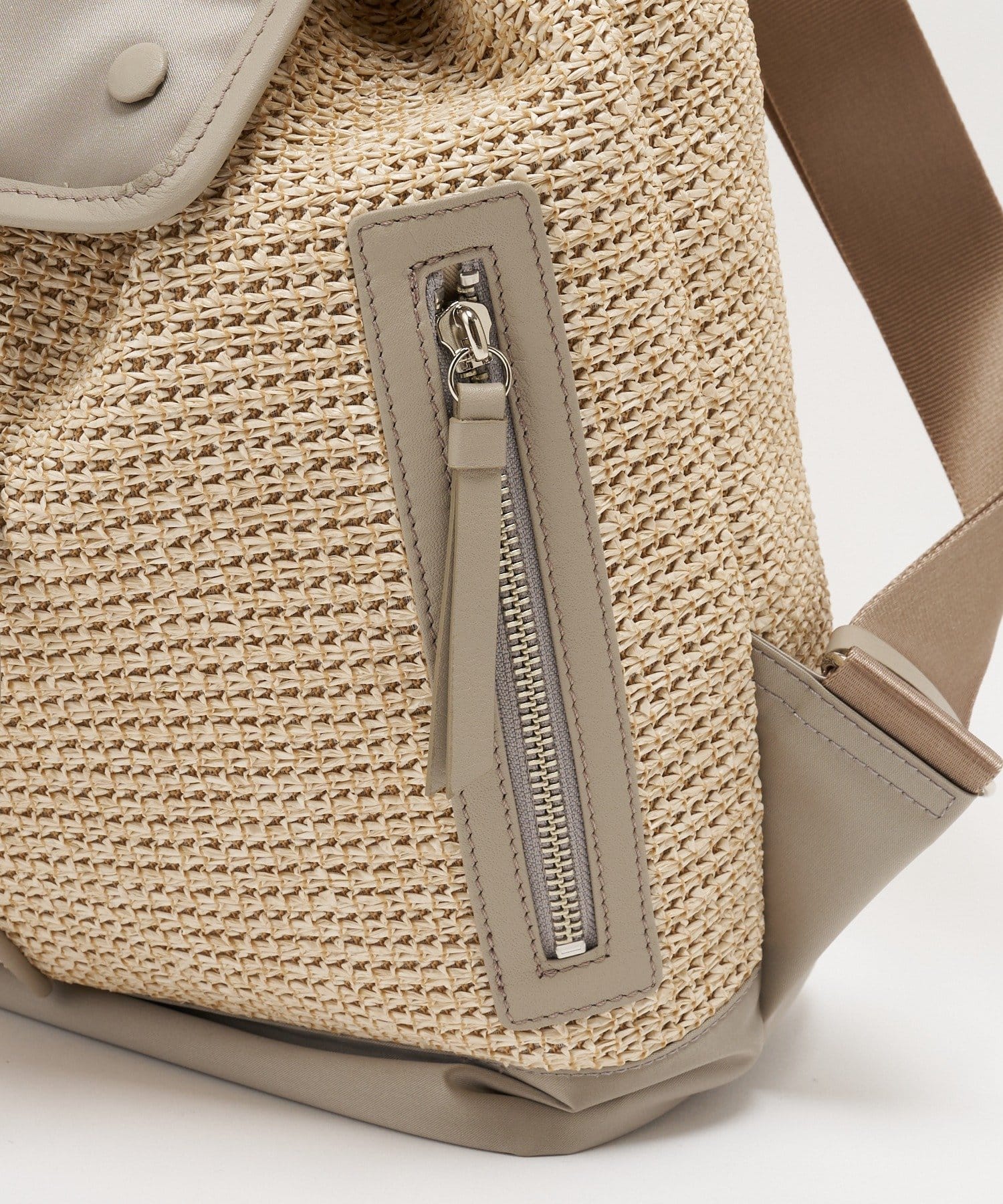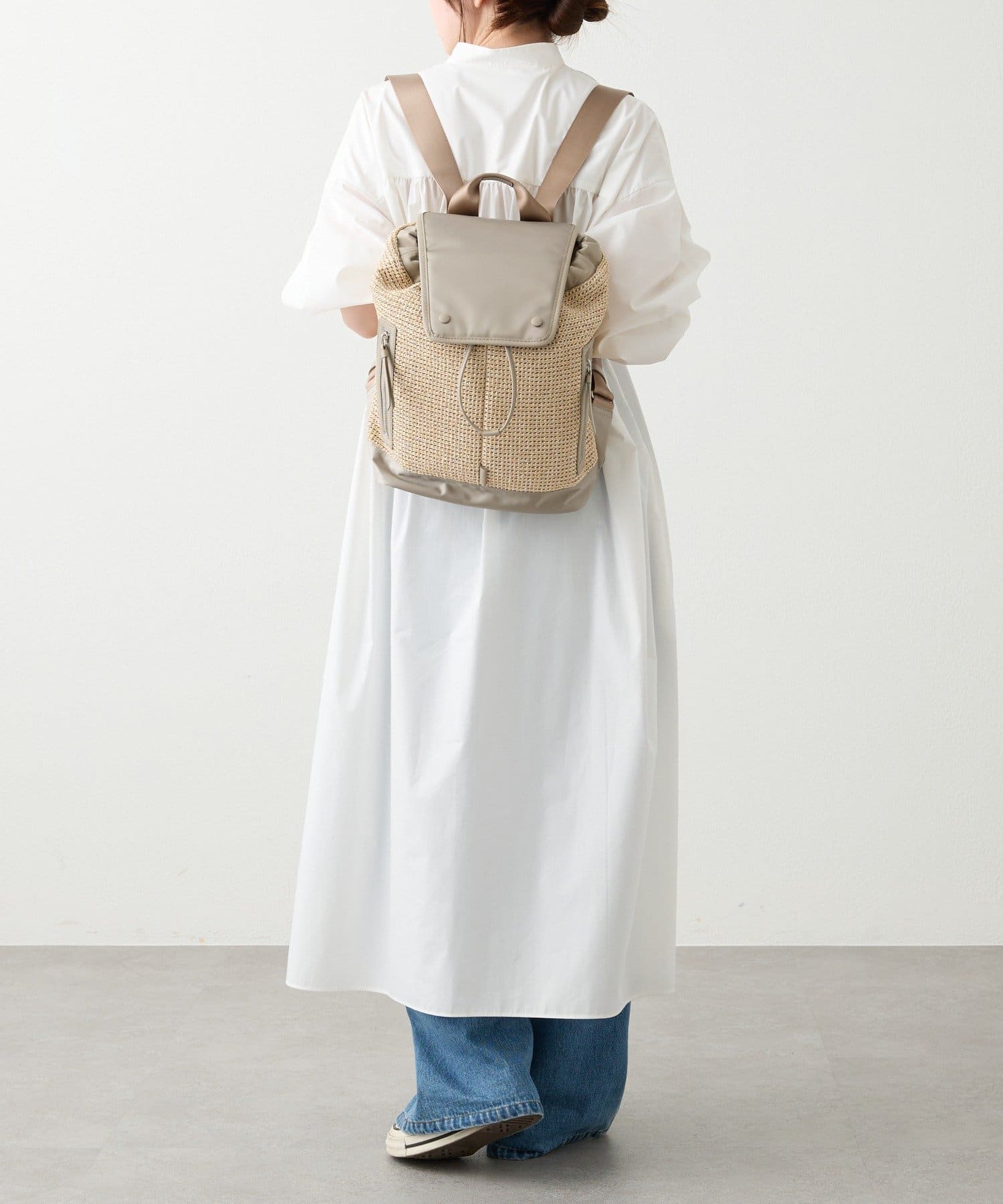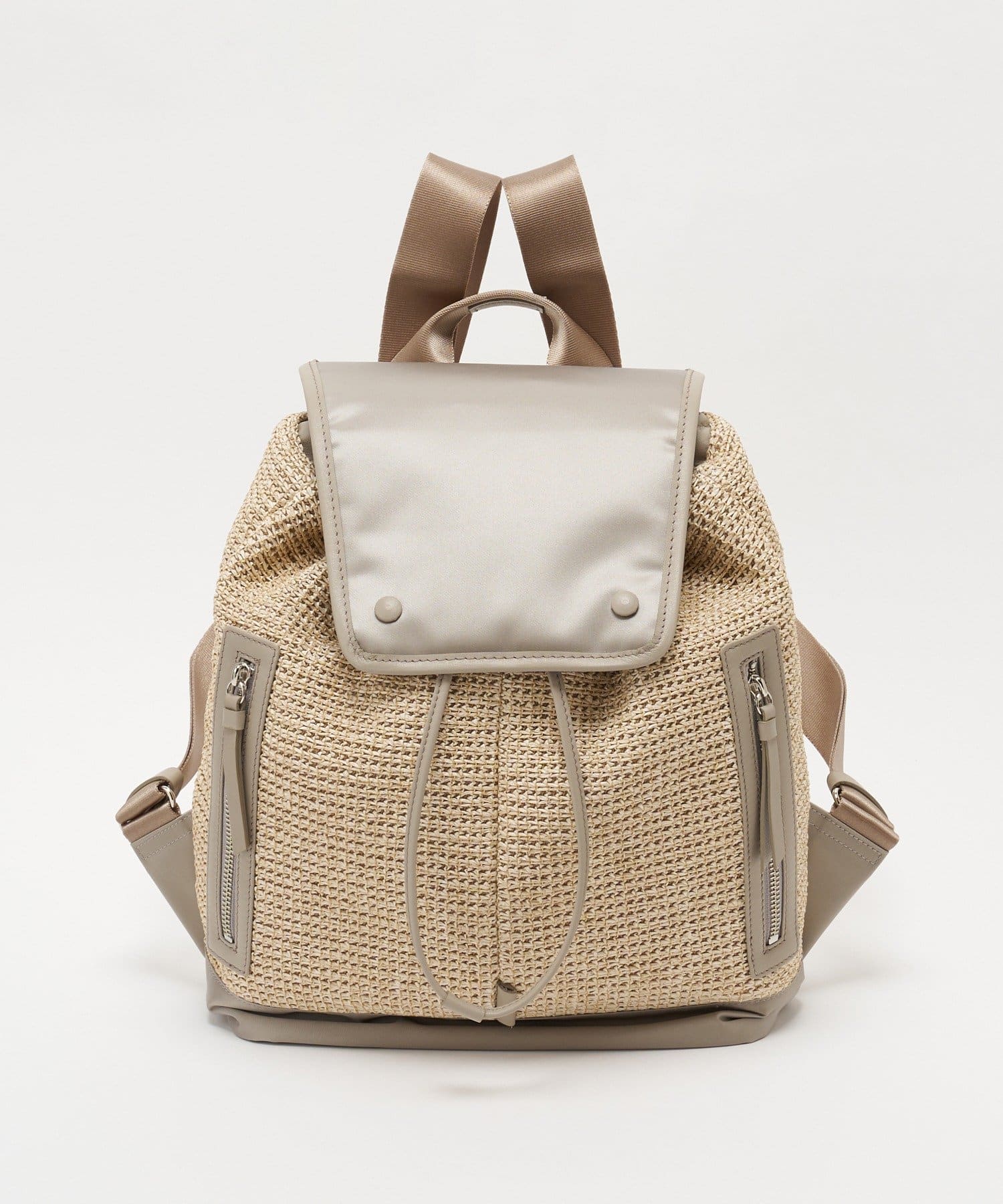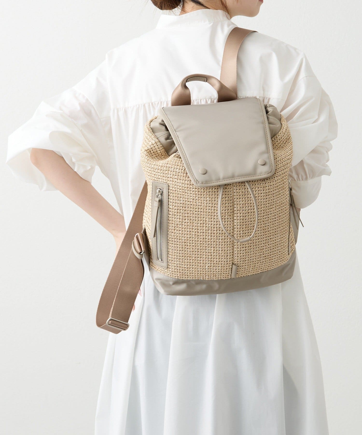 ナチュラルなラフィアの表情に、機能性素材を掛け合わせたコンビリュックサック。