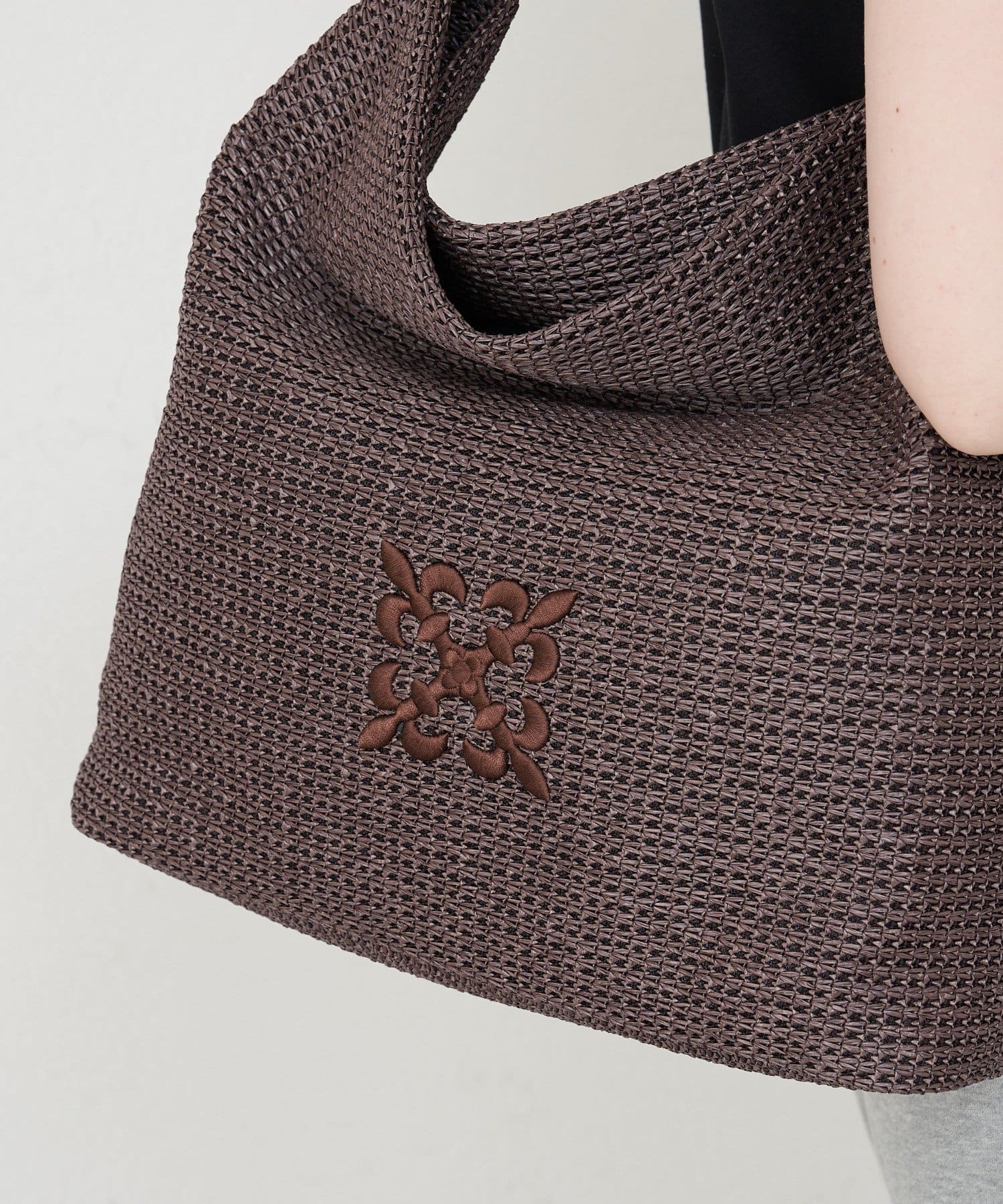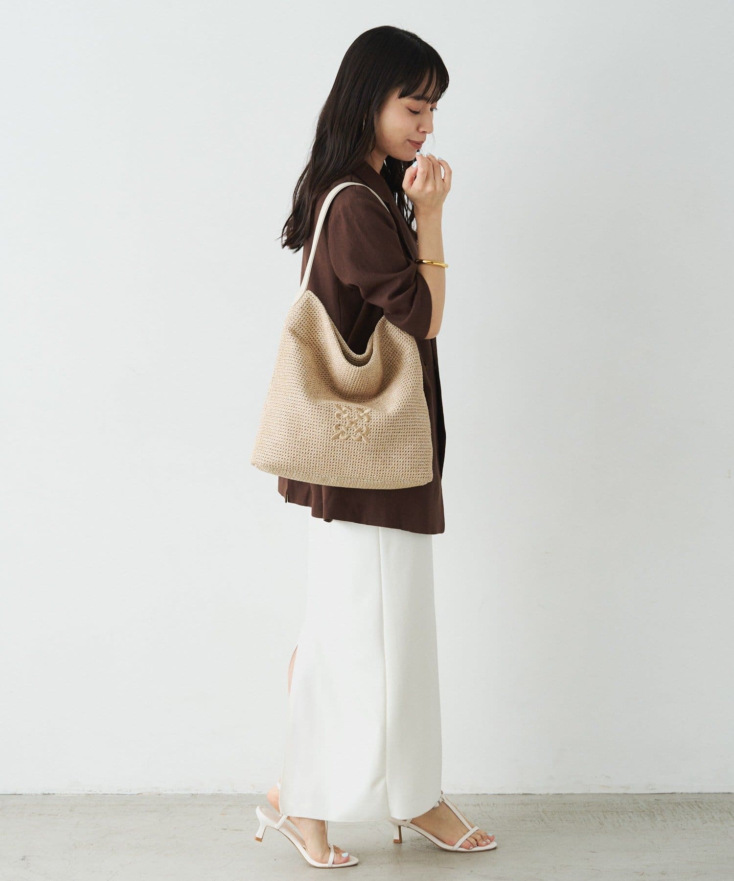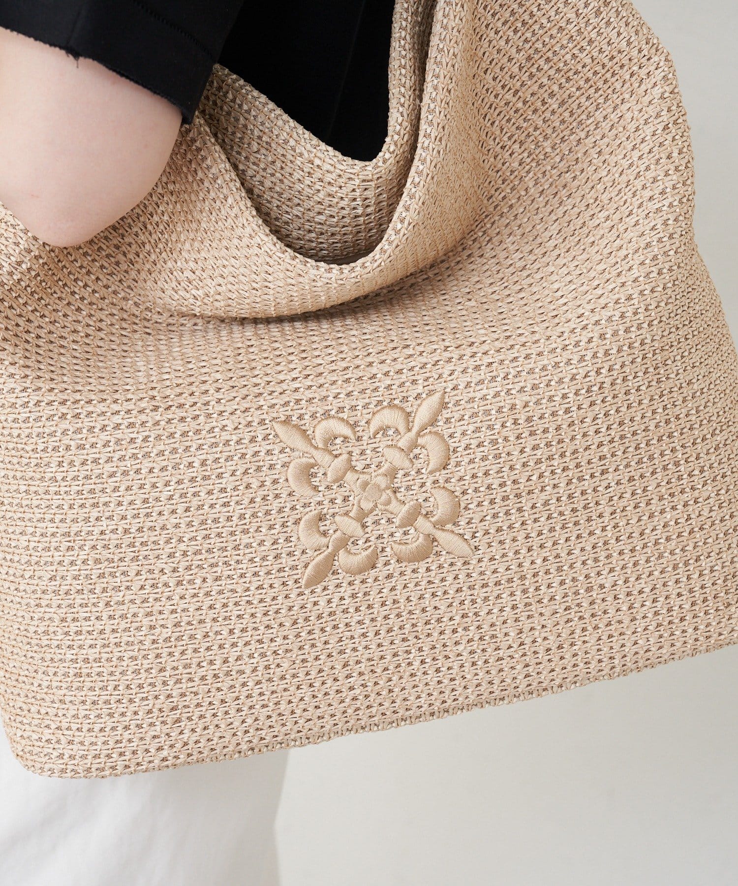 金具を使わないミニマルな設計で、ナイロンラフィアの風合いをより際立たせています。