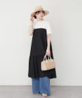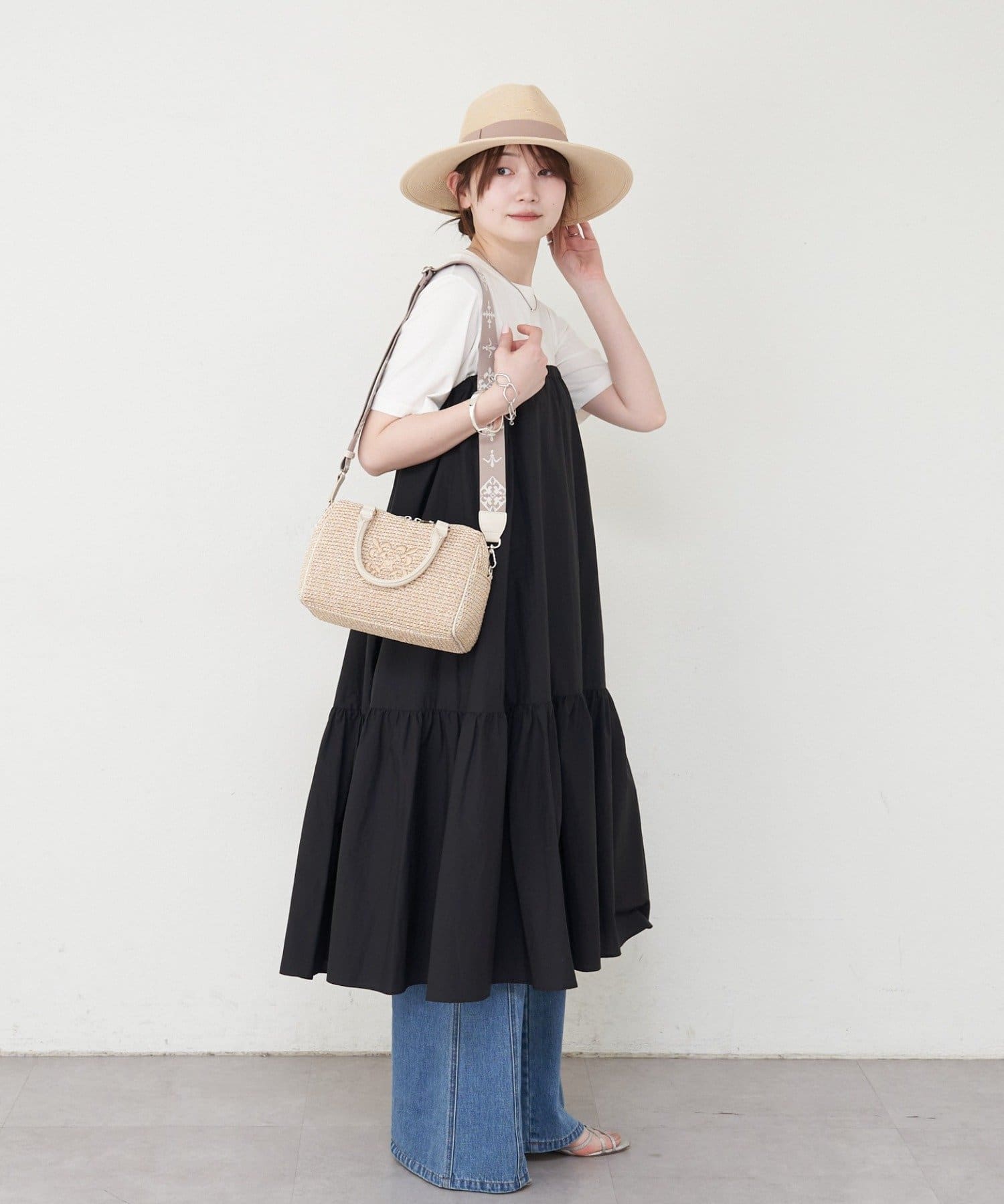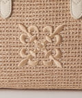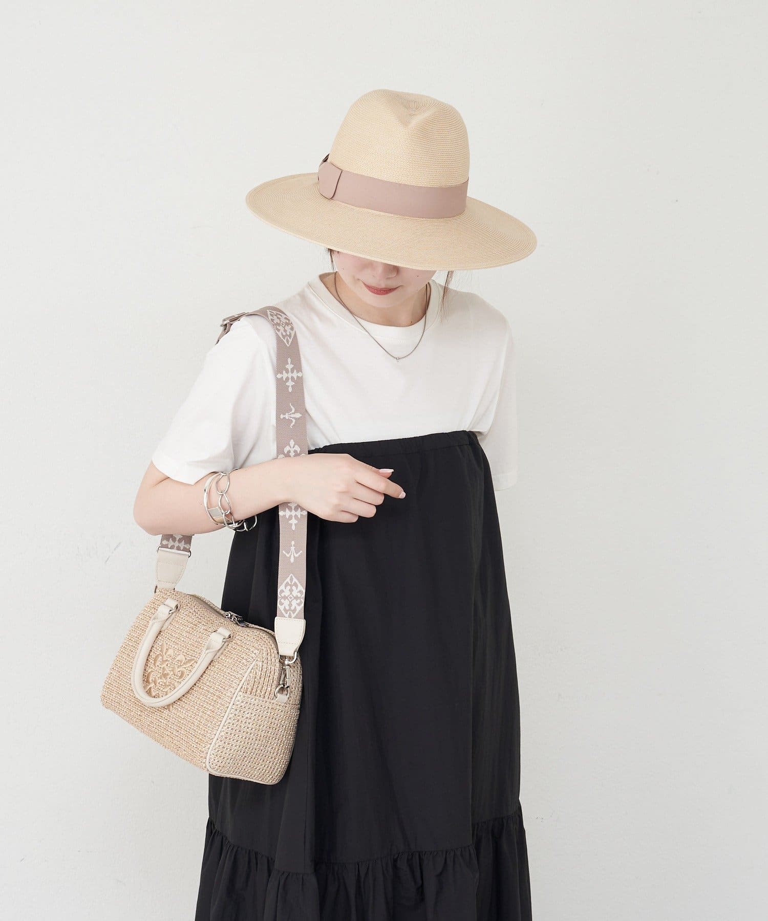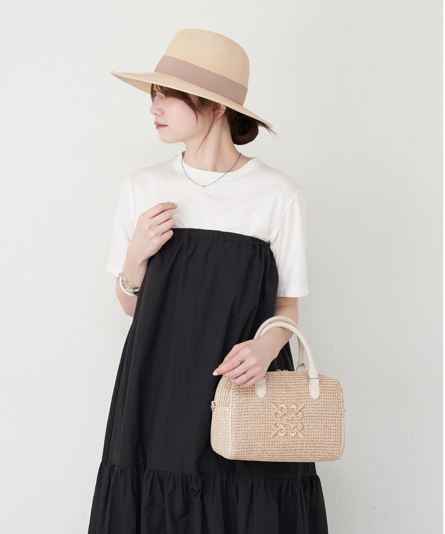 ラフィアの素材感にレザーパーツを組み合わせ、カジュアルさの中に上品さを添えたデザインです。