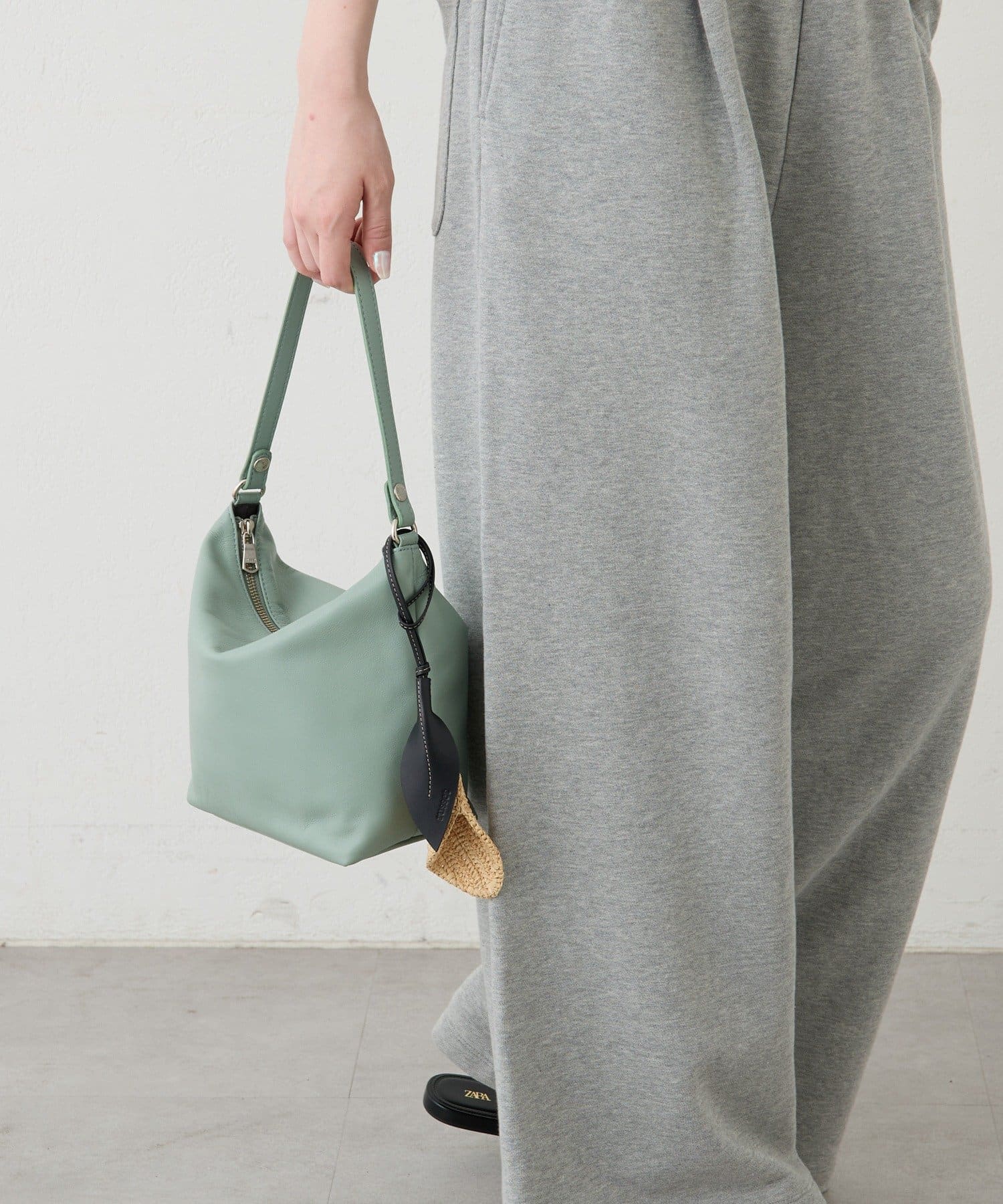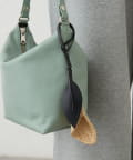 ・レザーバッグのハンドルに添えて、異素材ミックスの質感をプラス