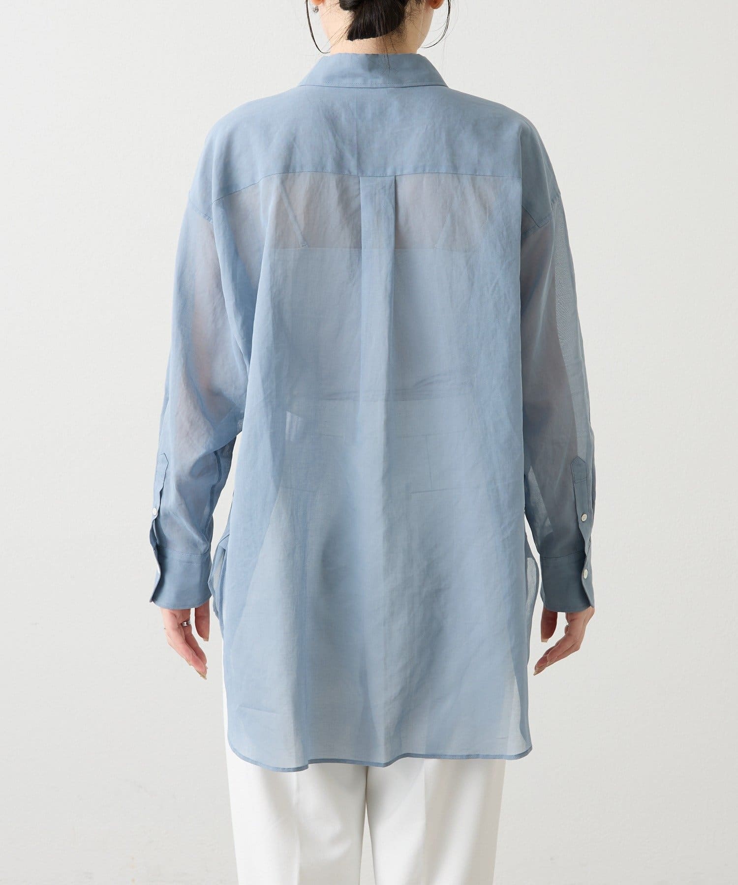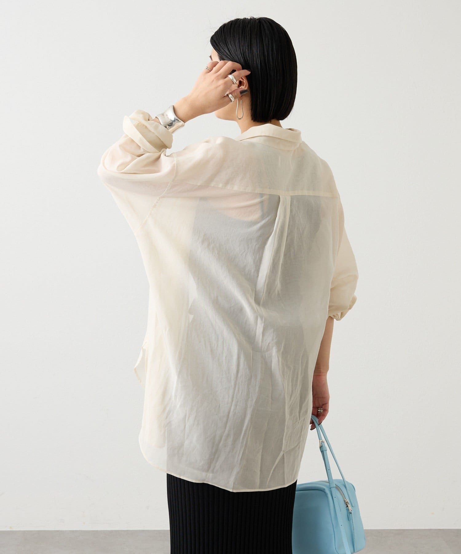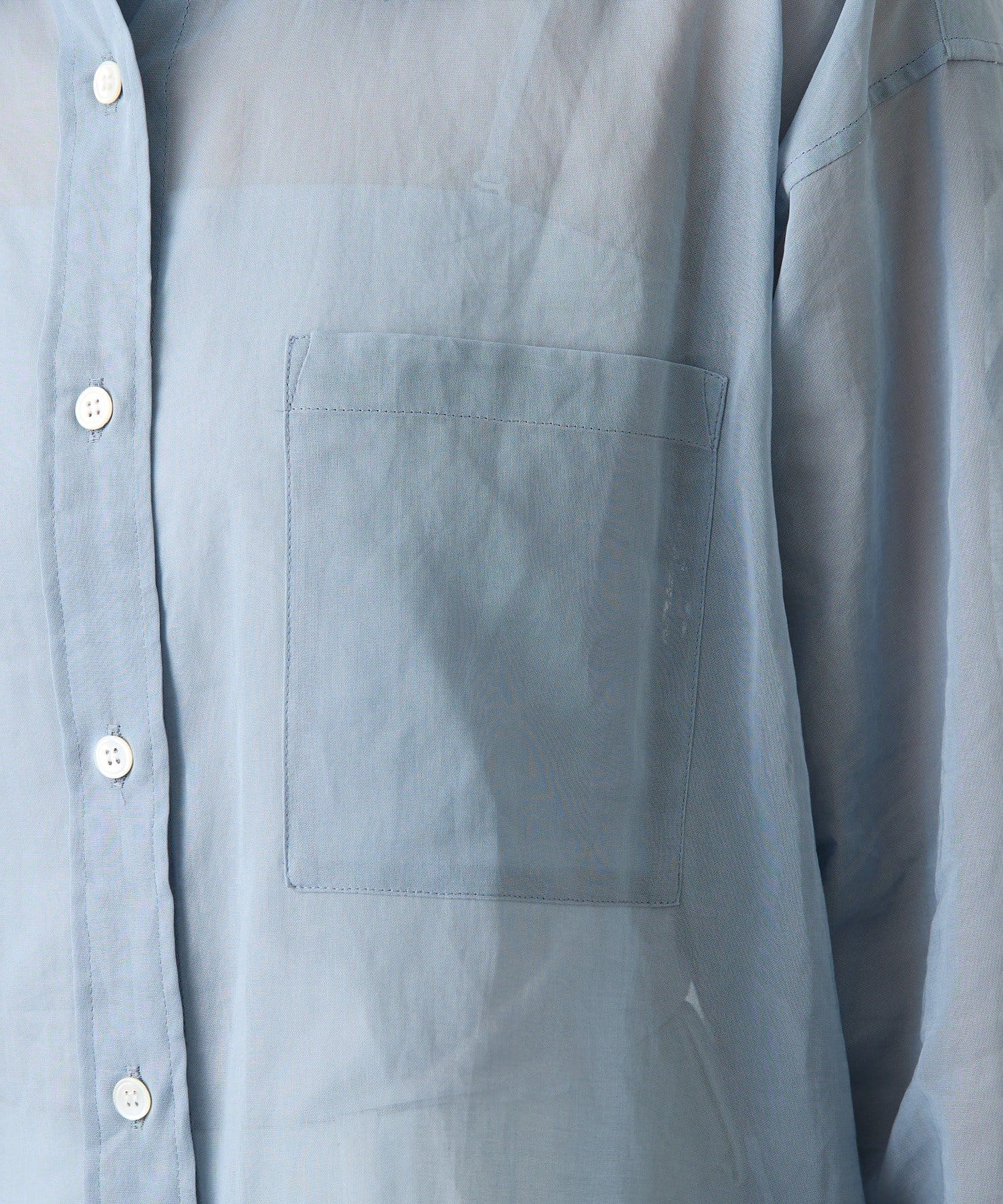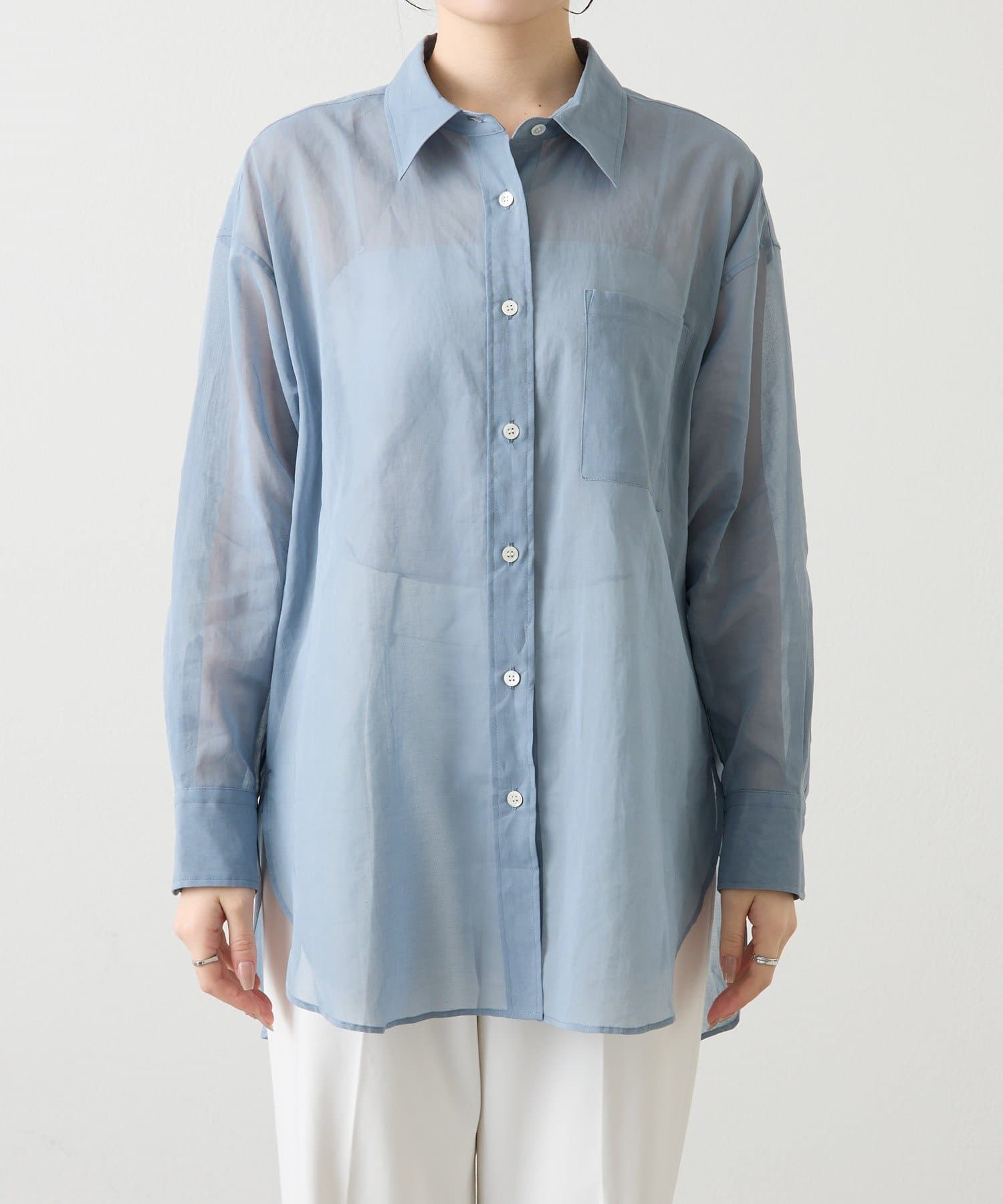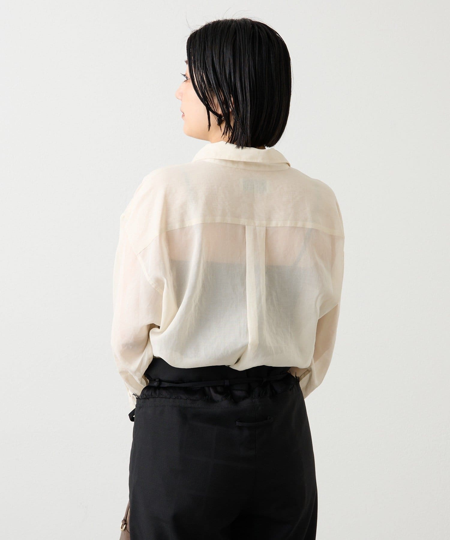 適度なハリと透明感をもたせた、オーバーシルエットのシアーシャツ。